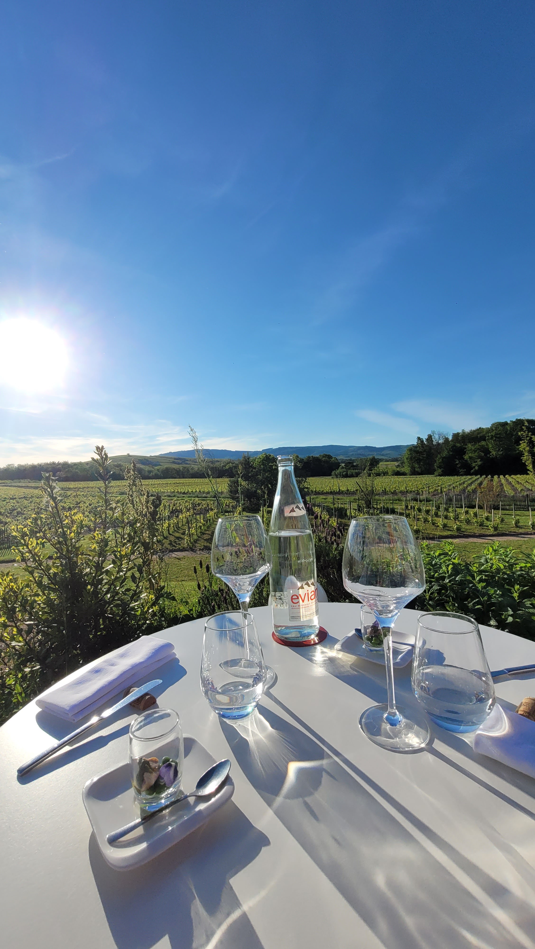 Une étape très gourmande, avec de beaux plats raffinés et visuellement étonnants ! Très bien accueillis et servis avec le sourire, sur une terrasse ombragée dominant de belles vignes à perte de vue.