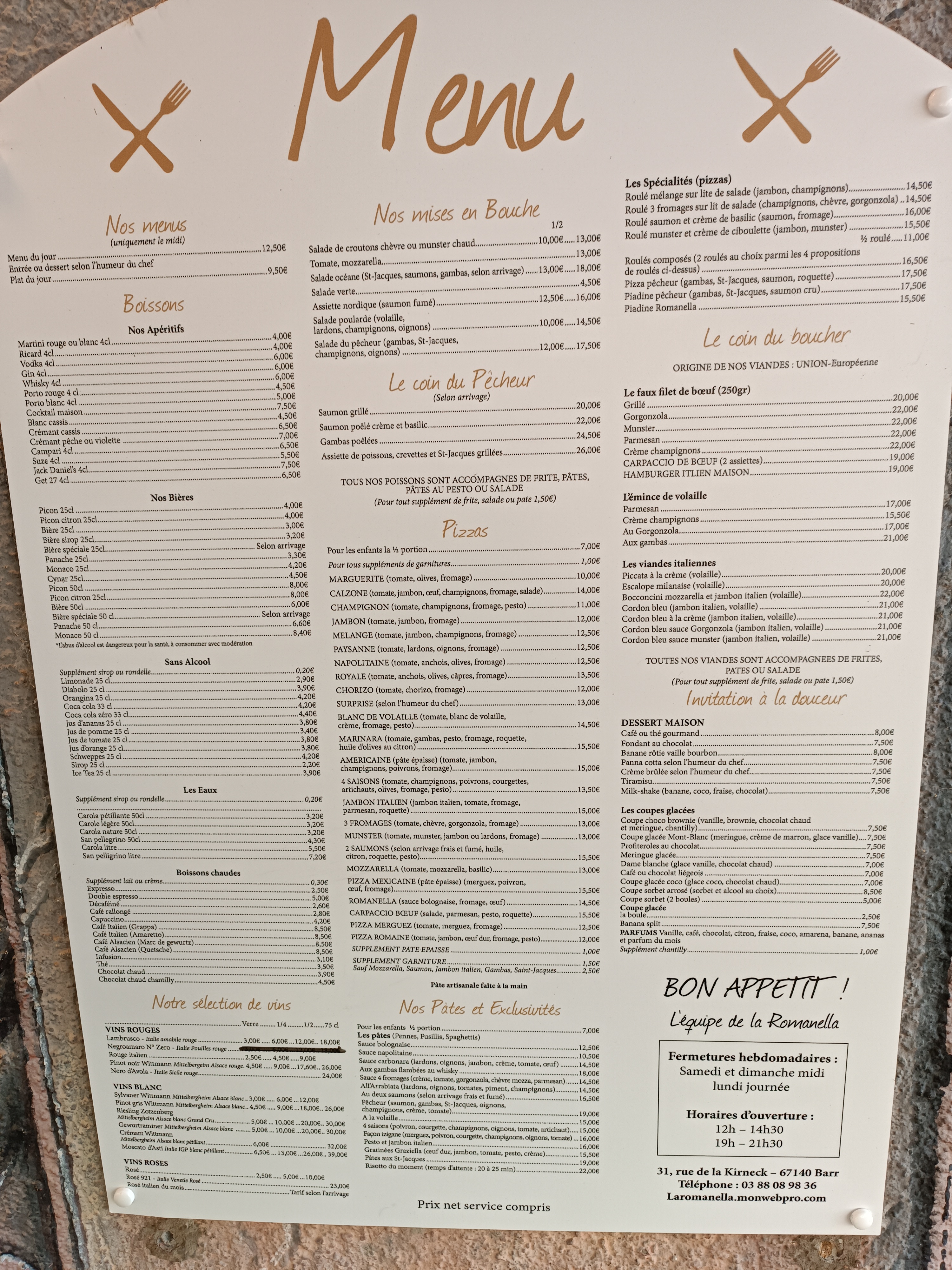 Très bon resto italien a barr ( le dernier) Très bon service , sympa et agréable , toujours ! Jolie terrasse a bord d'un petit court d'eau ! Un peu déçu de la diminution des tailles des pizzas par contre malgré qu'elle reste bonne ! Sinon tous est bien ! Pizza surprise pour notre part en général mais cette fois ci déçu peu de garniture dessus 😬 , donc ça dépend surment des restes lol , mais rarement déçu !