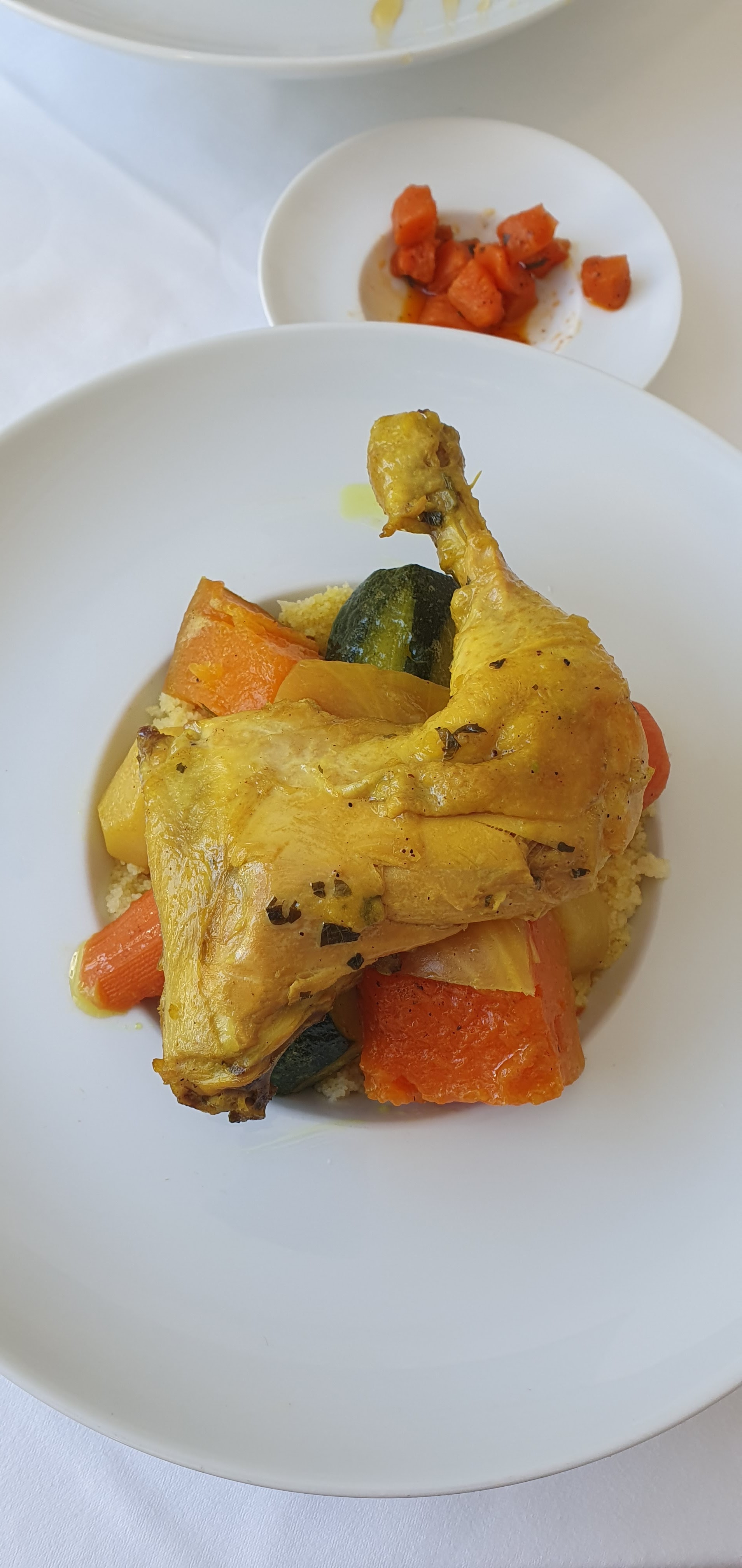 Couscous type cuisine nouvelle ce qui n est vraiment pas l attendu pour ce type de cuisine . Tres peu de légumes et semoule que ce soit couscous ou tajine. . Et comme vous n en avez pas suffisamment le supplément est payant. Le cadre est simple et agréable servi sur des nappes blanches mais ne rattrape pas ce que vous avez dans l assiette.