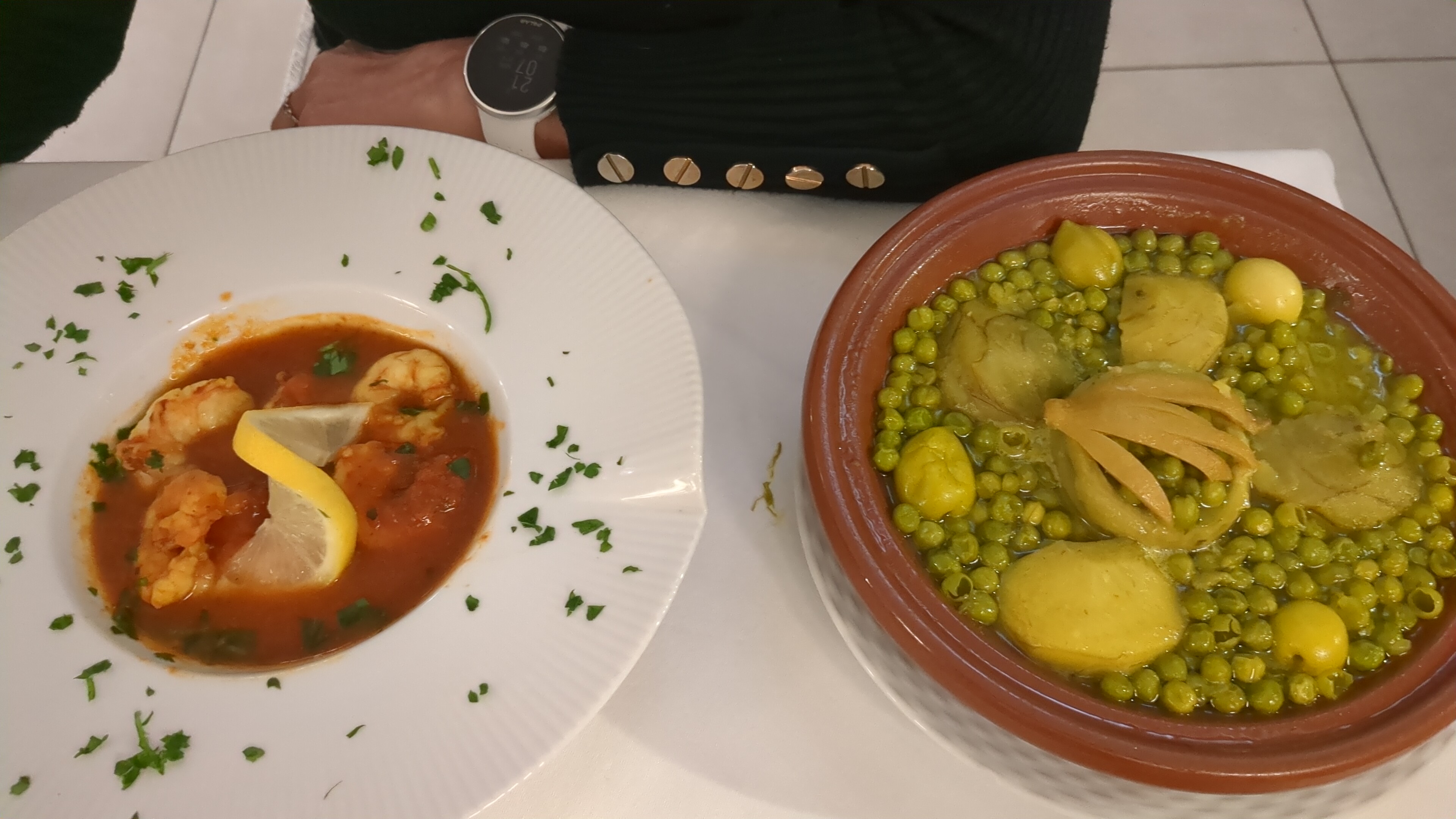 Il y a beaucoup à dire, Les tajines sont fades le poulet sans goût ainsi que la sauce, les crevettes à la sauce tomate aucun goût ! Il n'y a pas d'épices pas de cannelle, c''est fade !! Aucun goût !! Revoyez vos plats et mettez de la musique du bled, ça égaye et évite d' entendre la conversation des gens