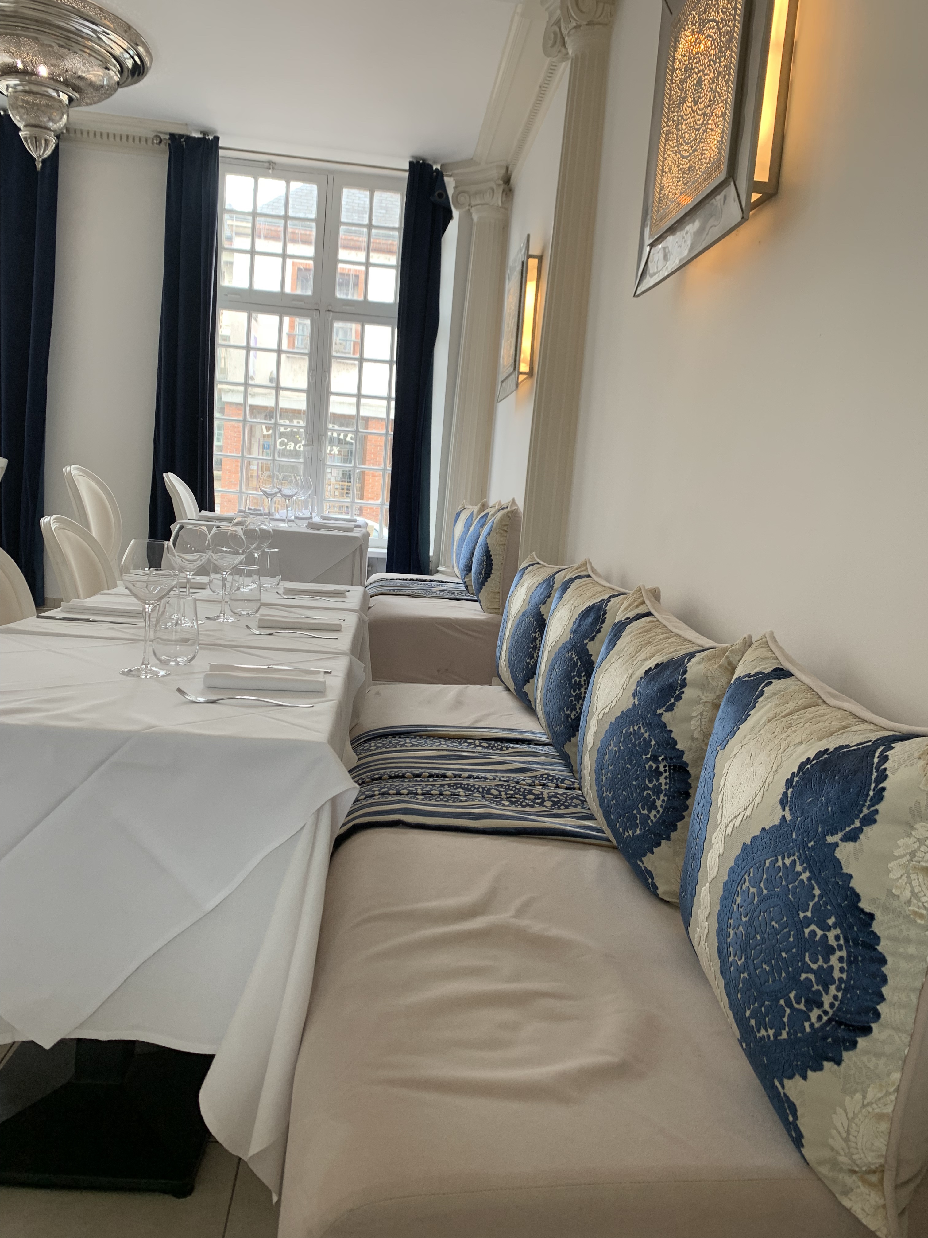 Voilà 3 fois que nous venons dans ce restaurant dont la première fois peu de temps après l'ouverture. Durant le confinement nous avons acheté à emporter. Lors de nos deux premiers dejeunes nous avons été charmés par l'accueil, la patronne très accueillante, souriante et soignée sur elle. Le restaurant est très bien aménagé et décoré selon la tradition marocaine. Tout était soigneusement propre, les nappes tirées et les assises très propres. Quant à la nourriture et la présentation dans assiettes c'était délicieux. Alors que nous y revenons aujourd'hui, quel déception, l'accueil pas à la hauteur, une serveuse peu soignée sur elle et pressée de finir son service. Pas du tout à l'image du restaurant. La patronne n'était pas là ce samedi. Nous avons pris feux menus à 34.90 euros qui ne les valaient pas. Pour commencer mon mari avait un moucheron dans sa coupe de champagne, sur le côté de mon assiette de crevette à la marocaine un cil. Les crevettes étaient congelées et sèches. La semoule du couscous trop cuite donc collante. Quand à la propreté de la banquette c'était sale et des raisins et semoule au sol. Nous sommes vraiment déçus et n'y reviendrons pas. Dommage