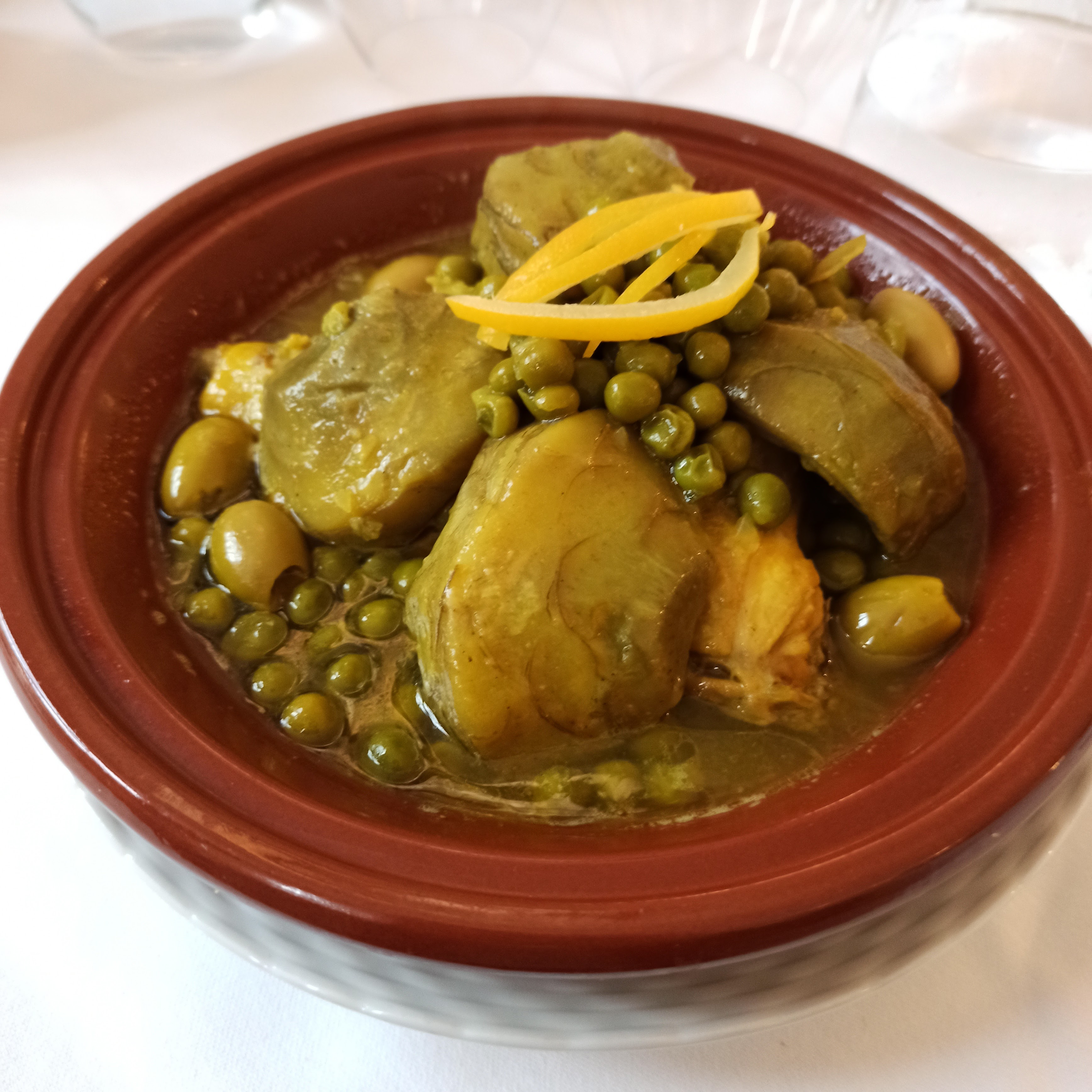 Tajine citron confit c'est une cuisse de poulet avec 10olives et un quart de citron et zéro légume. Le tout hyper salé Heureusement j'ai pû demander de la semoule à 3 euros 50 l équivalent de 3cuilleres à soupe,avec deux jets de poudre d'épices dessus !!! Pas un raisin sec....pas coriandre bref si vous avez faim et que vous avez l'expérience des coucous et tajines vous allez être surpris de cette formule minimaliste avec rapport qualité prix outrageant. La cuisse et un verre de vin gris et hop 25euros. Tajine sans légumes c'est un affront aux traditions orientales! Je préfère aller à Briare chez Marie Claire grillade. Là au moins on mange tajines et coucous réels dans la convivialité et un décor traditionnel et travaillé. Si vous avez faim, passez votre chemin