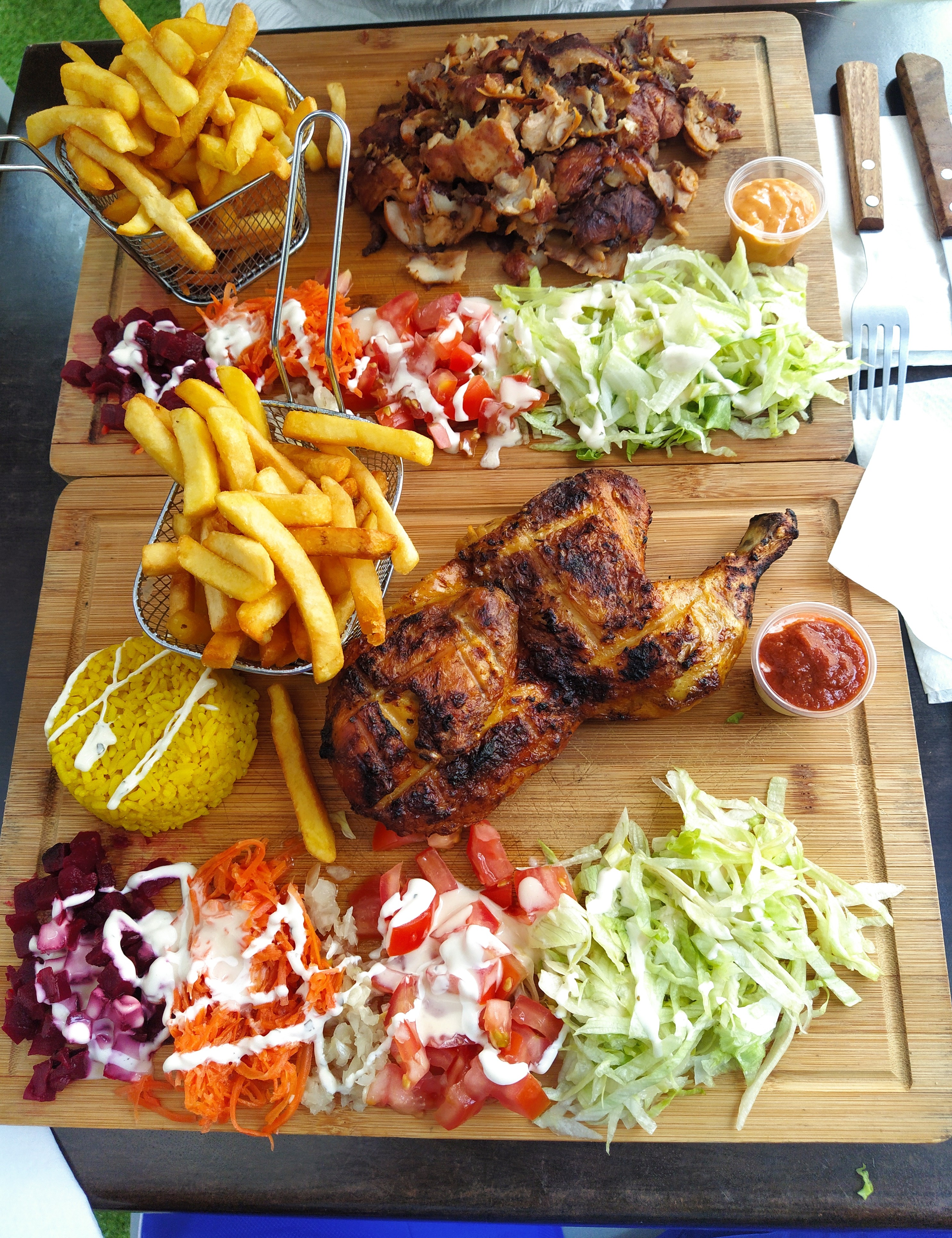 Du poulet 🍗 succulent cuit au feu de bois différent poulet entier ,demi ,brochettes et de viandes aussi accompagnées de bonnes frites maison ou un bon riz assaisonné 🤗😋