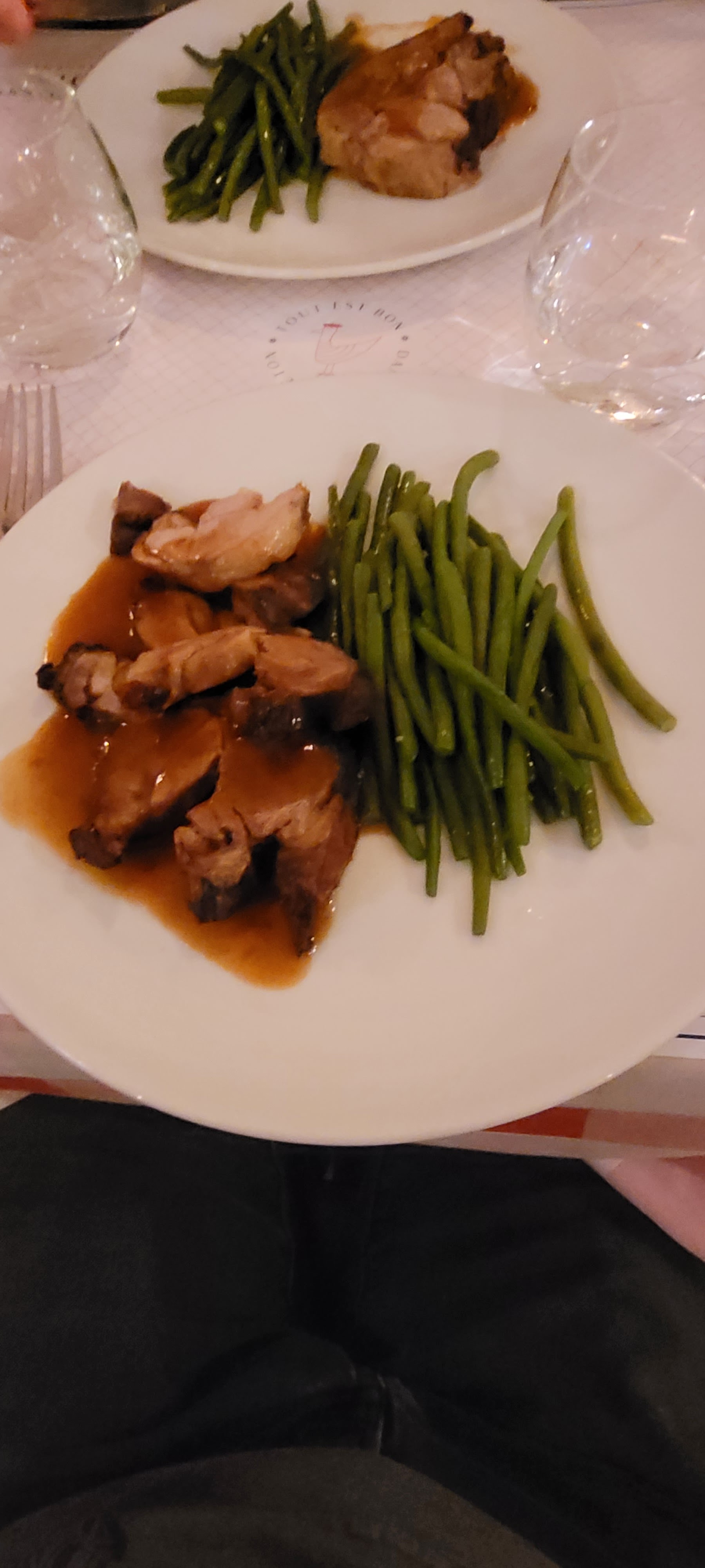 Service haut de gamme et nourriture encore meilleure. Ça vaut le prix, nous avons eu le canneton pour deux servi en deux services, le demi poulet pattes noires (ils nous ont même donné une portion supplémentaire de jus de rôtissage !!) et le demi canard croisé de Challans. Nous étions tellement rassasiés à la fin que nous n'avons même pas pris de dessert. Leur pain est également excellent. À mon avis, le canneton était le meilleur alors allez-y à deux.
