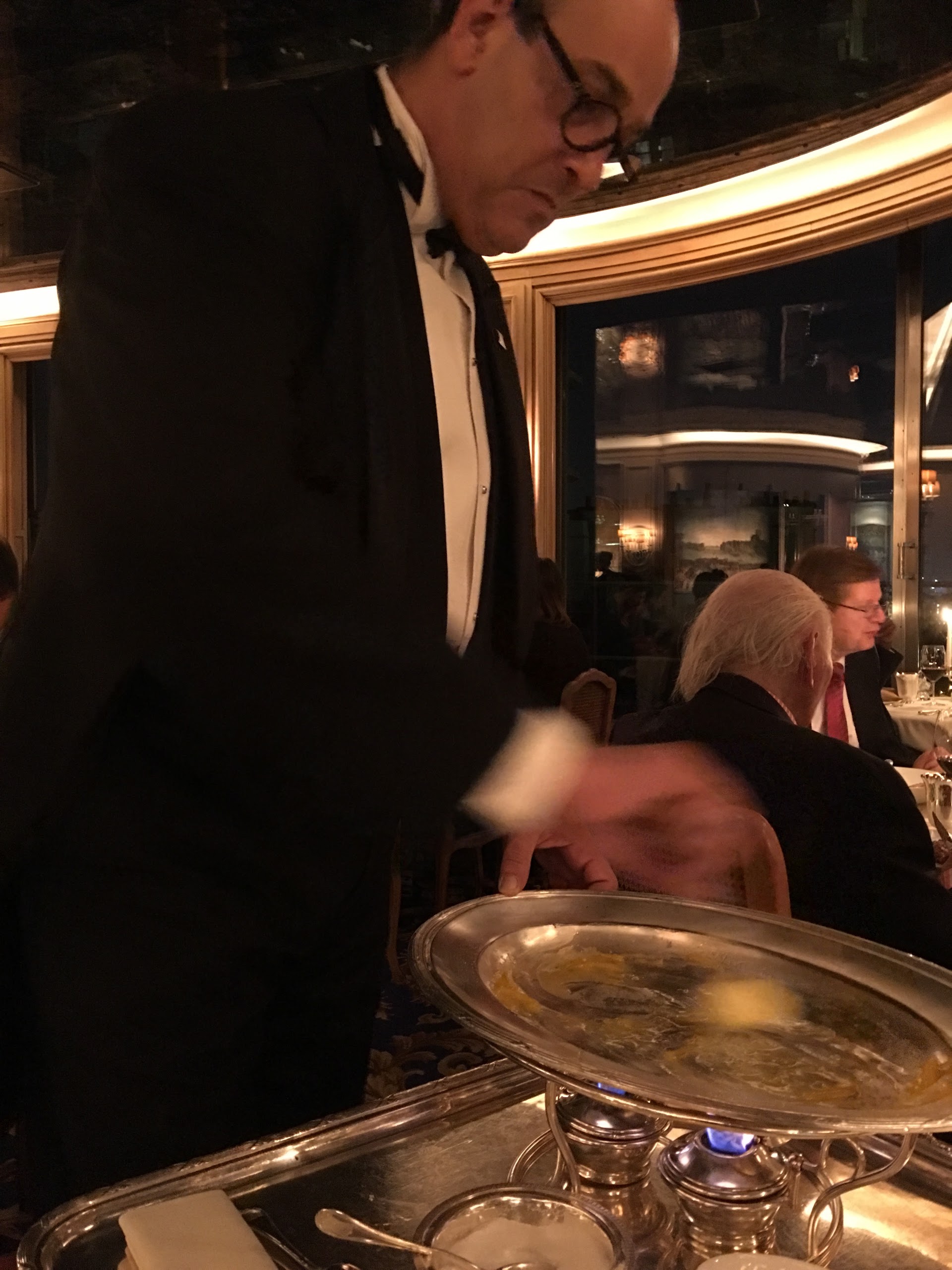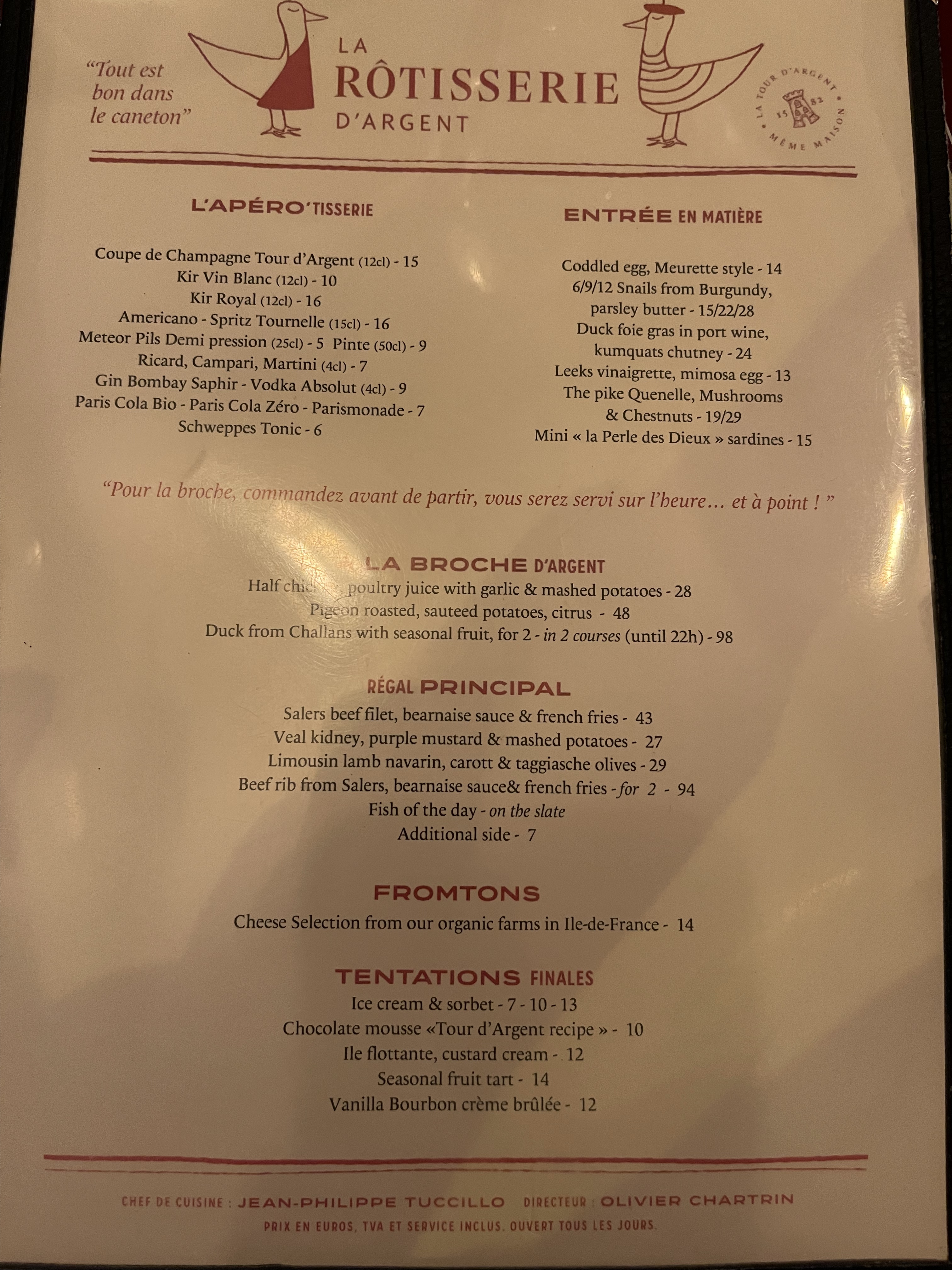 Comme toujours, déjeuner à la Tour d’Argent est une expérience privilégiée de la vie parisienne. L’élégance, l’espace et l’esprit du lieu permettent d’apprécier pleinement la cuisine ainsi que la convivialité de la compagnie réunie. En tant que personne âgée depuis des années au-delà d'une véritable capacité à digérer un repas aux proportions lucullanes, je préférerais une sélection plus modeste à la carte, mais c'est une petite réserve face à tant de plaisir.