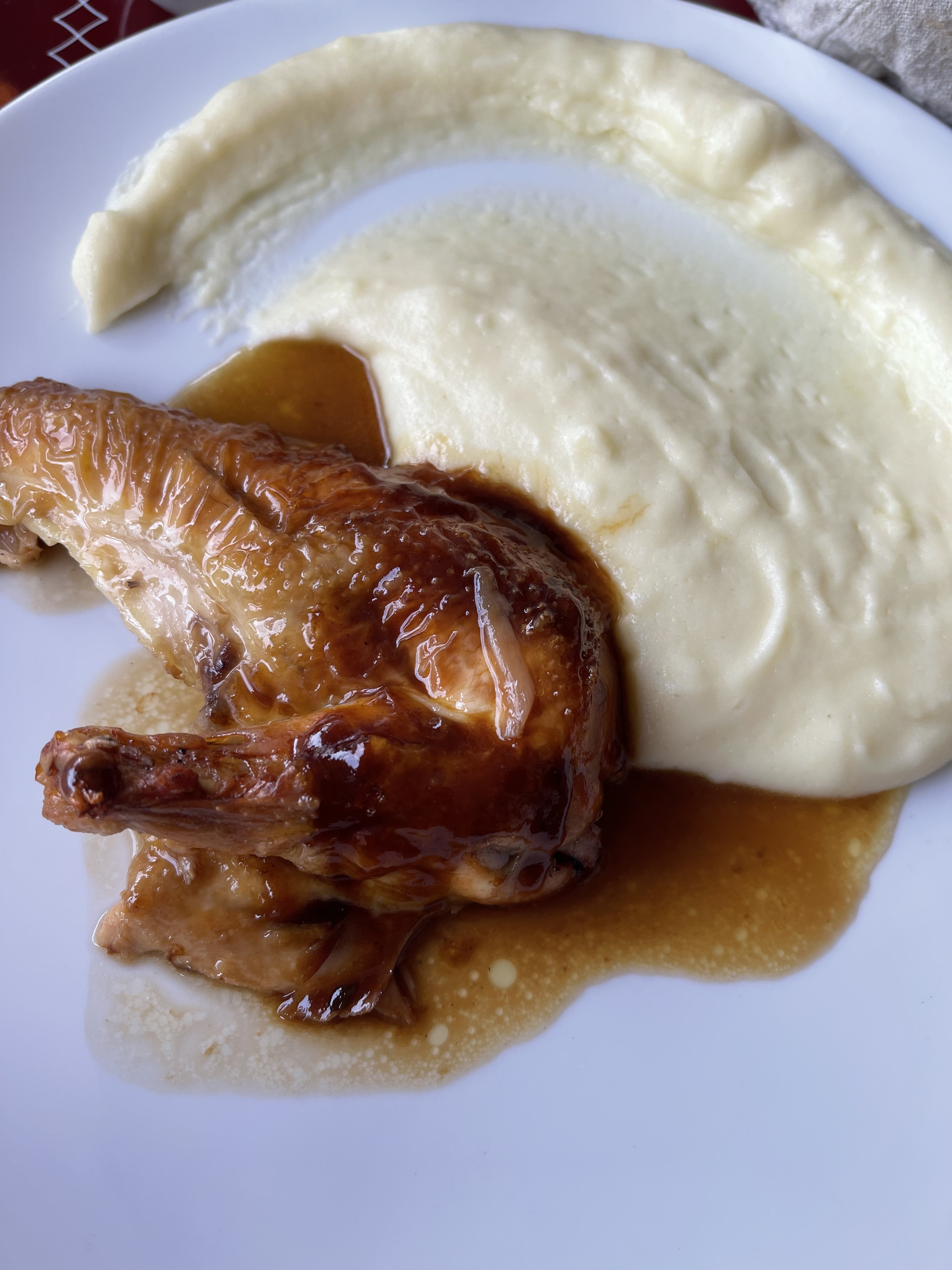 Excellente recommandation de vin et poulet incroyable et purée d'ail au jus.