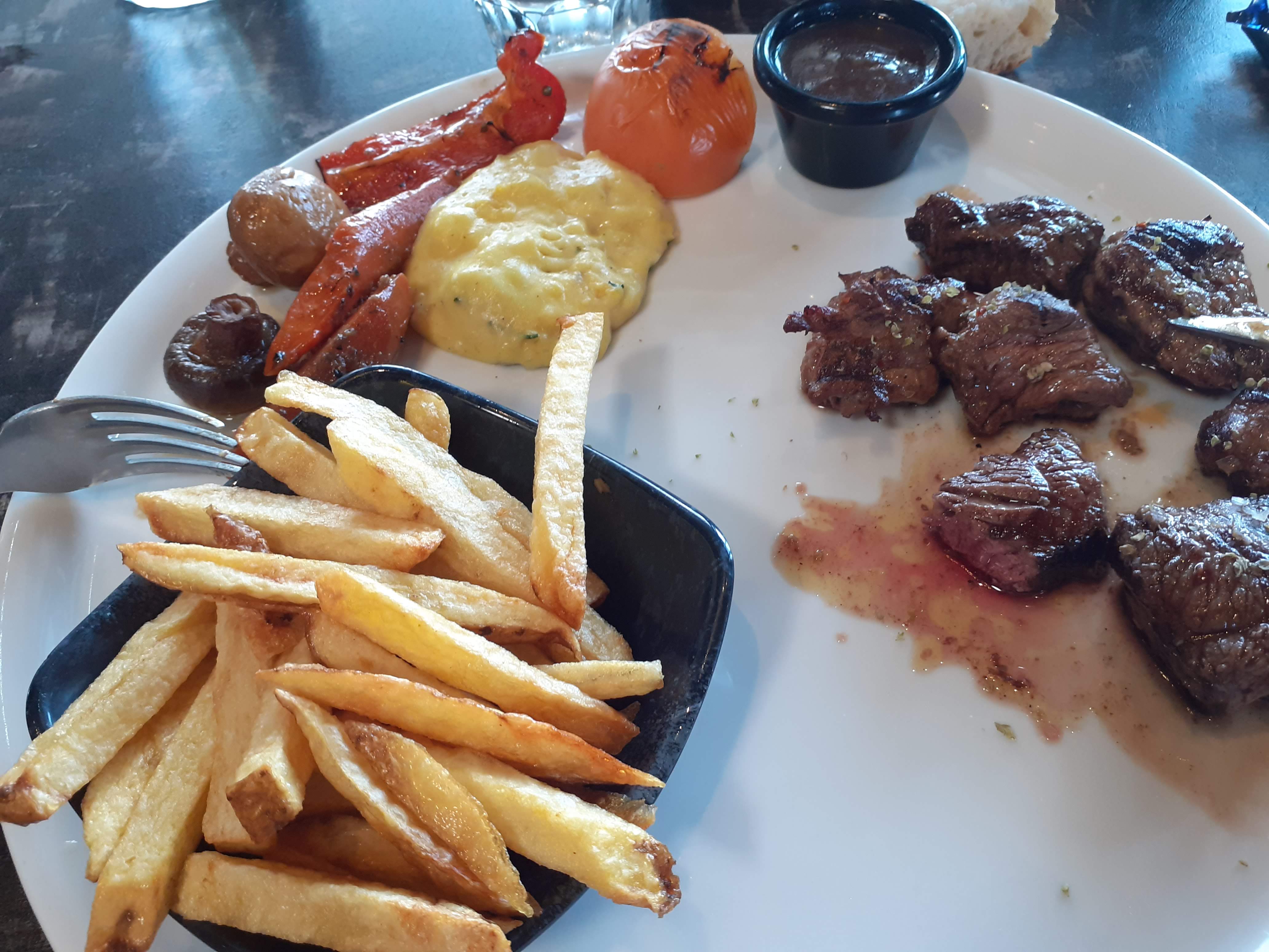 Très bon établissement pour les amateurs de viande. Mon choix s'est porté sur les brochettes de boeuf marinées (2 brochettes de boeuf et une brochettes de légumes) le tout servis avec des frites. C'était au delà de mes espérances. Un excellent moment passé entre amis !