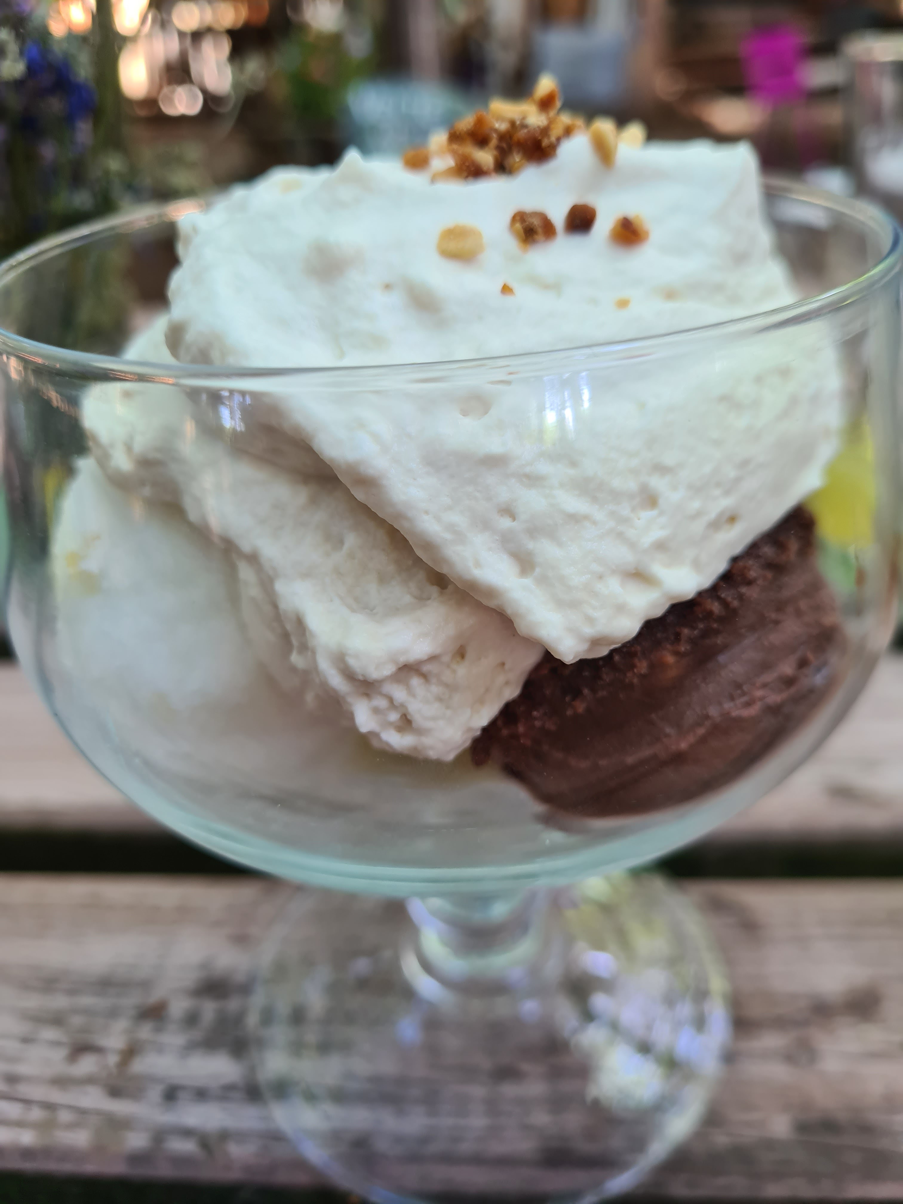 Repas fantastique, tranche de tourte à la viande, salade et légumes. Désert 3 boules de glace, chocolat, citron et vanille avec chantilly maison. Et du café super fort pour finir. Le tout délicieux dans un coin salon extérieur réfrigéré. Super sympa et service excellent.