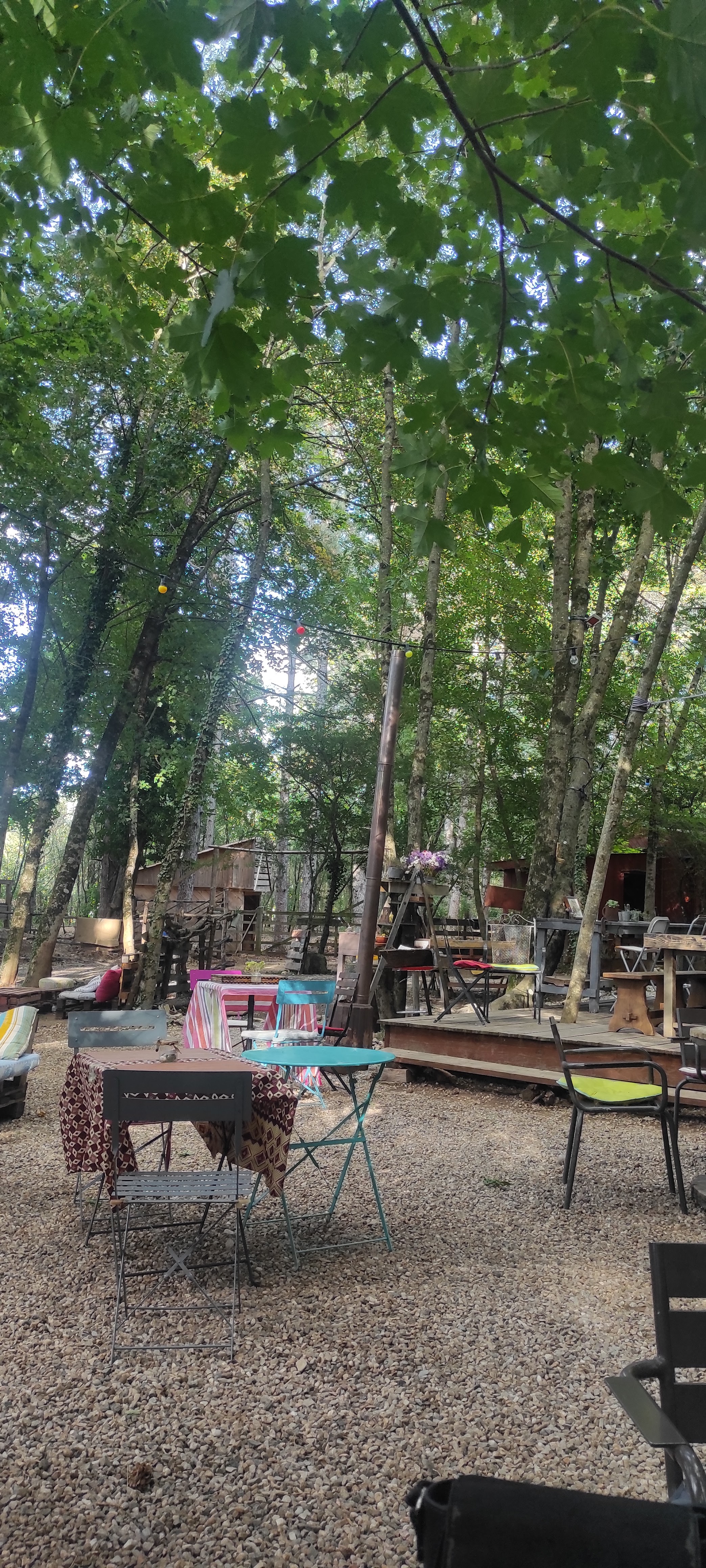Un havre de paix, dans une clairière fraiche et ombragée. Impression d'entrer dans un salon de jardin : cabanes et animaux, déco entre vintage et babacool, tables, bancs et banquettes invitent à se poser pour une sieste ou pour feuilleter un des nombreux livres disposés ici et là, et qui sont autant d'invitations au voyage... Accueil tres agréable, simple et discret, serein, sans chichi. Le chat du domaine, lui aussi bienveillant, nous accordera quelques contacts de bienvenue. Menu 100% fait maison, sain et gouteux (une tarte coco à tomber par terre !), et copieux... Bière artisanale fraiche et fruitée. Bref, comme une envie de reviens-y ! Peut-être à l'occasion d'un de leurs soirées concerts...