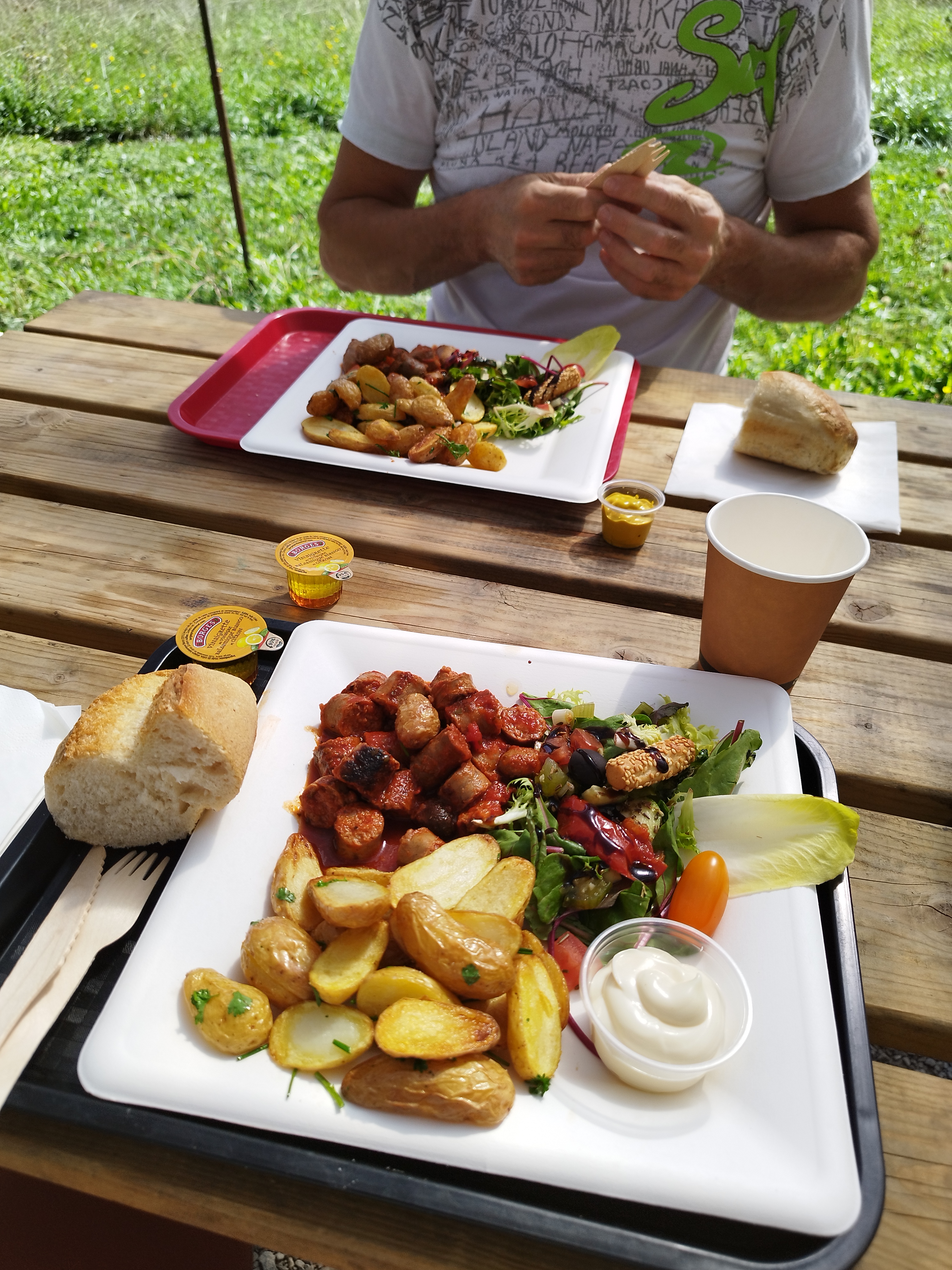 Pause déjeuner avec un plat du jour au top (saucisses du pays, pommes grenailles et petite salade composée). Très bon accueil. Cela change des snacks ou il n y a que sandwich ou Burger.
