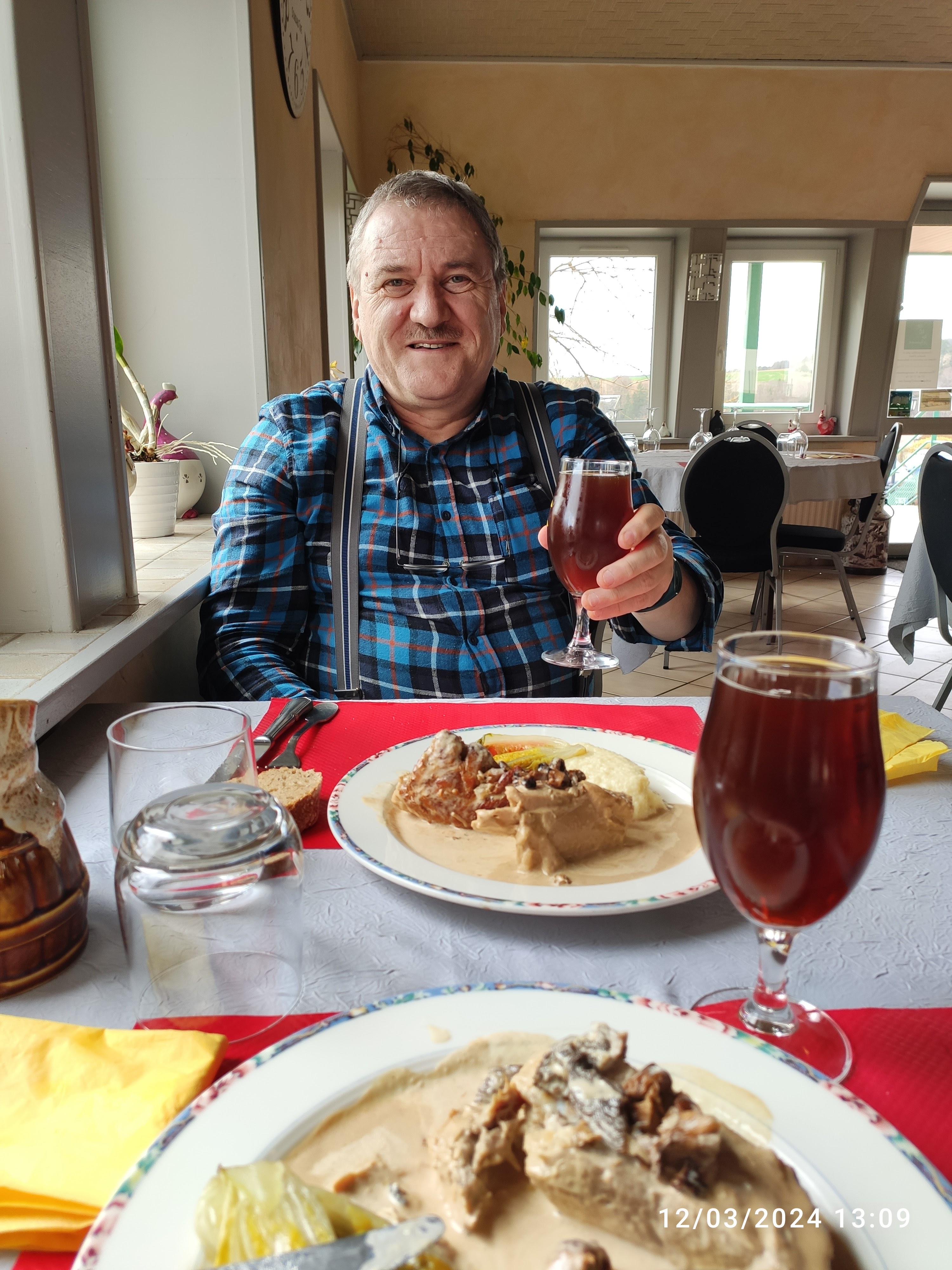 Parfait accueil, le Chef est cool et nous propose le menu du jour fort bien loti. Quiche lorraine magnifique accompagnée de verdure diverse, cochon de lait à la crème, endive cuite, purée, morille. Fromage blanc et crème. Et de sacrée portion! Sinon il y a de belles pièces de filet de boeuf.. énorme. Le week-end carte plus vaste, jugez-en. Photos jointes