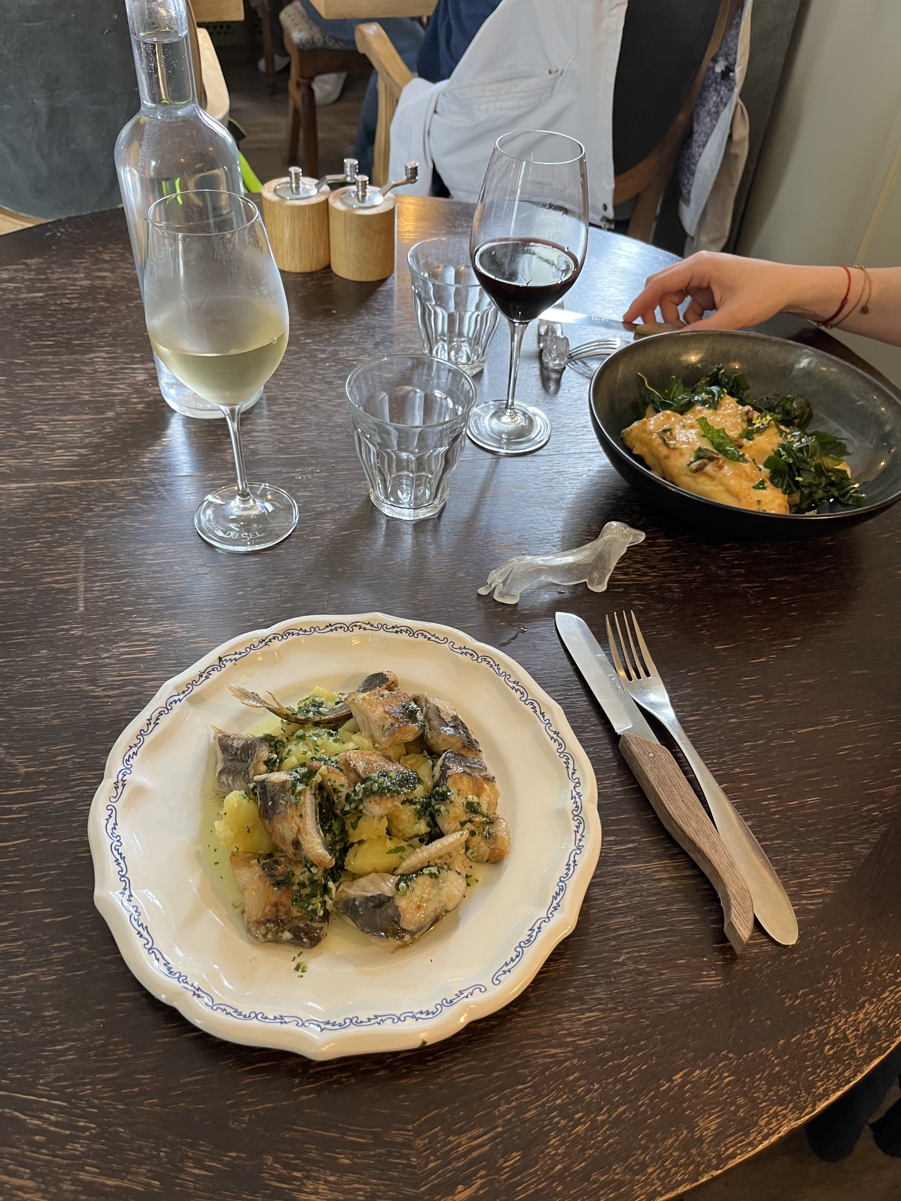 A 12h35, le seul plat de poisson frais, à l'ardoise du menu, n'est plus servi. Le serveur indique que la cuisine en prépare moins d'une quinzaine d'assiettes !!! Après, obligés de se replier sur des sardines grillées et des confits de canards (un rien secs) De plus, le service est assez long entre les plats ce qui n'est pas le plus grave. Comme vu sur d'autres commentaires, petit doute sur le fait maison