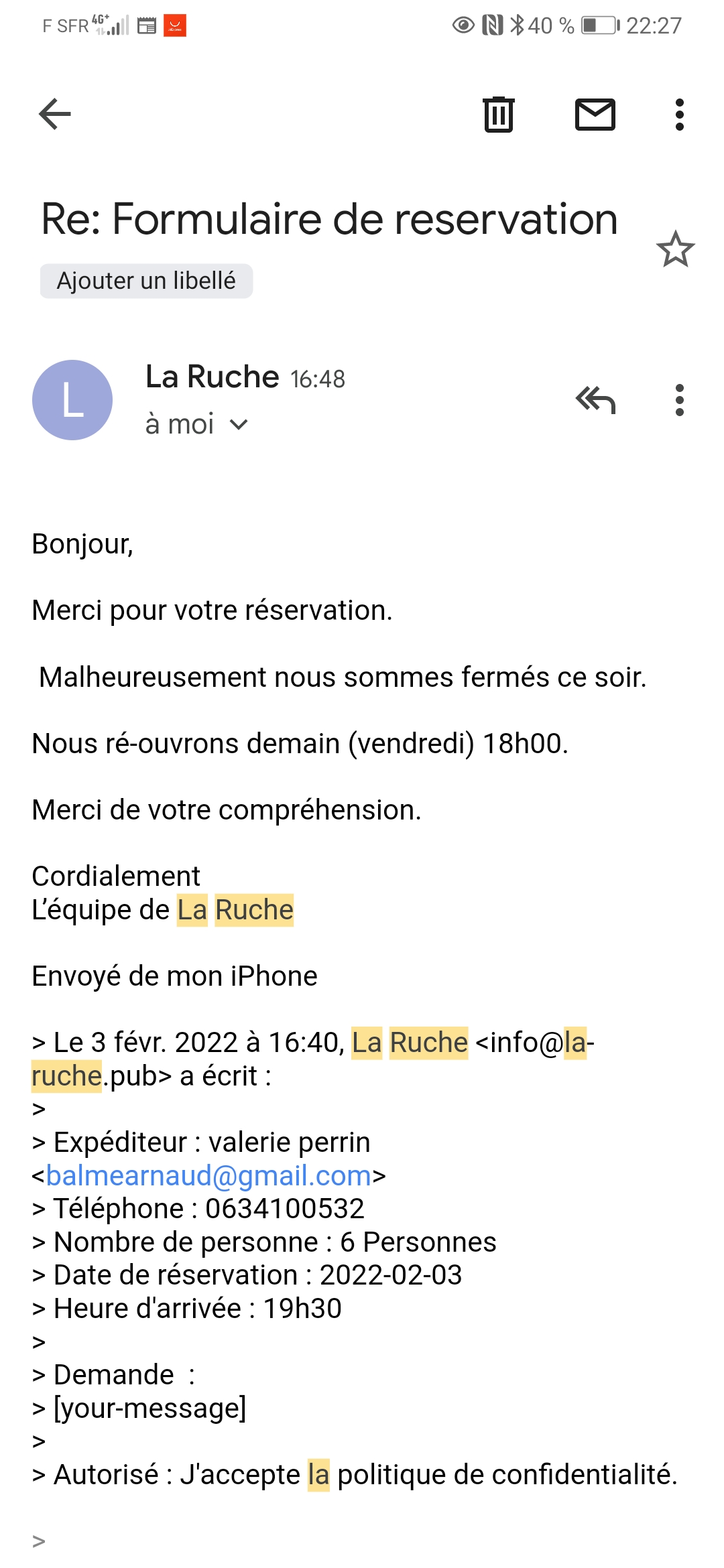 Voici la réponse suite à une demande de réservation pour fermeture ce jeudi or j'apprends que le restaurant est ouvert. Merci pour la crédibilité... Bonjour, Merci pour votre réservation. Malheureusement nous sommes fermés ce soir. Nous ré-ouvrons demain (vendredi) 18h00. Merci de votre compréhension. Cordialement L’équipe de La Ruche Envoyé de mon iPhone