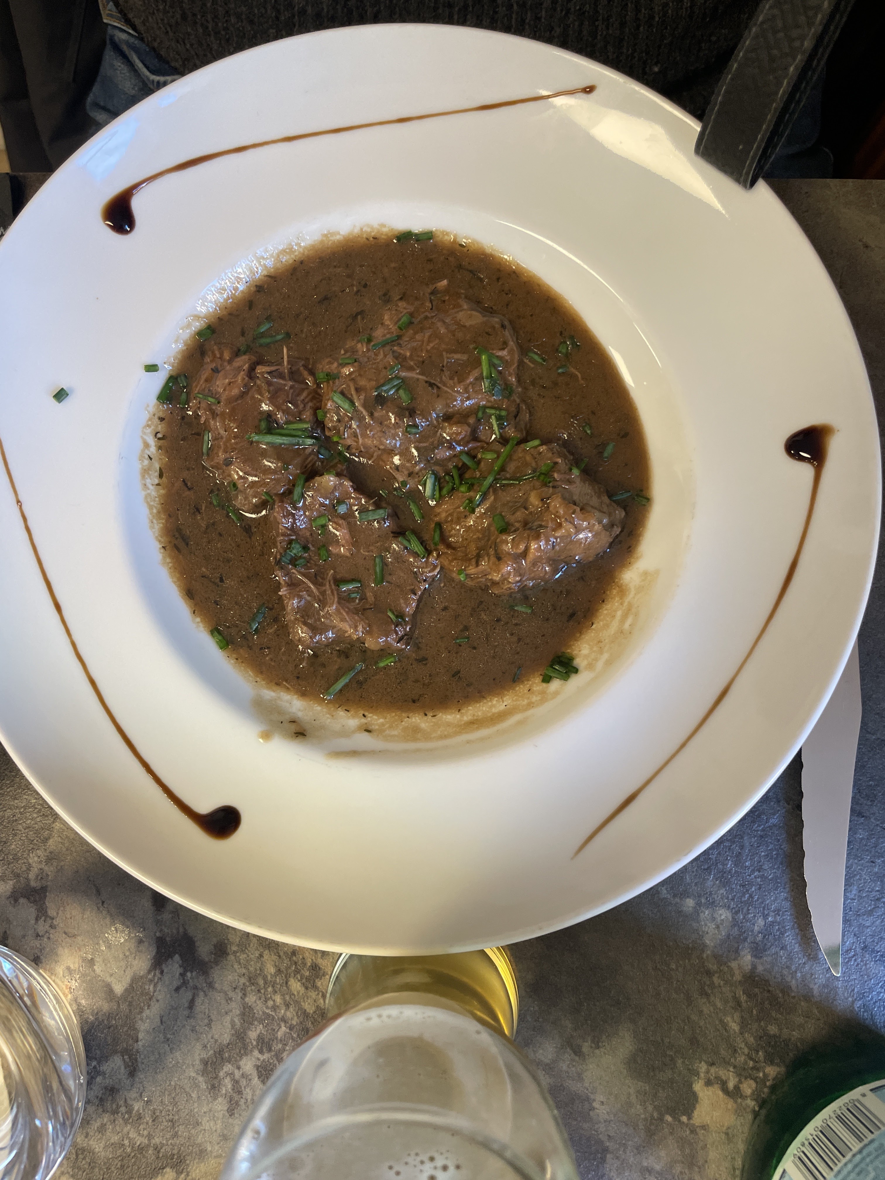 Boeuf bourguignon : première fois que je découvre un bœuf bourguignon si coriace Frites : arrivées marron foncé dans le plat, j'en ai mangé 4 que j'ai noyées dans la sauce de la viande.