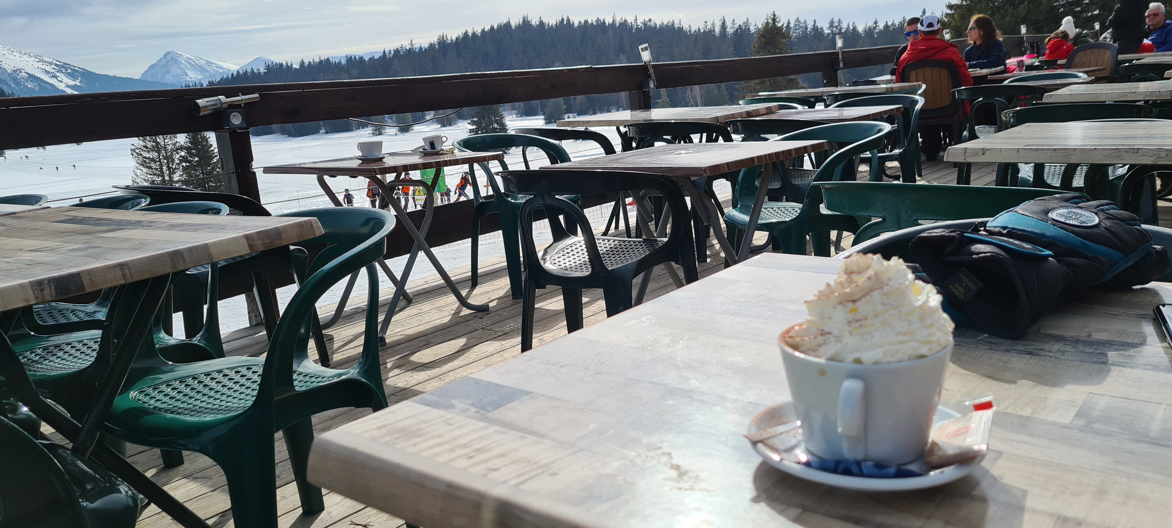 Restaurant avec grande terrasse offrant une vue exceptionnelle sur une belle étendue de ski nordique et chaînes de montagnes enneigées. Bonne adresse pour un moment de détente avec une boisson chaude ou un repas dans un cadre magnifique !