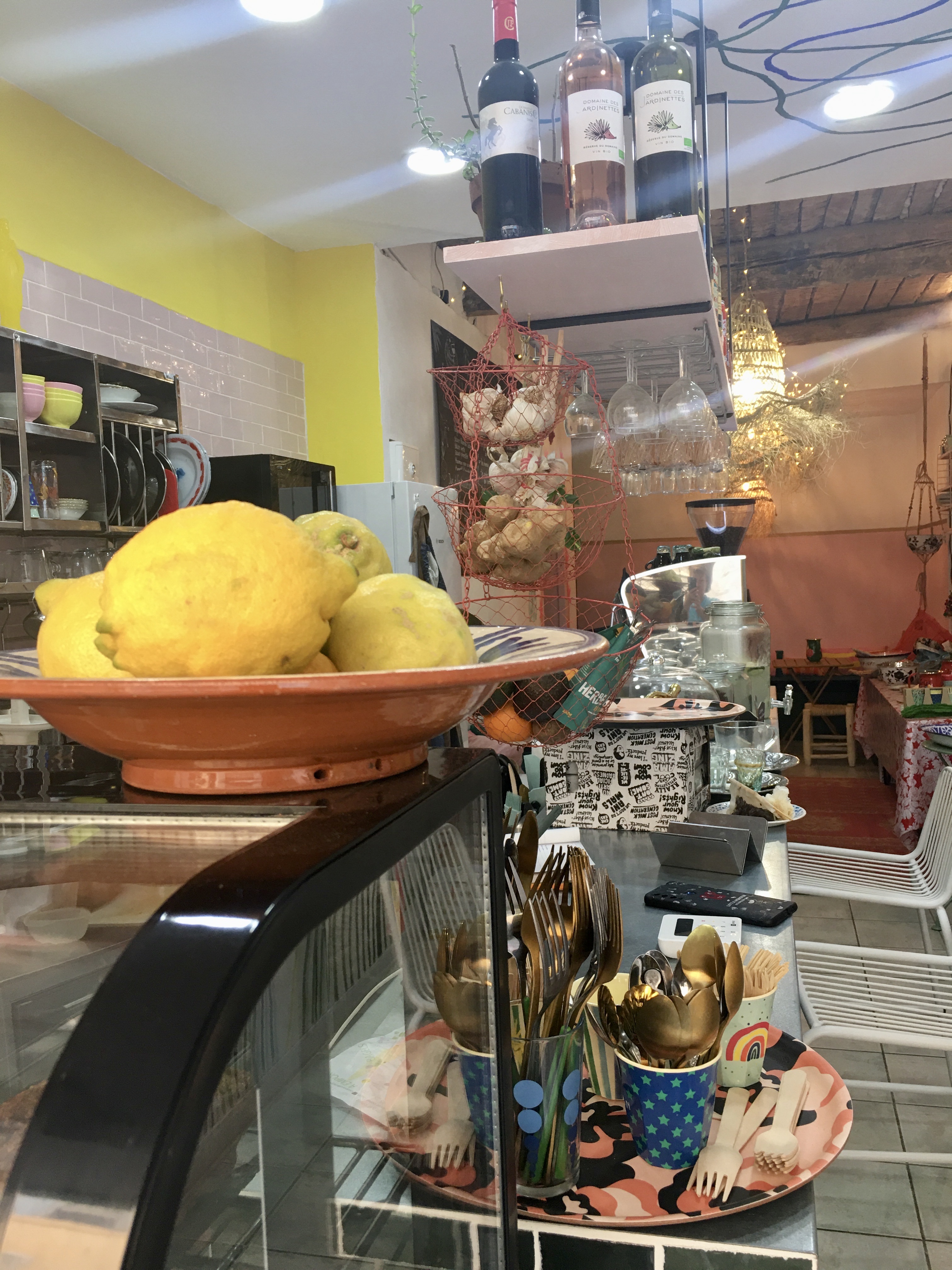 Espace joli coloré rempli de bonnes choses à manger. Servi dngas la bonne humeur 😁 Des plats végétariens disponibles, on adore