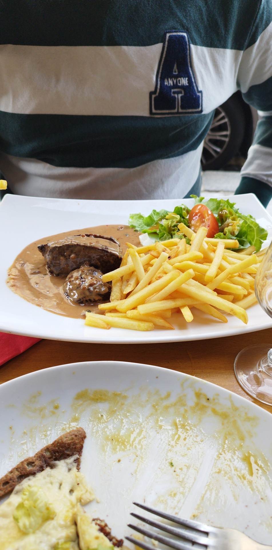 Excellent service les gars très gentils le poulet au curry était excellent la salade était correcte et les crêpes étaient délicieuses Super endroit pour regarder les gens, je le recommande vivement
