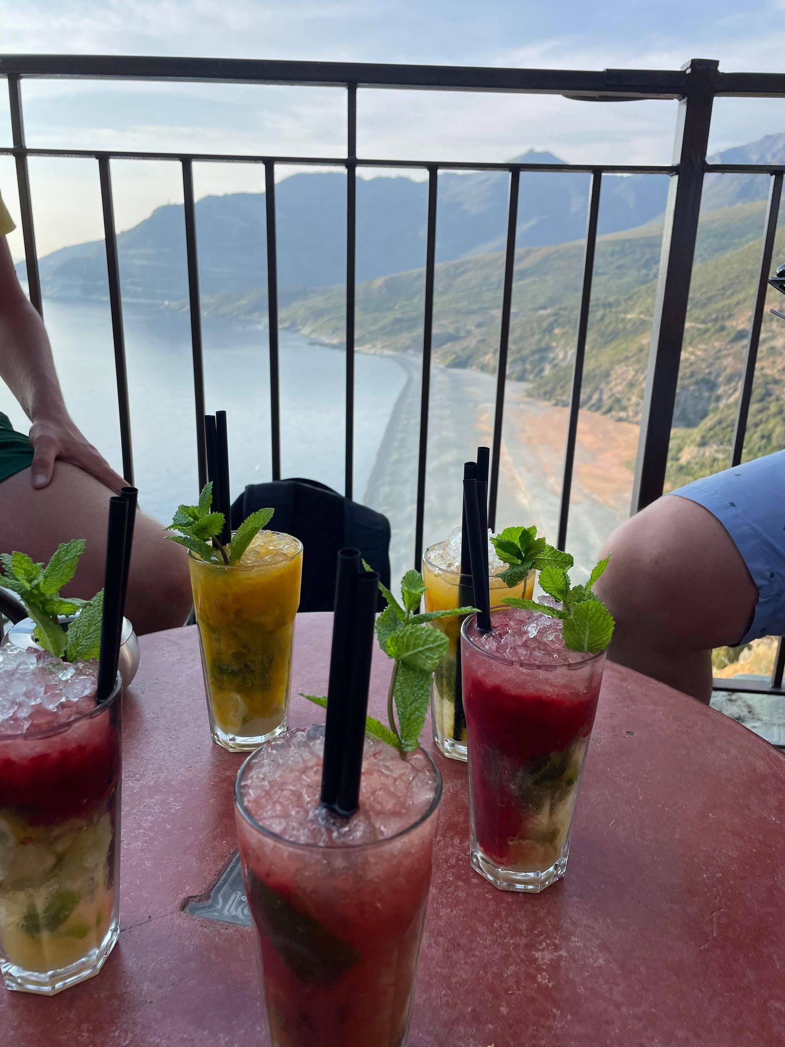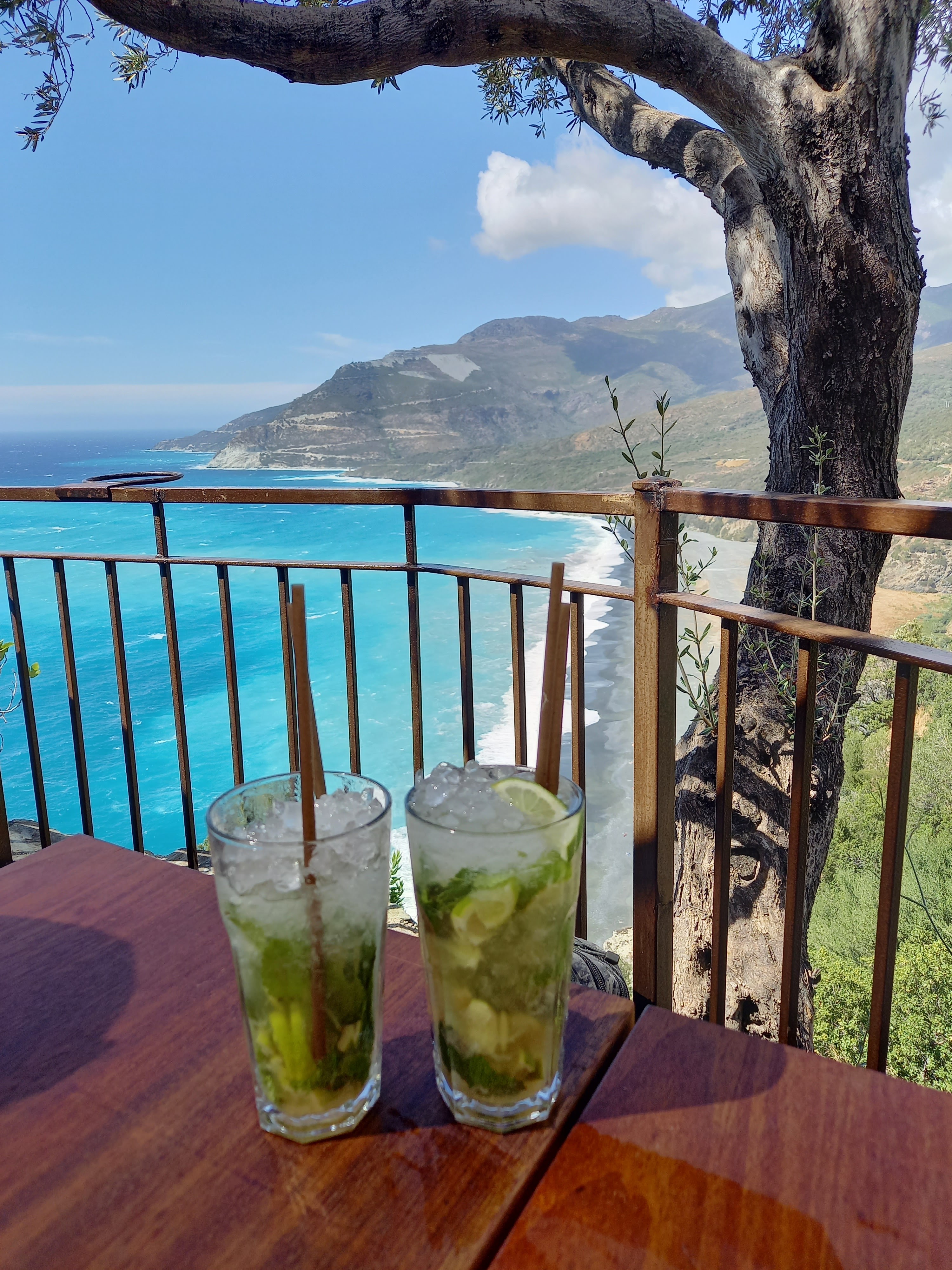 C'est magnifique ! Mojito fruits (mangue, passion...) un délice. La vue est superbe on ne s'en lasse pas. Surtout avec un Golden hour aussi somptueux. La vue sur la plage de Nonza avec ses fameux galets noirs.