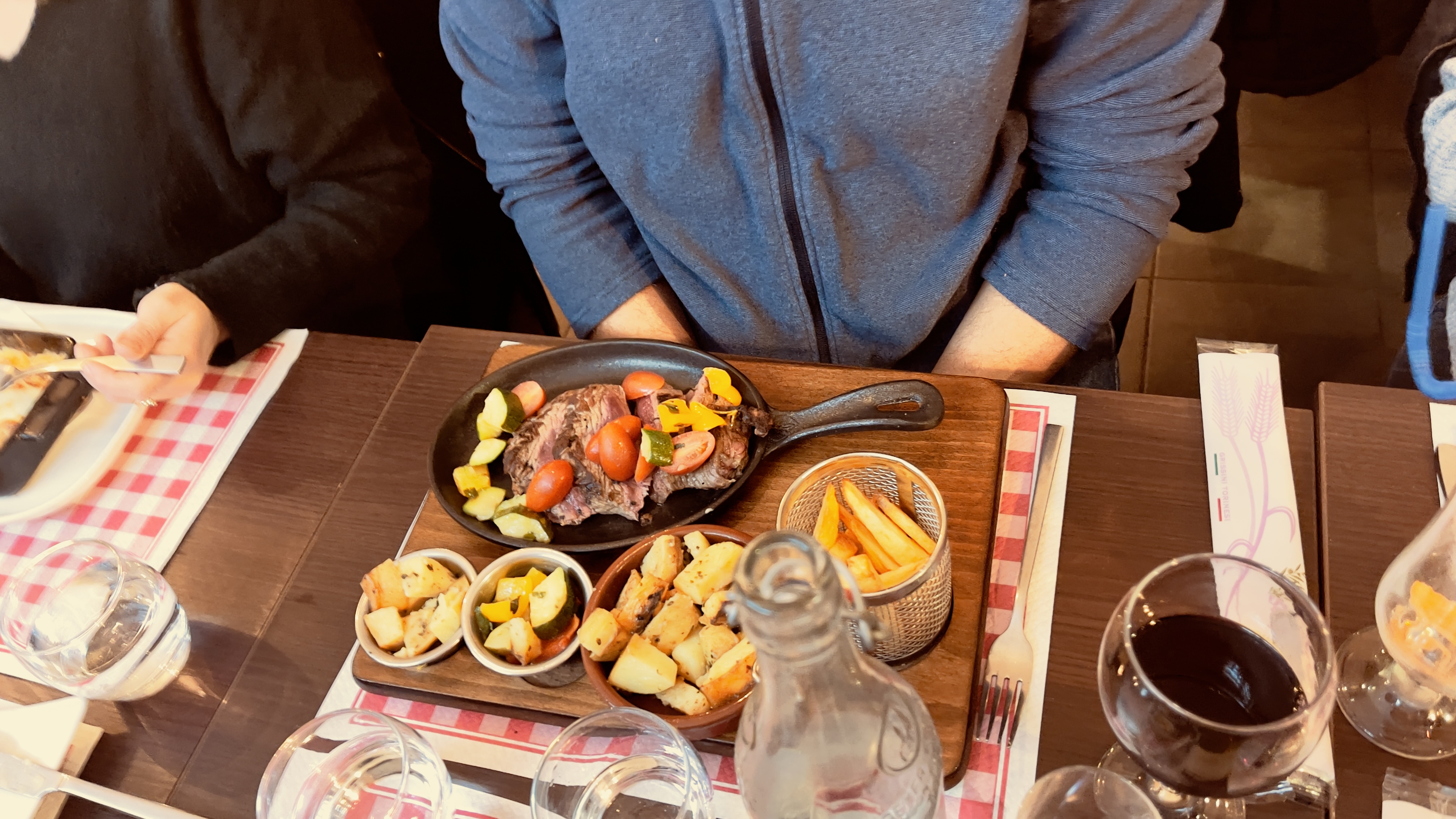 Nourriture et salle correctes… Service: - Bouteille de chianti 24€ pour une table de 2 personnes…les verres à vin sont différents. - je demande l’addition: le serveur me montre sans un mot le bar et s’en va…pas trés classe pour une restaurant de quartier Déçu!