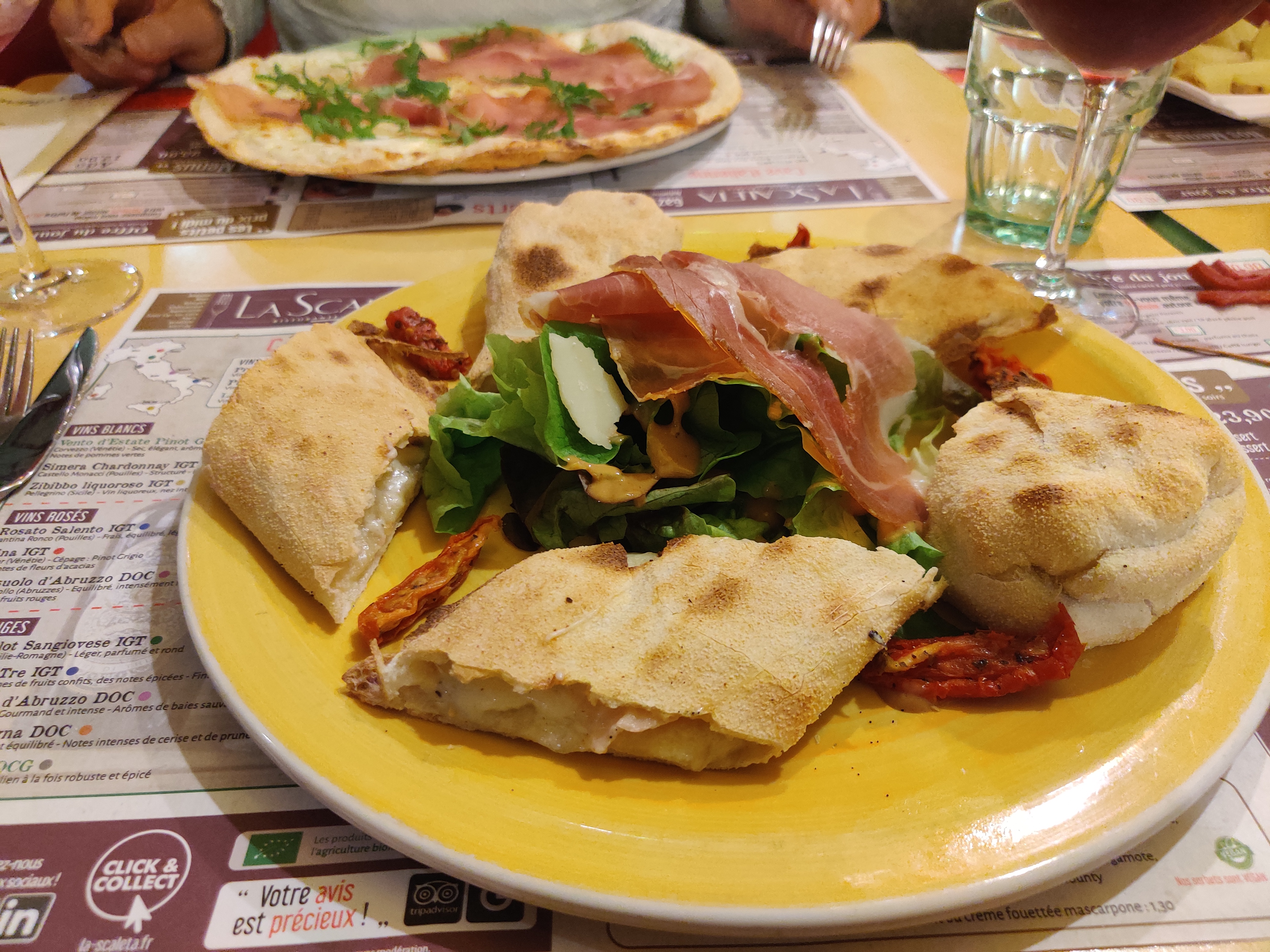 Voyage en Italie version Low Cost En vadrouille aux bords du Loir, nous sommes orientés par la propriétaire de notre gîte vers le restaurant la Scaleta. Brandissant un apéritif offert, le ventre criant famine et novices du tourisme régional, nous réservons une table. Si le service, l'accueil et l'hygiène des lieux sont irréprochables, il en est autrement pour la ''cuisine'' et la qualité retrouvée dans l'assiette. Nous commençons avec une première déception : l'huile pimentée est industrielle. De l'huile, des poivrons / piments baignés pendant quelques temps ... Visiblement c'est trop complexe pour un resto italien. Nous commandons une tour apéritive avec diverses charcuteries et amuses bouches de la carte. Pour 3-4 personnes, il ne faut pas être affamé (heureusement, nous étions deux). Les artichauts sont visiblement sortis de conserves ou de boîtes, il n'y a rien de maison ou de travaillé dans cette proposition. Nous retenons les amuses bouches frits. Les kirs prosecco remplissent le cahier des charges. Nous passons ensuite aux pizzas. Pourtant alléchantes, la qualité des garnitures n'est pas en adéquation avec les prix. Des olives noires dénoyautées, industrielles type carrefour, sans goût. Une burrata qui ne casse pas 3 pattes a un canard (pareil, manque de goût, on est sur une industrielle de base). En fait on a l'impression d'un assemblage d'ingrédients industriels de mauvaise qualité, alors les pâtes à pizza sont plutôt bonnes et semblent être faites maison. Pour finir, un tpe qui ne prend pas la carte ticket restaurant. Nous finirons par rentrer regarder Nagui, histoire de finir la soirée comme elle a commencé.