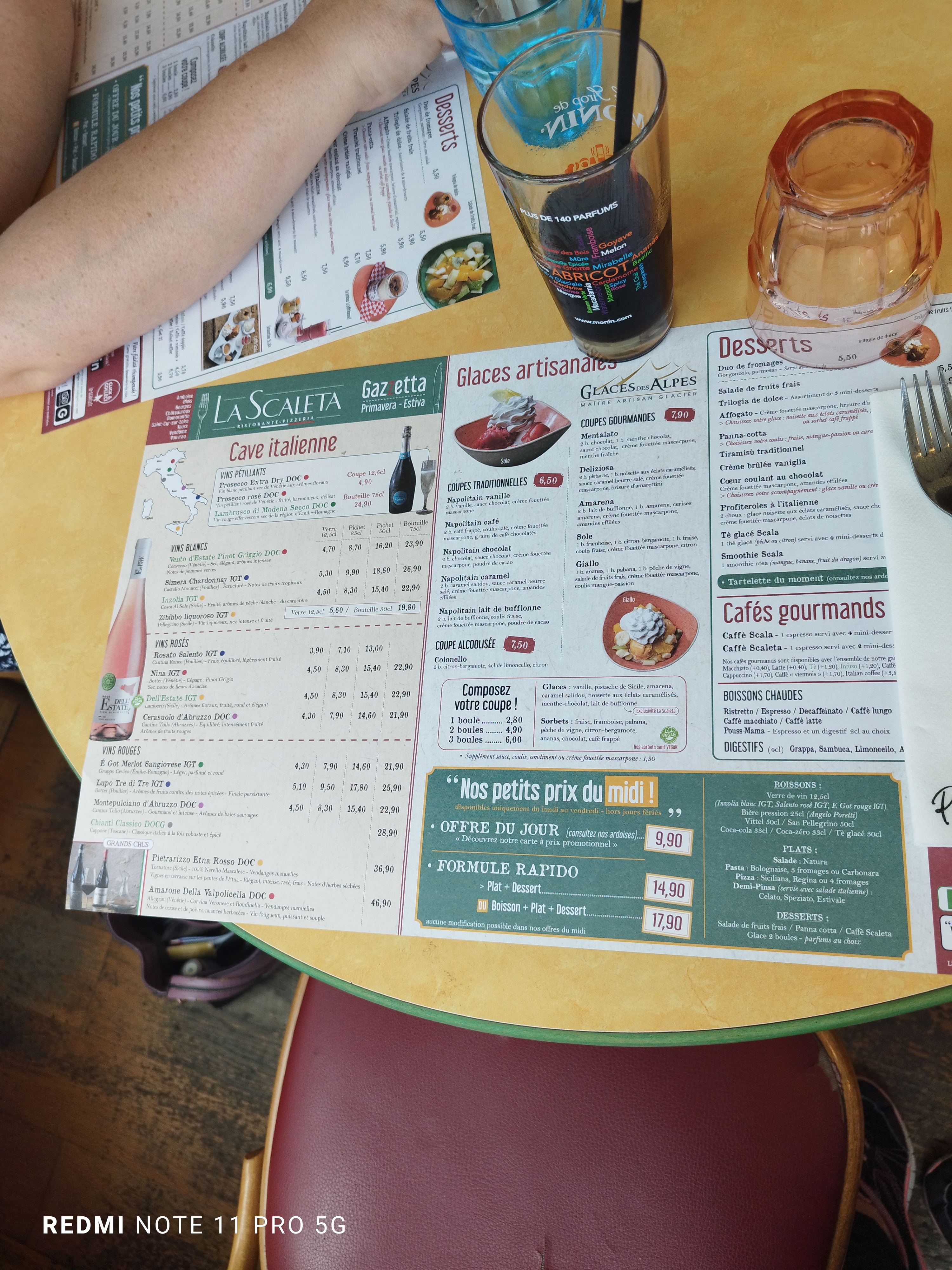 Très déçu, coktail un grand verre enfin 20cl + 5 glaçons 🤦 , 1 risotto Del Mare ressemble plus à du riz au lait, Salade Andiamo classique, table au fond de la véranda un peu oublié et pas facile pour voir le serveur, pas réussi à demander du pain, ma bière je l'attend encore et le café gourmand le serveur avait oublié
