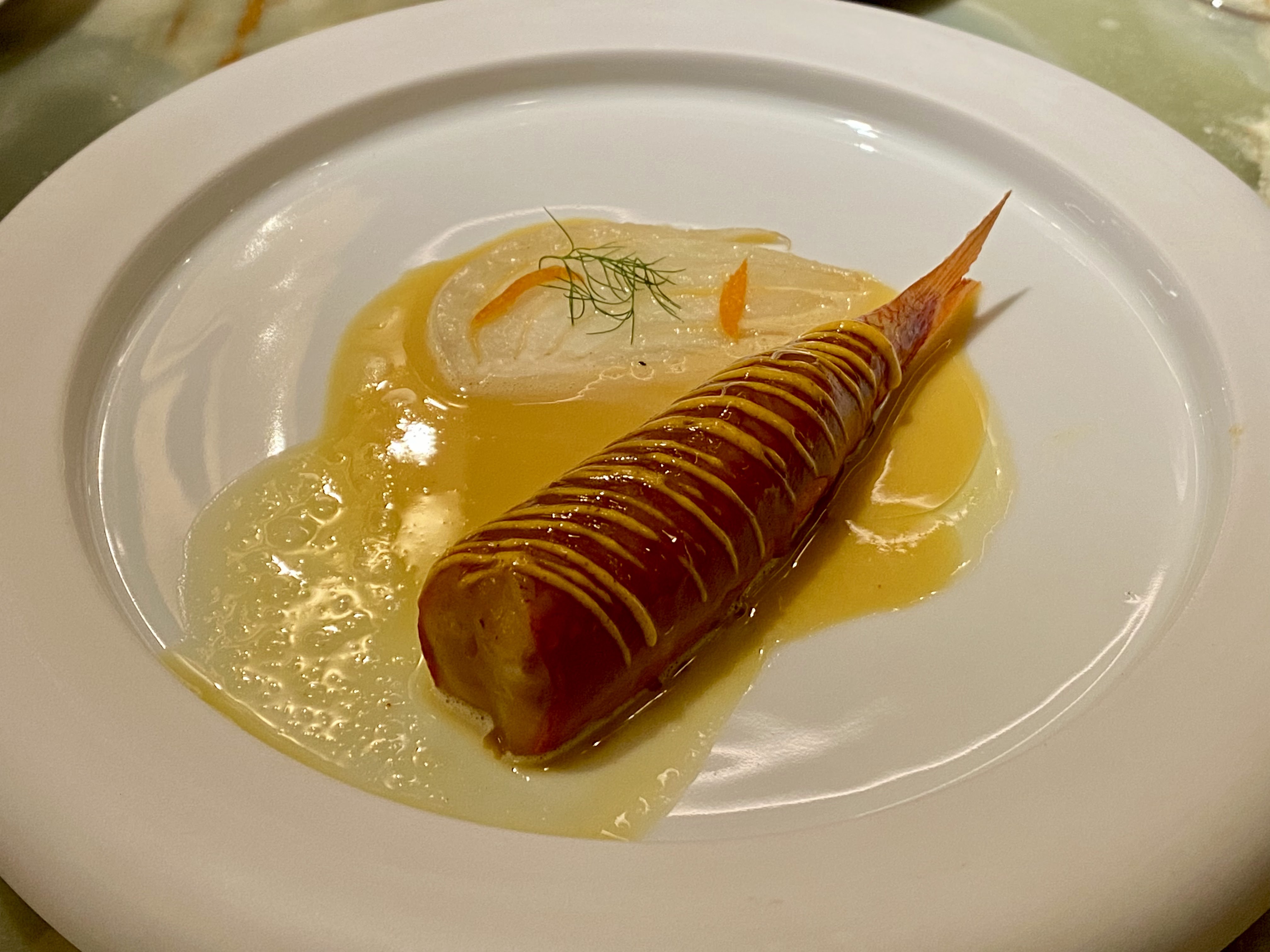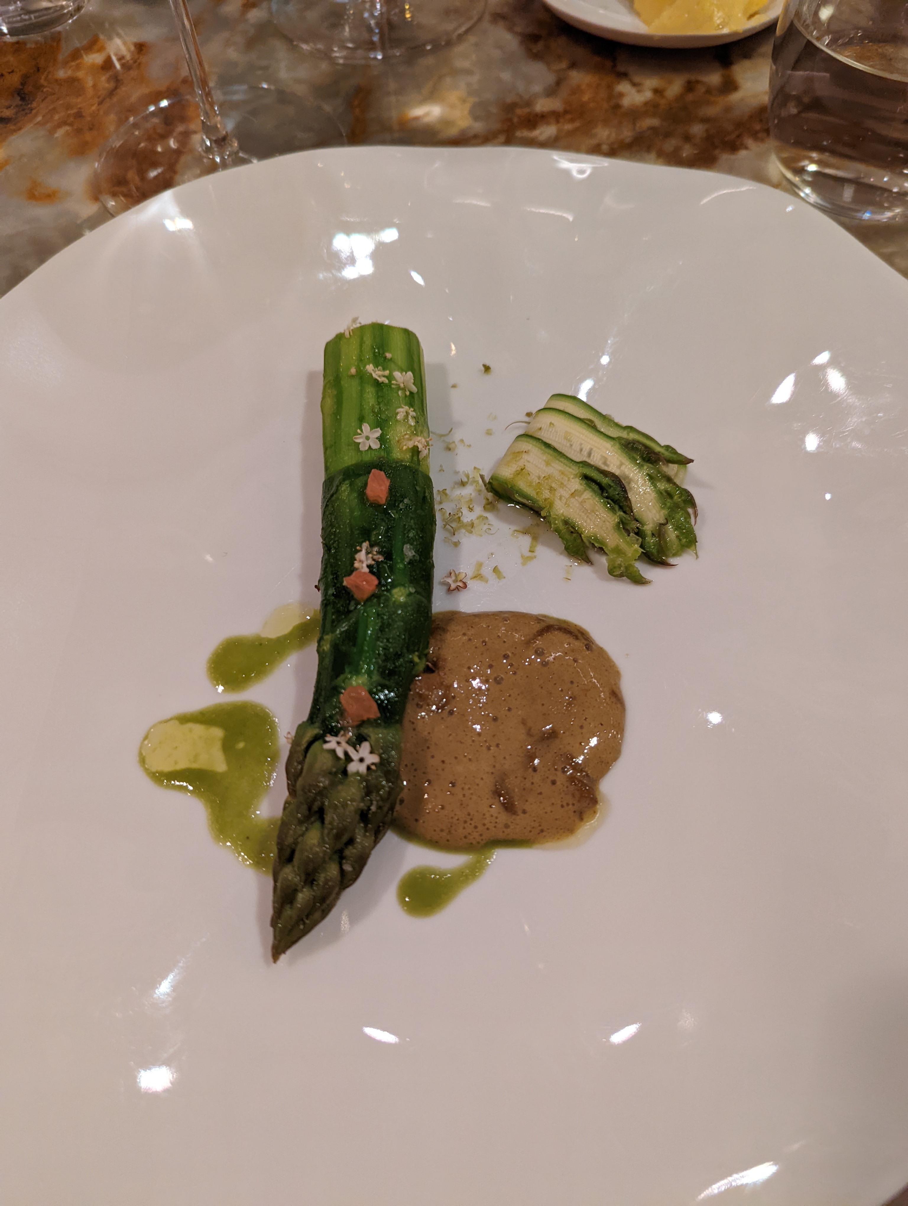 Le dîner était tout simplement incroyable ! Nous avons eu le menu de 10 plats et tout était extraordinaire. Si je devais me plaindre sur la nourriture je dirais que le rouget signature n'était pas le plat le plus impressionnant et concernant le service au début tout allait très vite mais à la fin il fallait parfois attendre 10/15min entre les assiettes donc dans l'ensemble le dîner a duré plus de 3h30. C'était un peu trop long. Mais sinon tout était très bien et le service parfait. Je recommande vivement cet endroit 👍