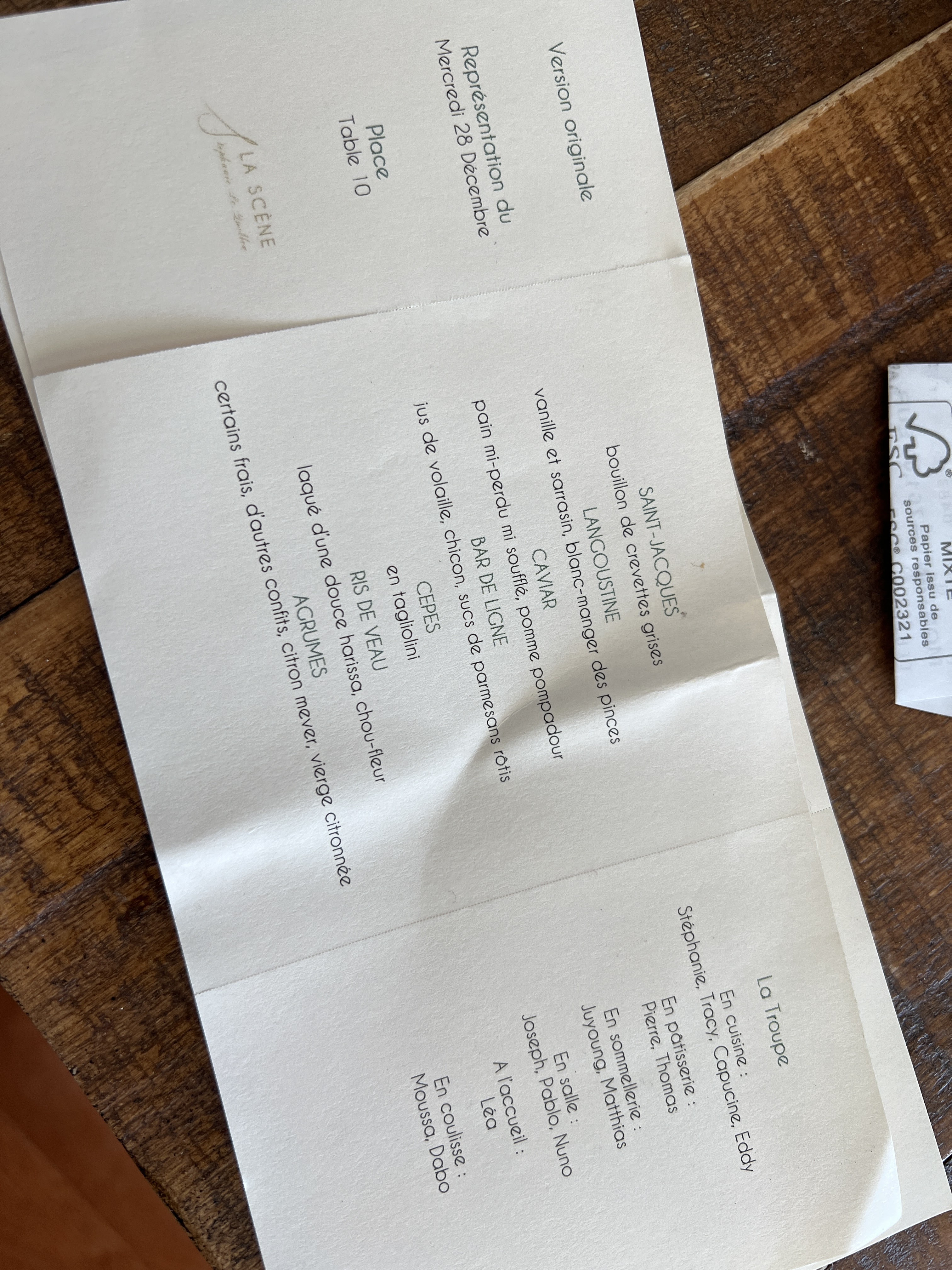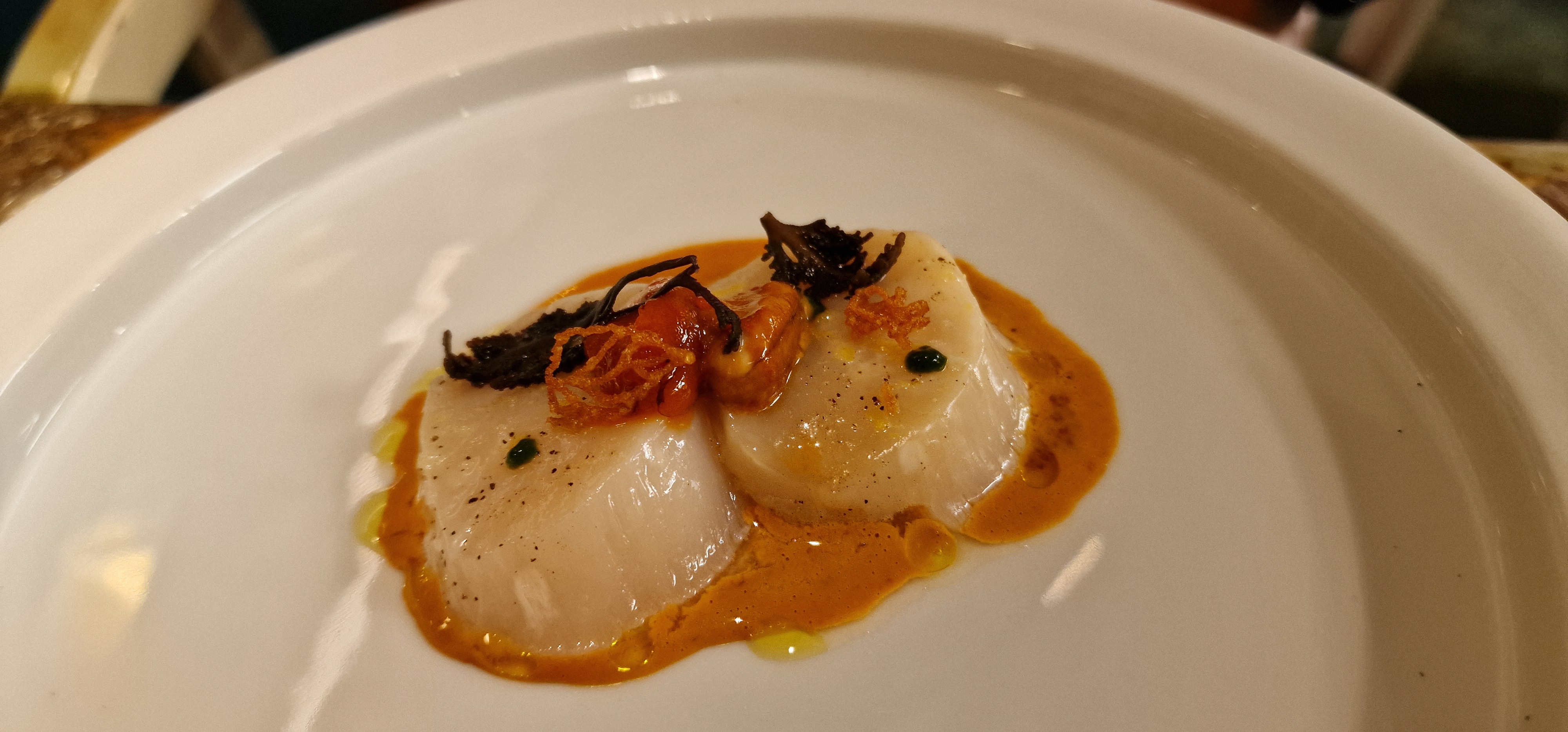 ALLERGIQUES S'ABSTENIR. Excellente cuisine et ballet silencieux remarquable en cuisine. Mais la soirée fut gâchée par l'allergie aux crustacés pour 2 personnes de la table, malgré notre alerte à la réservation et au début du repas. La gestion de l'incident fut très décevante: excuses laconiques, pas de prise en compte du danger et des process à revoir. Promesse de 2 livres en réparation. Tout ceci n'est pas à la hauteur de La Scene et nous laisse bien déçus. Comment éviter de potentiels chocs anaphylactiques ? Mystère à la Scène