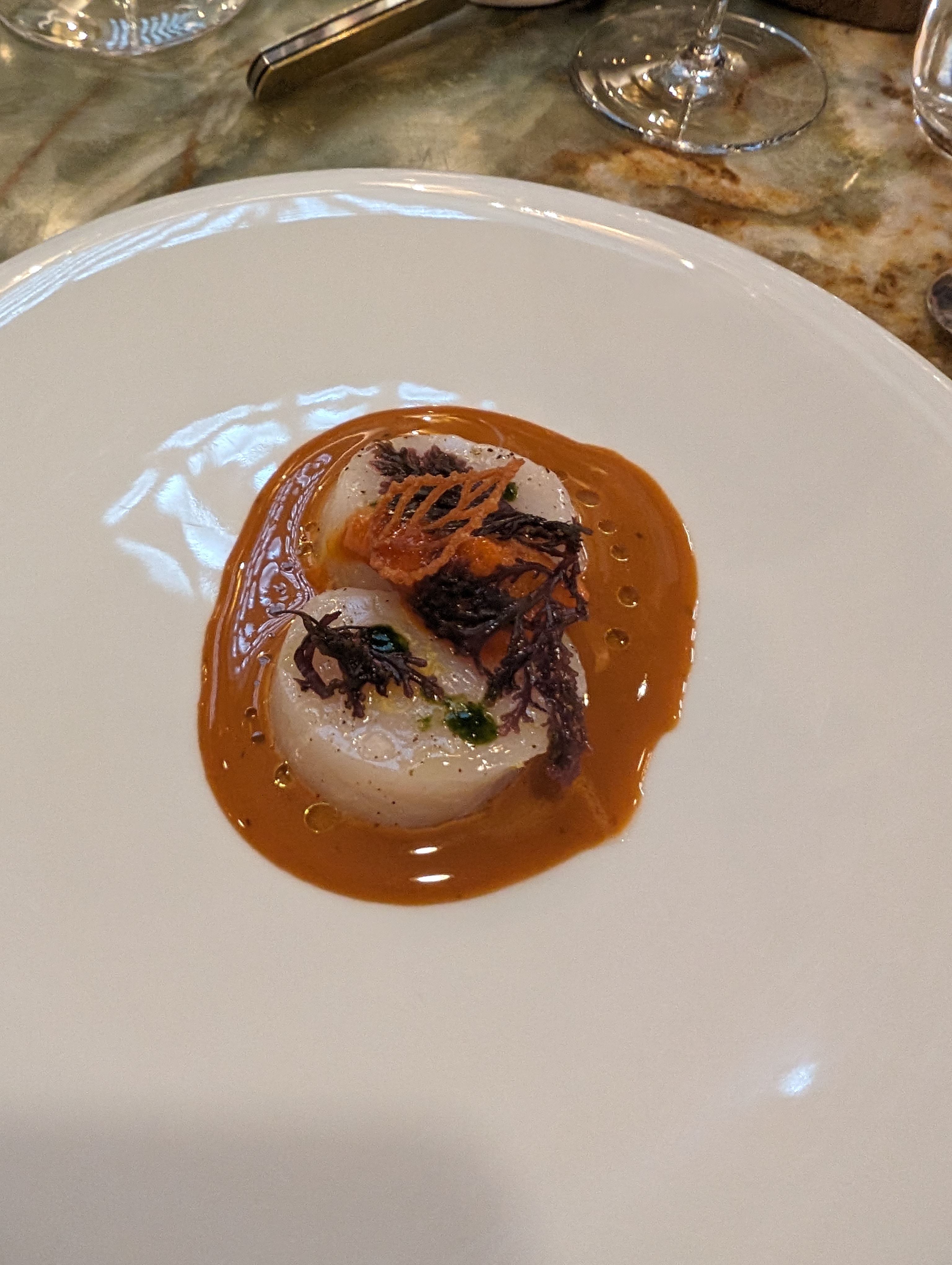 Notre dîner à La Scène était tout ce que vous souhaiteriez vivre une expérience unique. Le service était impeccable. Le chef a surveillé votre rythme pour s'assurer que le prochain plat était prêt exactement au moment où vous l'étiez à chaque fois et que la nourriture était incroyable !!!! Nous avons eu un plat sur les 7 (le sébaste) qui avait une saveur trop forte de poisson pour nous, de sorte qu'un plat était décevant, mais les 6 autres étaient parfaits et l'attention portée aux détails avec les accords mets et vins était incroyable. Nous y retournerions sans hésiter. C'était vraiment incroyable. Nous avons mangé et parlé pendant 4 heures et demie et tout est passé à toute allure. Merveilleux.