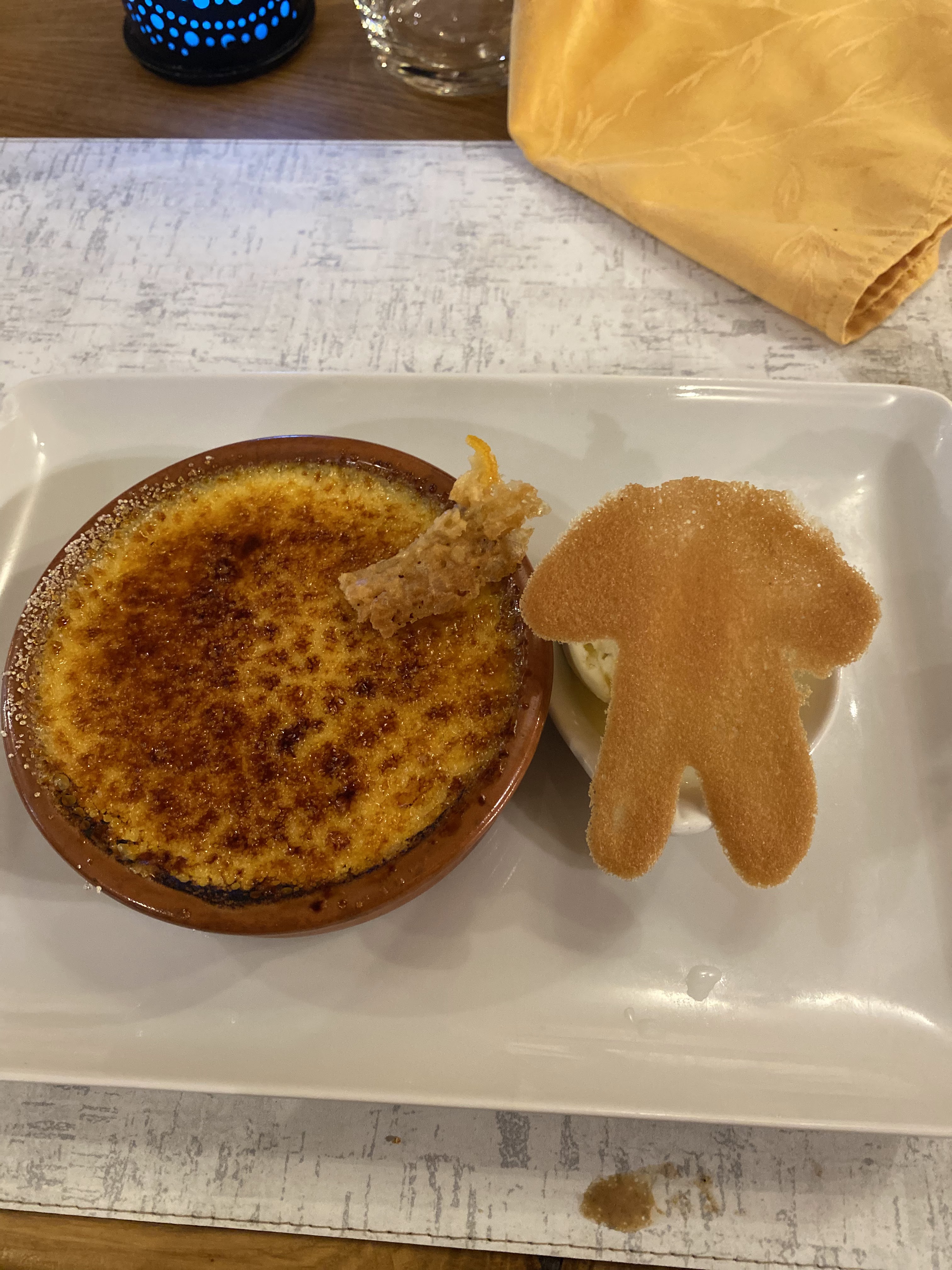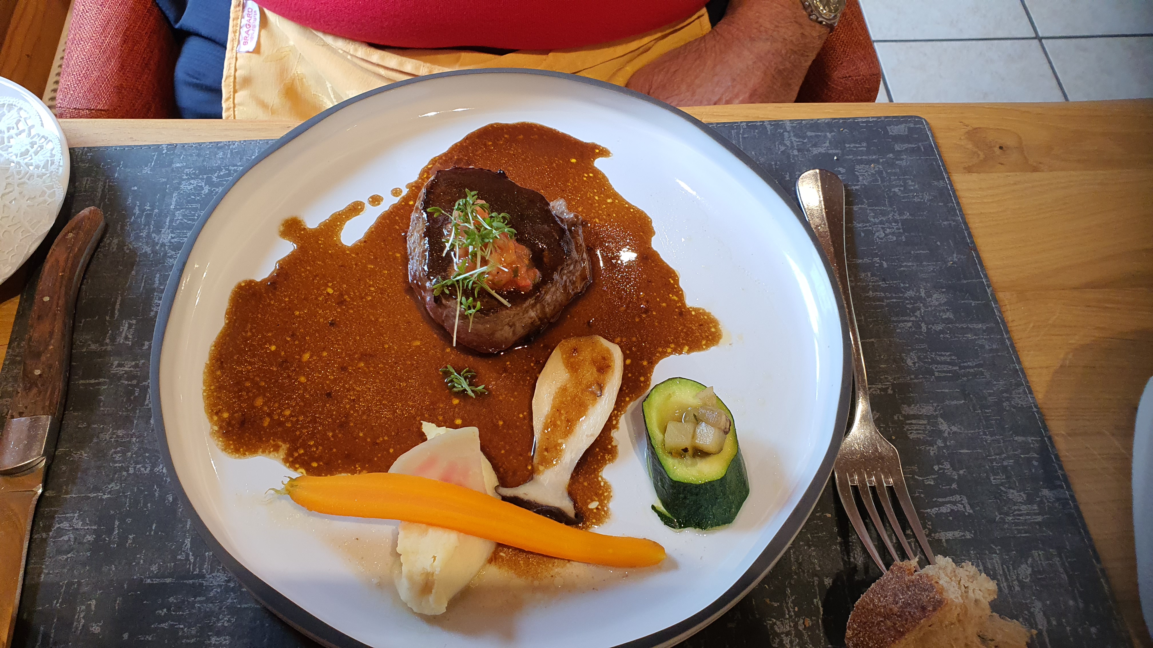 Dimanche 02 octobre 12h15 Accueil agréable, mais la déception est arrivé très vite cinq personnes à table, nous choisissons le menu gourmand à 36€. Entrée: Fois gras. Plat principal : Filet de daurade au poivre siltimut. Et la déception plus que un filet de daurade disponible il est 12h15 et quatre tables occupées . On nous propose un filet de sandre à la place , on prend une daurade , un sandre et trois faux filet simmenthal , arrivent les faux-filet plein de nerfs,caoutchouteux et des couteaux qui ne coupe pas. Passons aux dessert nous prenons deux tartes tatin aux figues fraîches et sa glace on reçois deux tartes tatin aux pommes cannelle et sa glace. A décharge le fois gras de canard maison est excellent je recommande vivement .