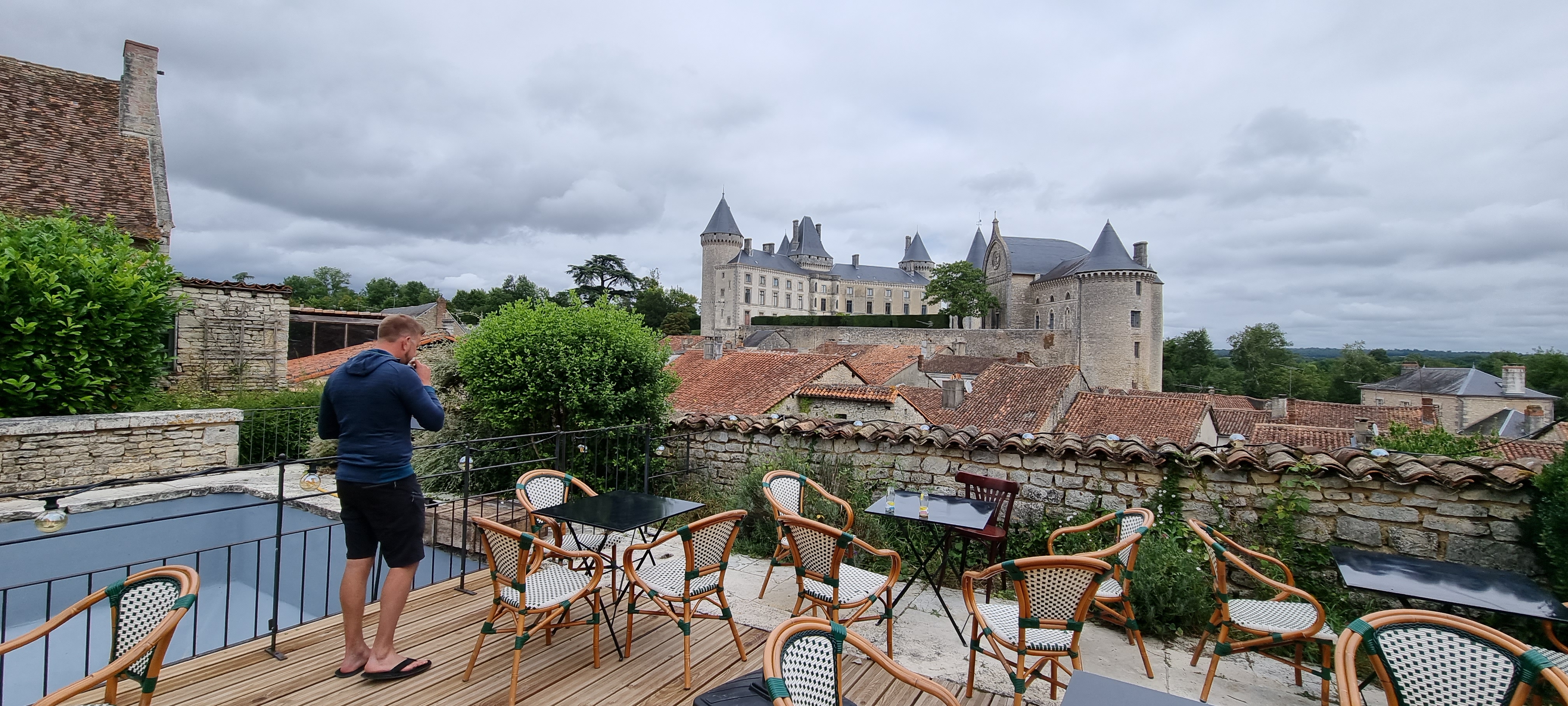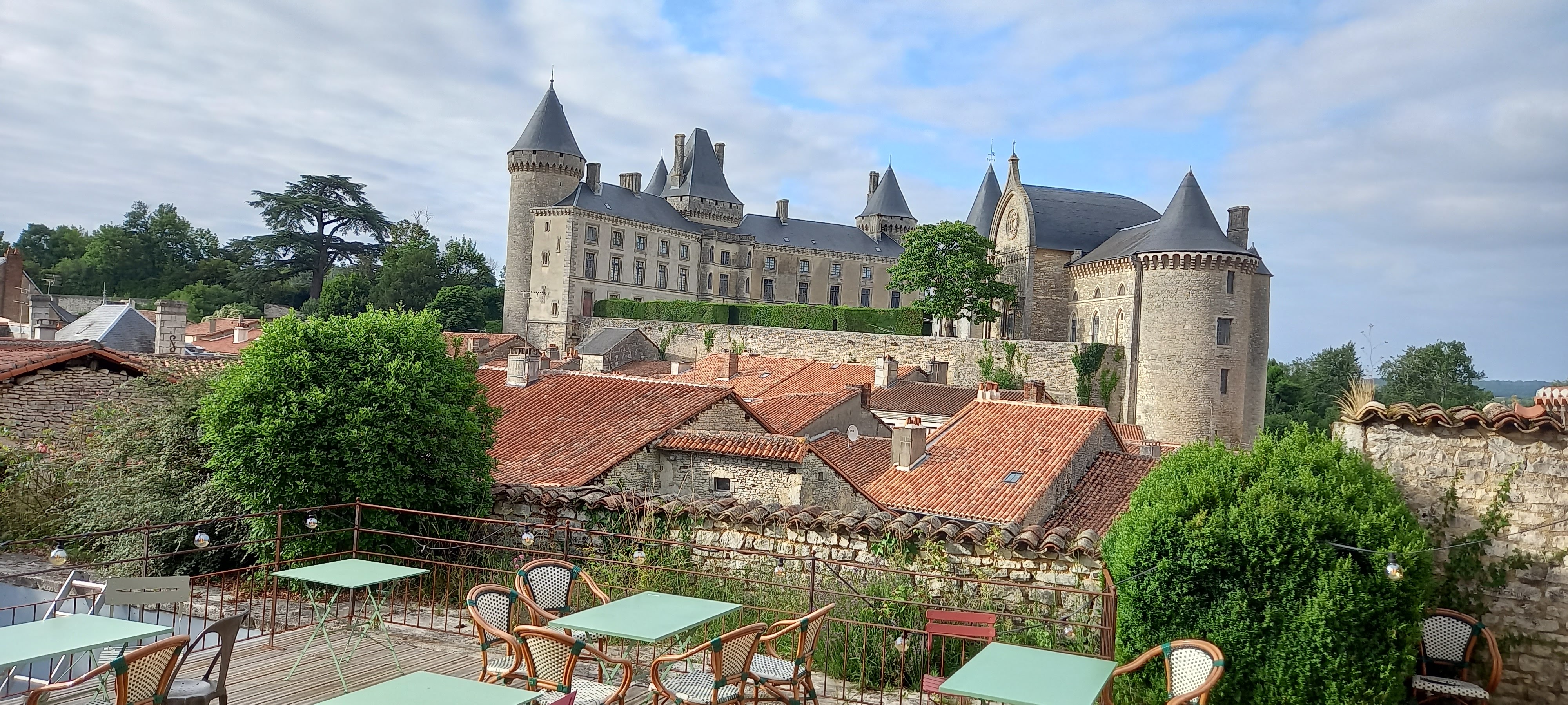 Repas raffiné, belle terrasse avec vue sur le château de Verteuil