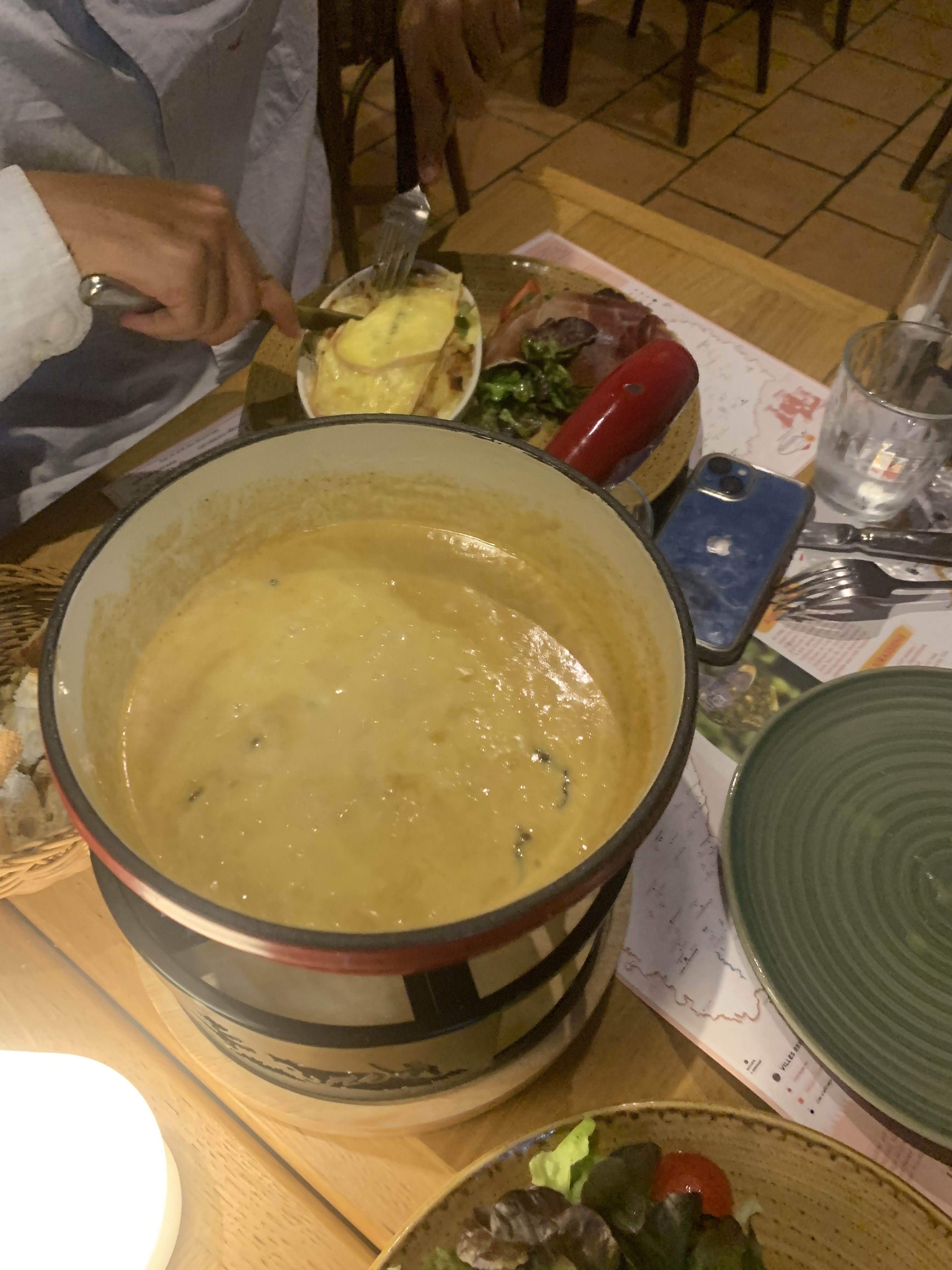 Nous nous faisions une joie de manger une fondue dans ce restaurant bien noté. Si du côté du plat c’était bien. Du côté service une catastrophe ! Si servir ce genre de plat (pour2) sur une table de 70x70 ne pose pas problème au serveur (nous lui en avons fait la remarque alors qu’il y avait des tables + grandes disponibilités) ce n’est pas top pour manger car sur la table il y avait : le poêlon, la panière à pain, une grande assiette de charcuterie, une bouteille d’eau, une bouteille de vin, sel , poivre sans compter nos assiettes et verres. Mais selon le serveur ça se fait !!! Un conseil lorsque vous réserver pour 2 dites que vous êtes 3!