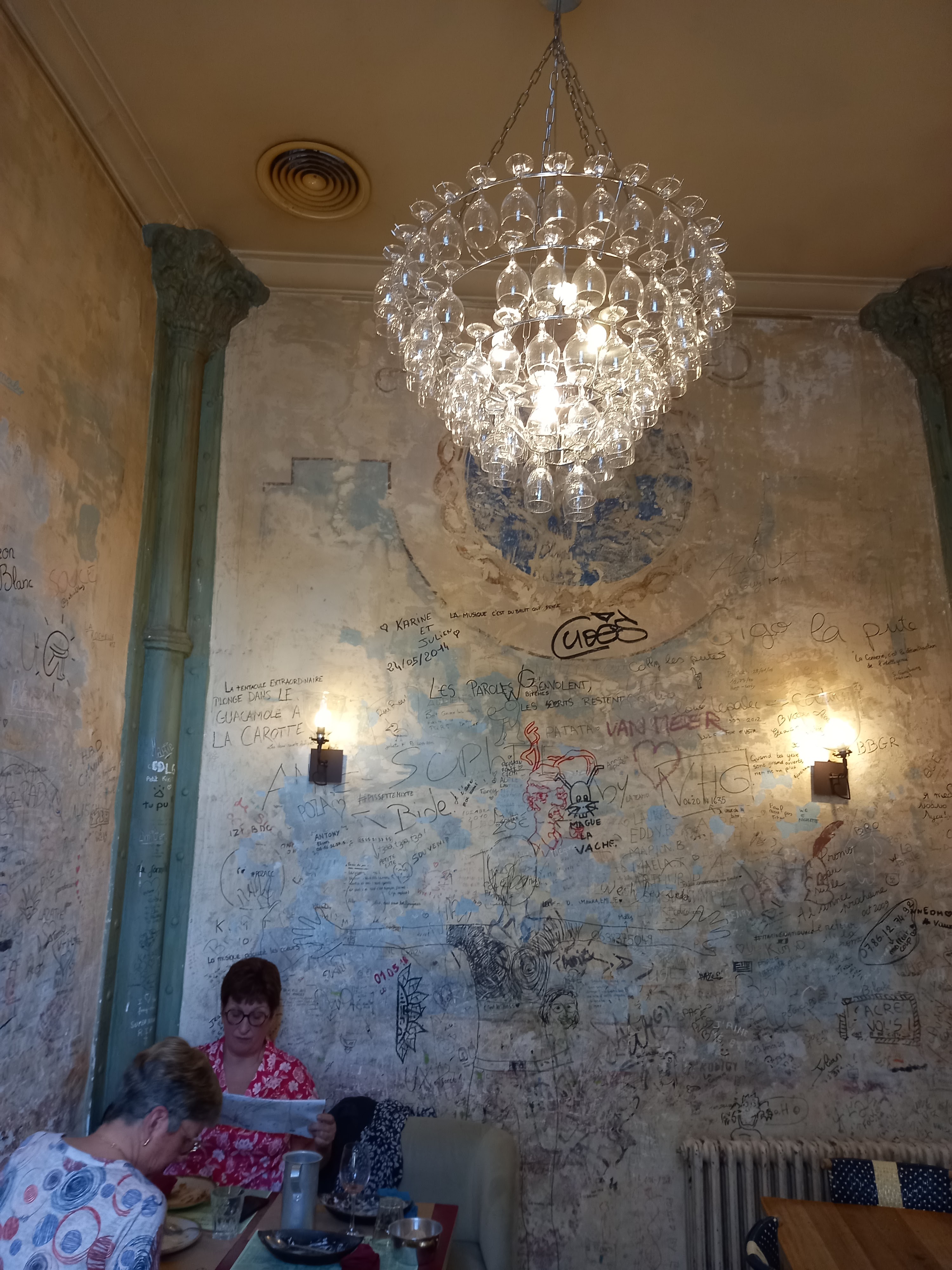 Nous étions sous les toits dans petite pièce au fond d un couloir avec des murs r couverts de divers messages. J ai adoré de la déco aux plats. La prochaine fois je réserverai dans salle principale qui paraît très cosy