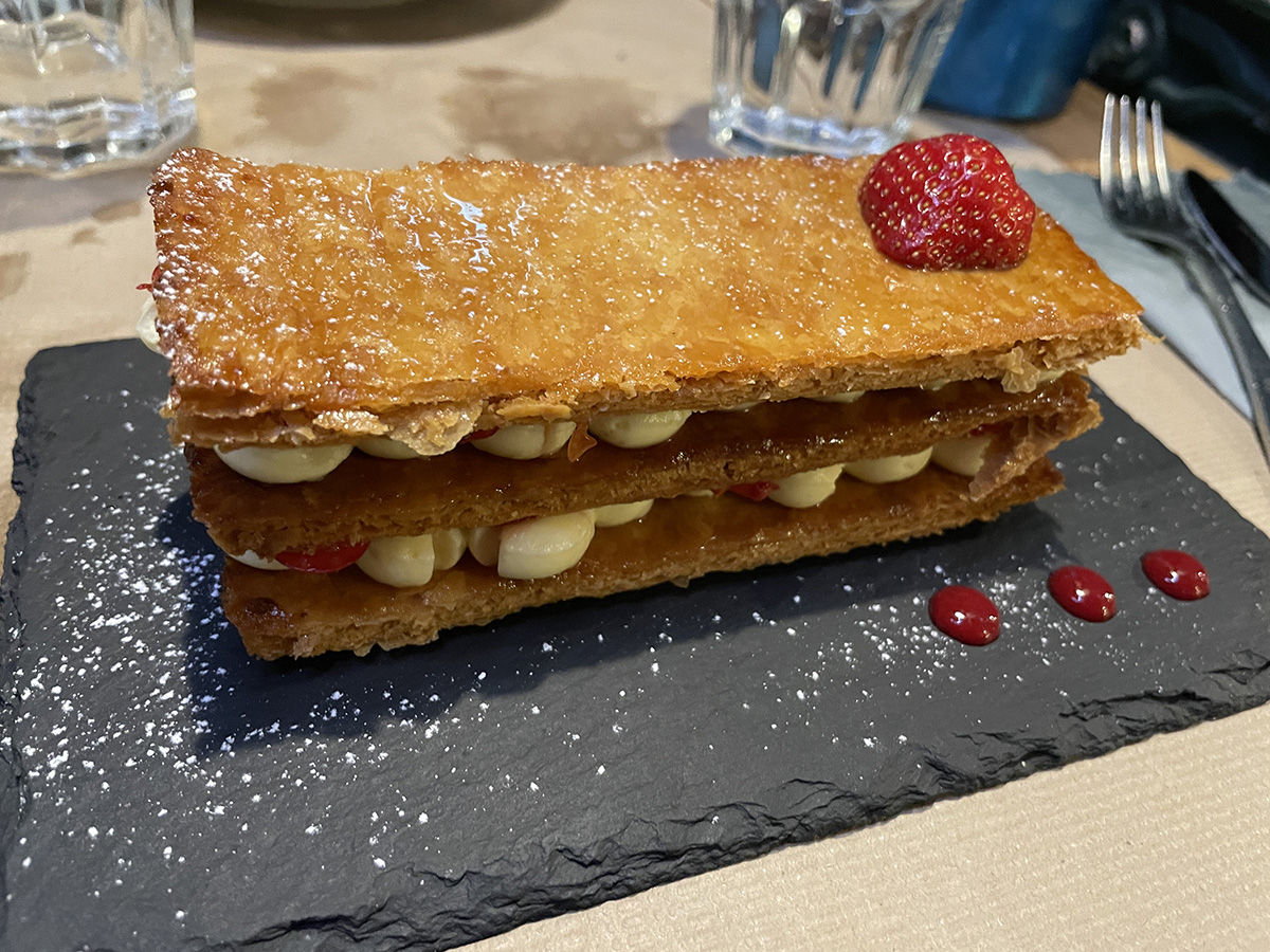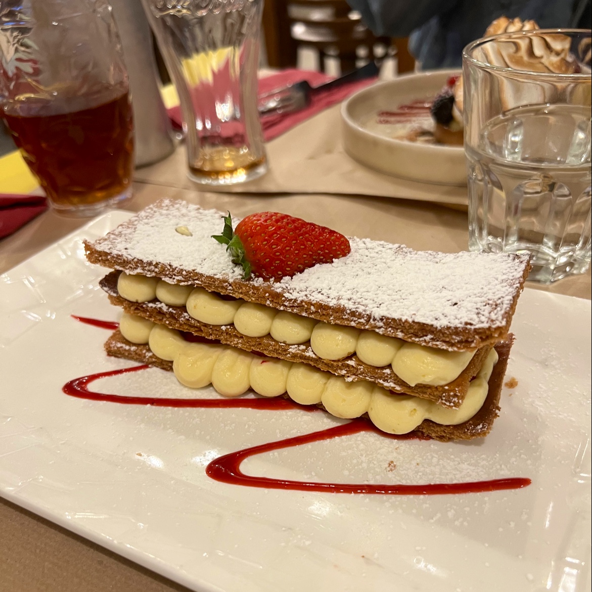 Plats copieux et bons, le personnel sympa. Le dessert (mille feuilles aux fraises) était délicieux. Prix abordables. Le dessert de mon amie (tarte au citron meringuée) avait malheureusement une pâte bcp trop dure pour être mangé.