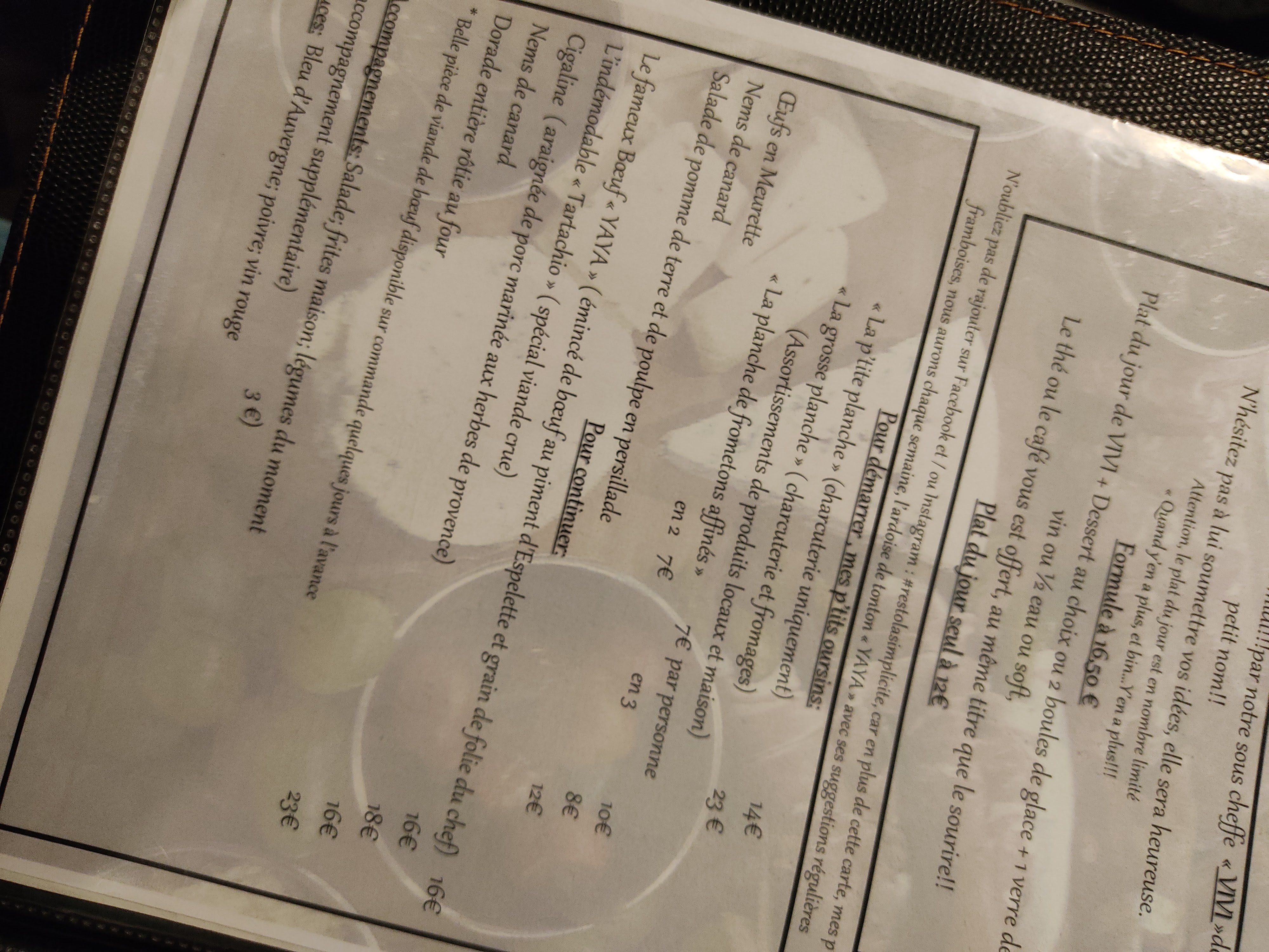 Lieu très agréable, géré avec humour et légèreté. service impeccable, de bon conseil et particulièrement patient. Belle présentation des assiettes, beau choix de vins. Juste 2 petits bémols, la viande du boeuf Yaya un peu trop membraneuse voire ferme selon les morceaux, et les fondants qui n'avaient rien de bien exceptionnel, un peu trop sucrés même. Cela dit il n'en reste pas moins un incontournable sur Nevers.