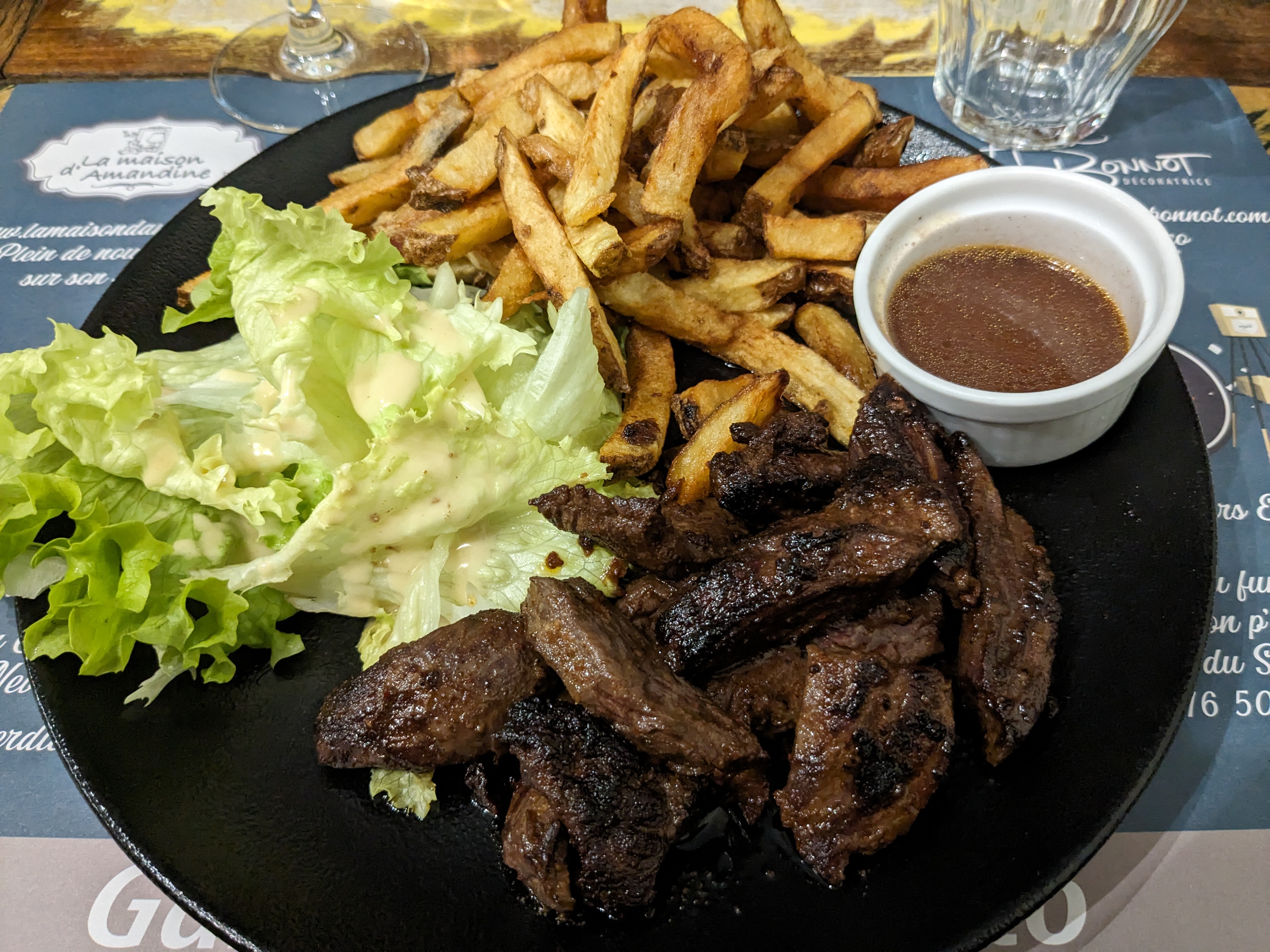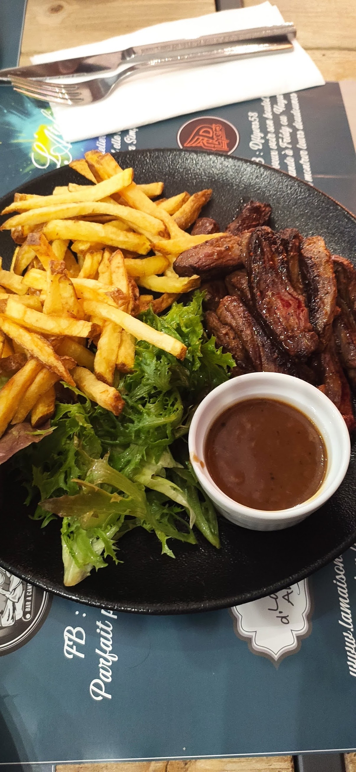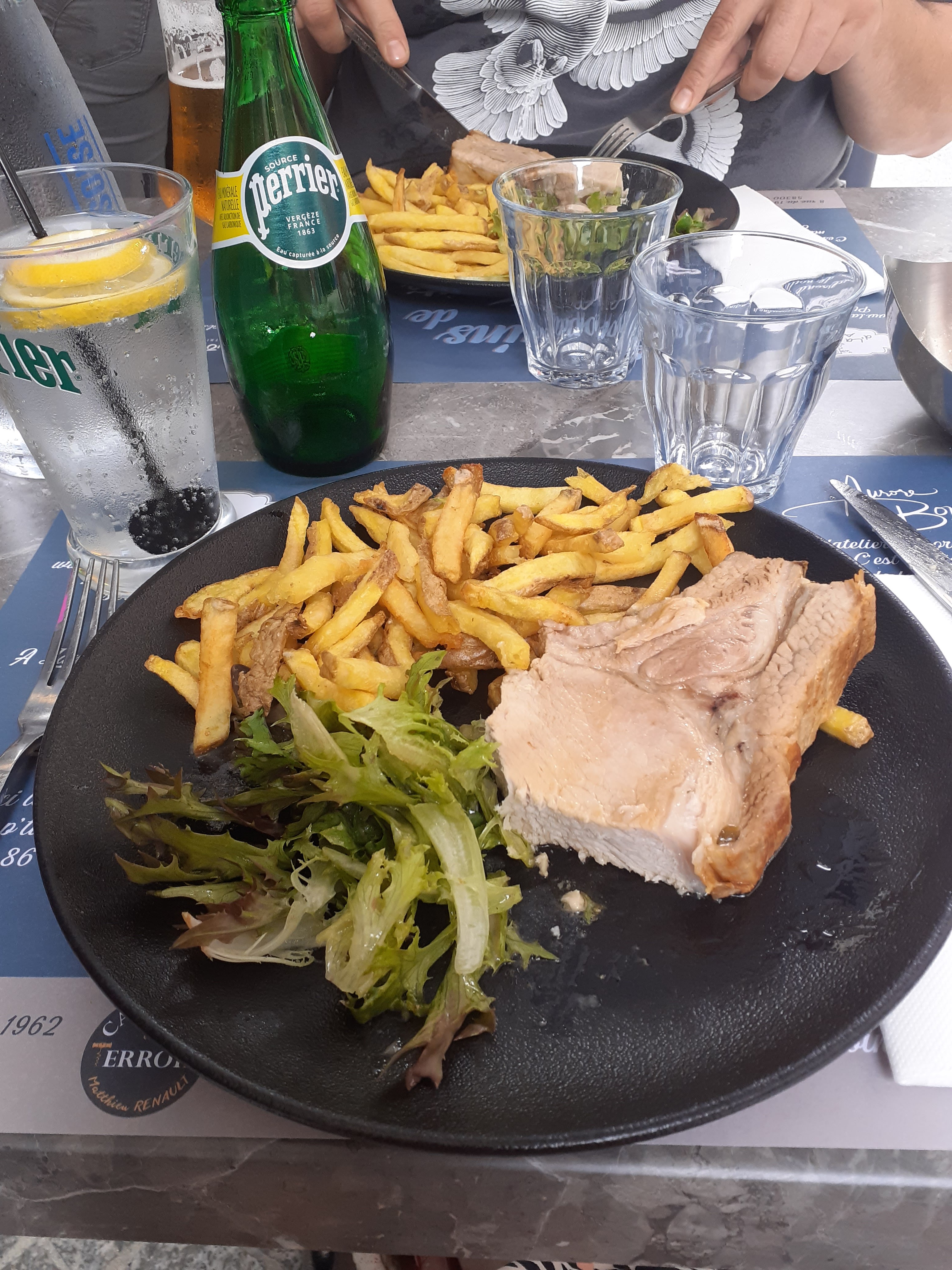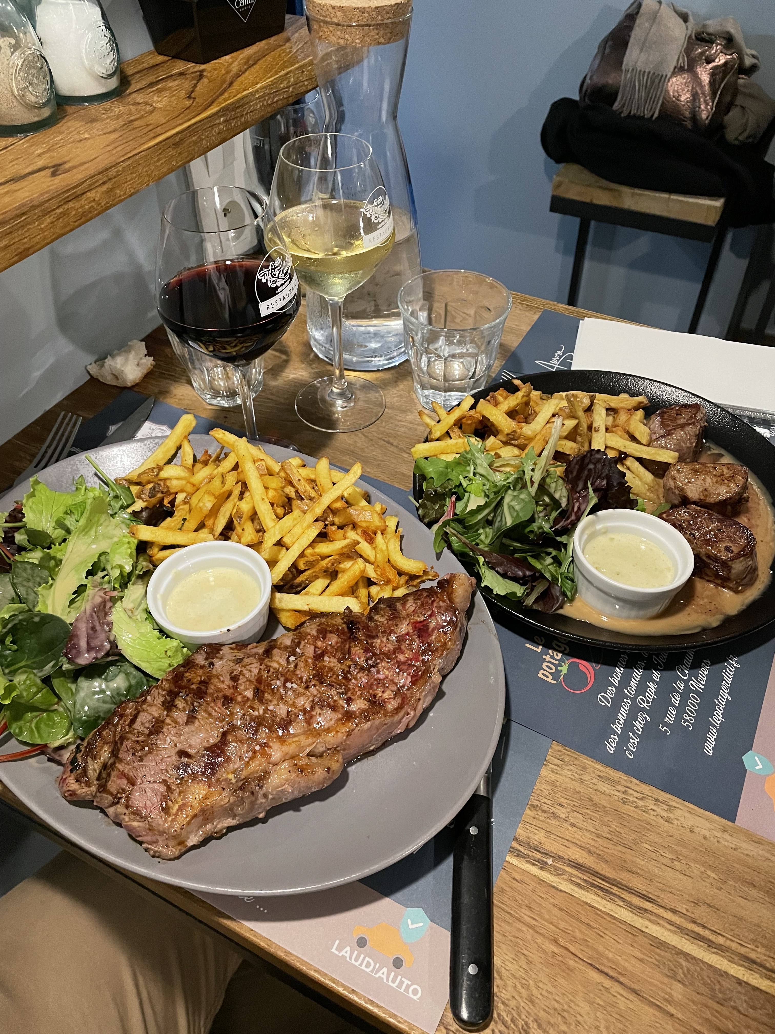 Excellente côte de boeuf avec des frites savoureuses, copieux, un très bon vin. A refaire très vite.
