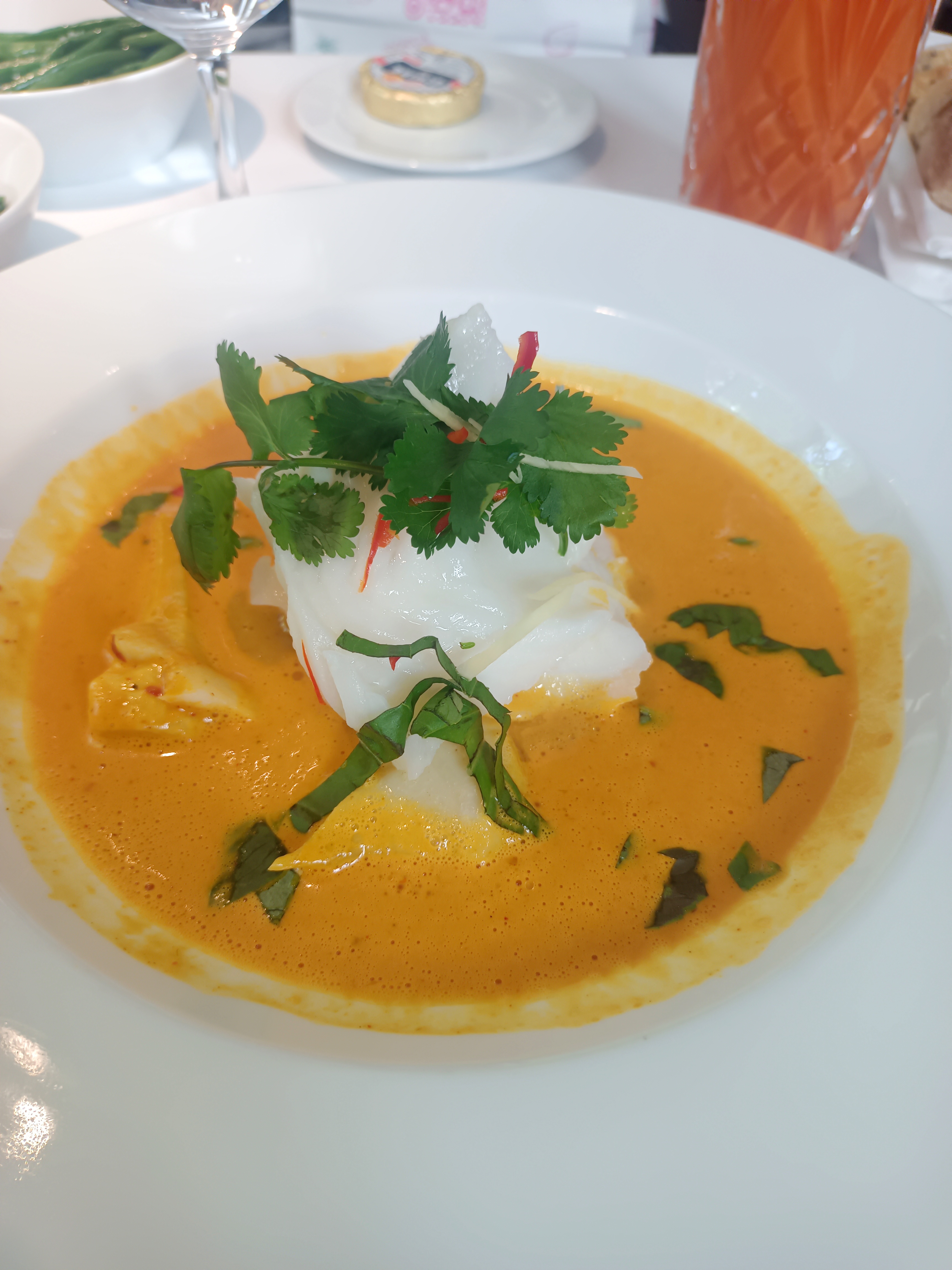 Langouste, bar sauce épicée.. un régal pour le palais et l'échange en très agréable compagnie avec mes meilleurs amis dans ce lieu familier si raffiné ..un déjeuner comme d'hab au TOP ..Merci Alix ! Dans un lieu historique où la rénovation est d'une grande sobriété mais chic, une cuisine française de grande qualité mêlée parfois de subtilité asiatique pour certains plats.