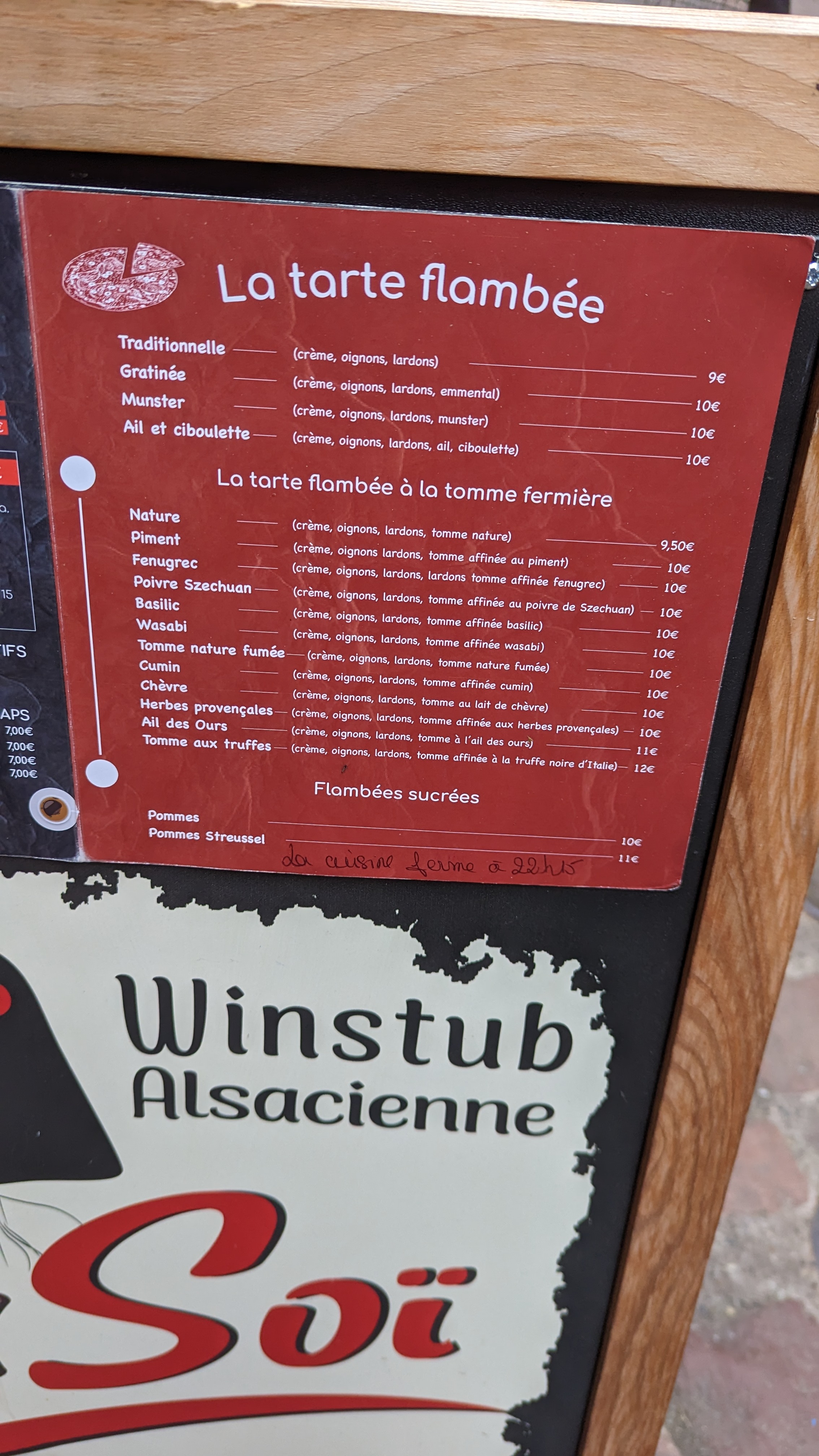 Restaurant qui est semble fermé de l'extérieur. Super accueil dans un lieu intimiste. Plat typique de l'Alsace, les tartes flambées !! Je recommande !! Pensez à réserver car peu de places !!