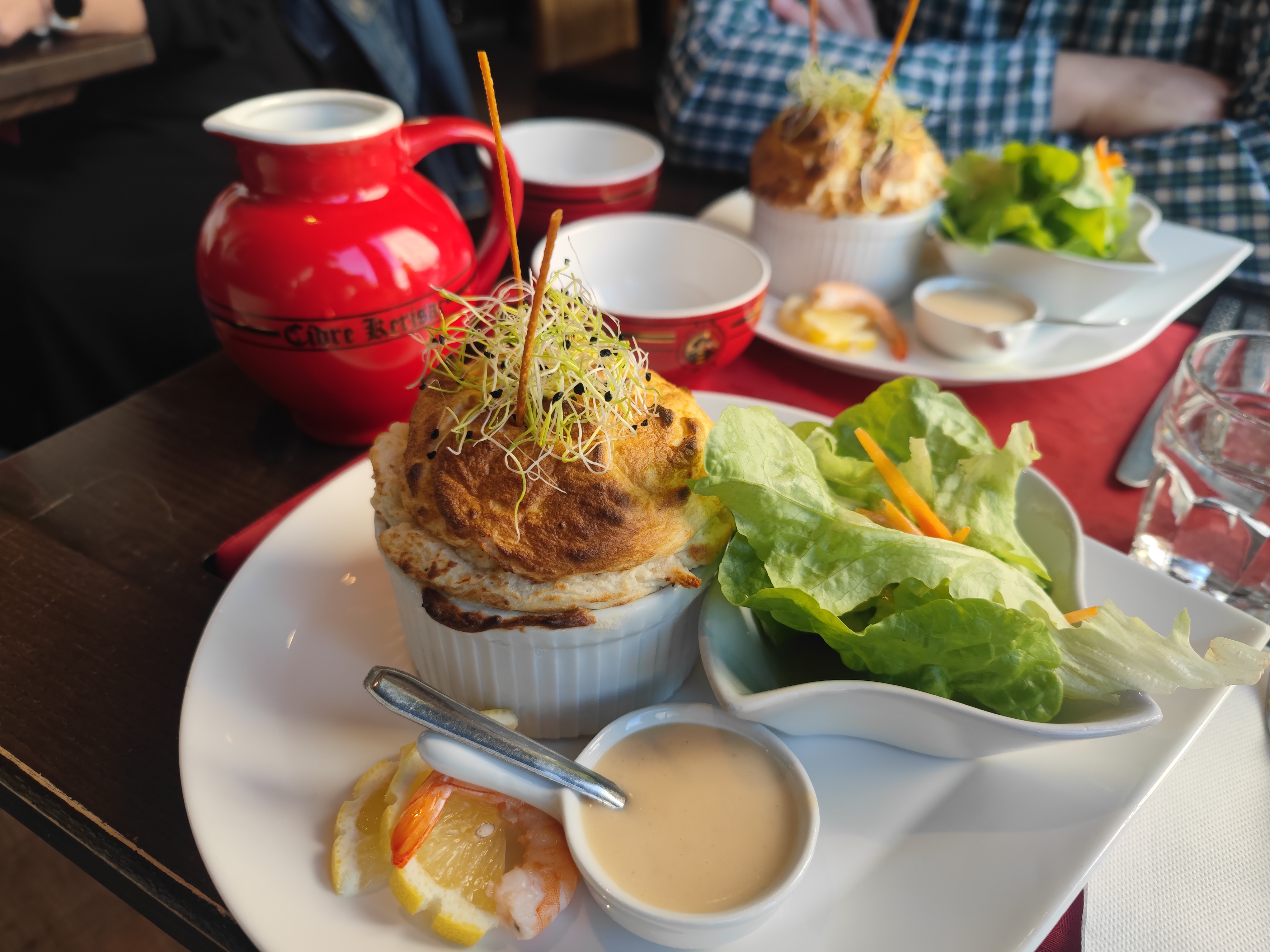 Les soufflés étaient excellents (boudin blanc et truffes en salé, pommes calvados pour le sucré) et le personnel très chaleureux, je recommande vivement !