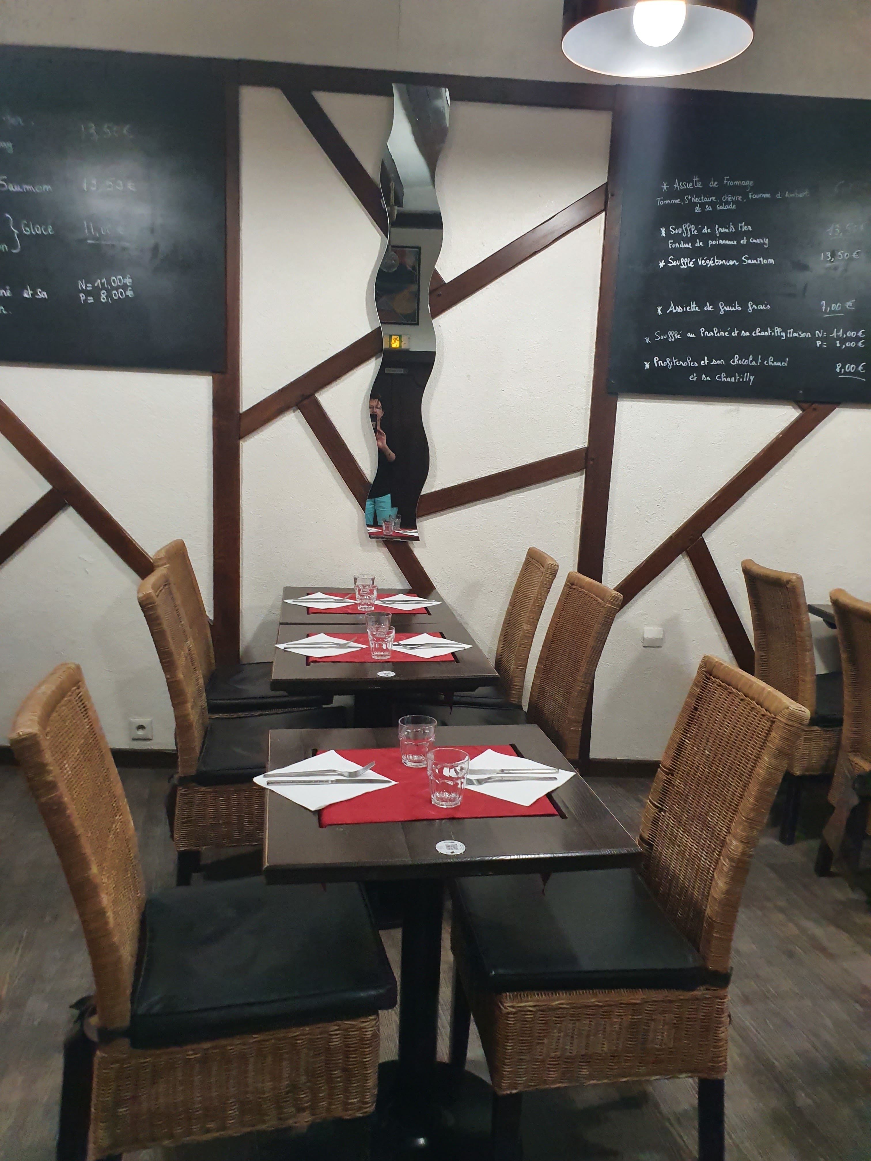 Déco vieillotte, il faisait très froid dû à une mauvaise isolation. Le soufflé était écoeurant, la galette pas bonne et servie tiède. Piètre qualité des ingrédients dans la galette (épinards en boîte). Même la salade accompagnatrice n'avait pas de goût. Nous ne reviendrons pas.