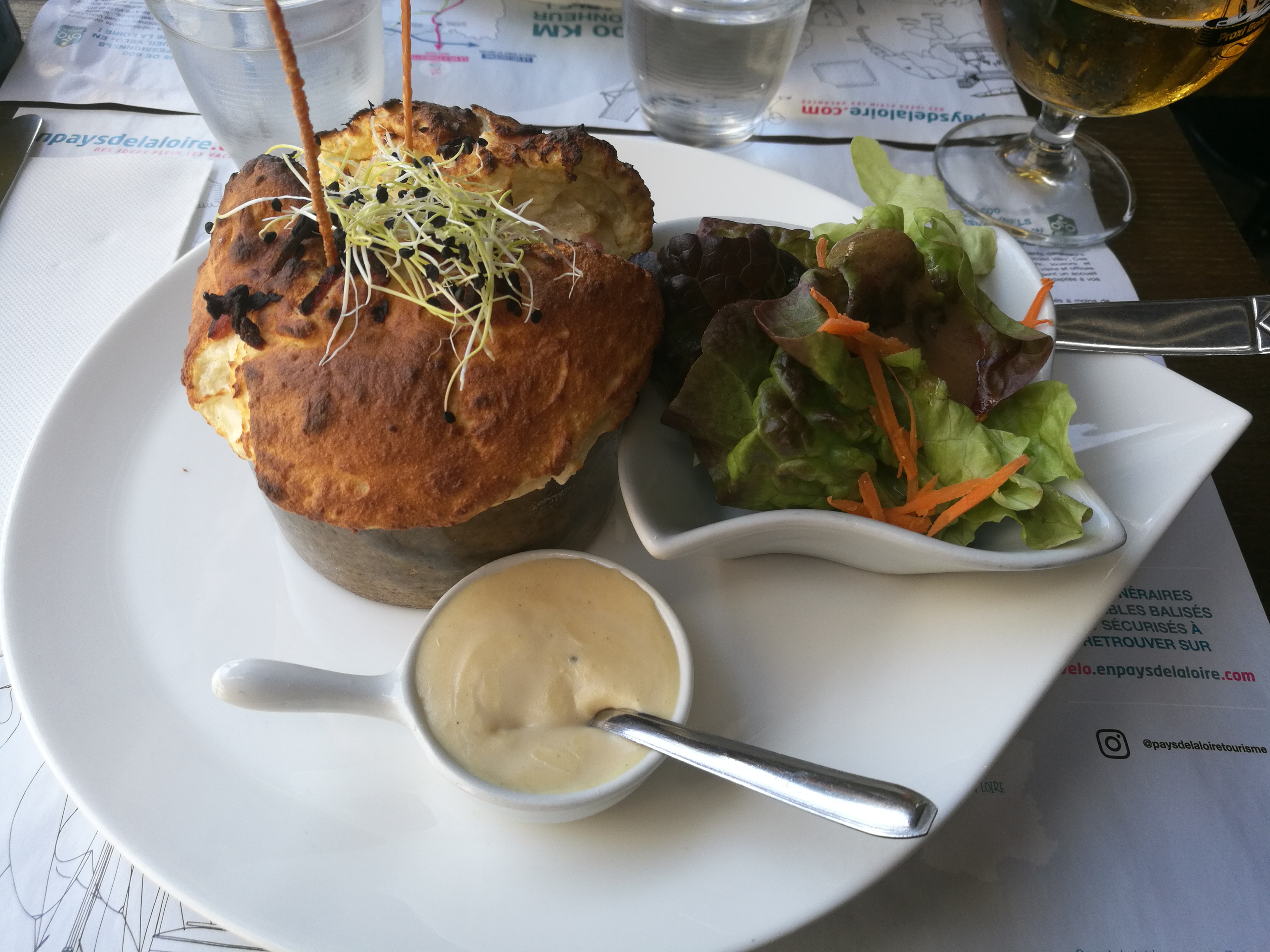Ne passez pas par Angers sans visiter ce lieu ! Des hôtes accueillants, situés au centre et certains des soufflés les plus impressionnants que vous ayez jamais vu ! Les salés sont accompagnés d'une salade. Si vous souhaitez un soufflé sucré en dessert, il faudra le commander dès le début (les hôtes l'expliquent). Les soufflés sucrés sont disponibles en 2 tailles, vous offrant plus d'options. Les réservations ne sont pas obligatoires, mais je le recommanderais surtout pendant les saisons chargées. L'un des hôtes parlait anglais, ce qui rendait la communication un peu plus facile.