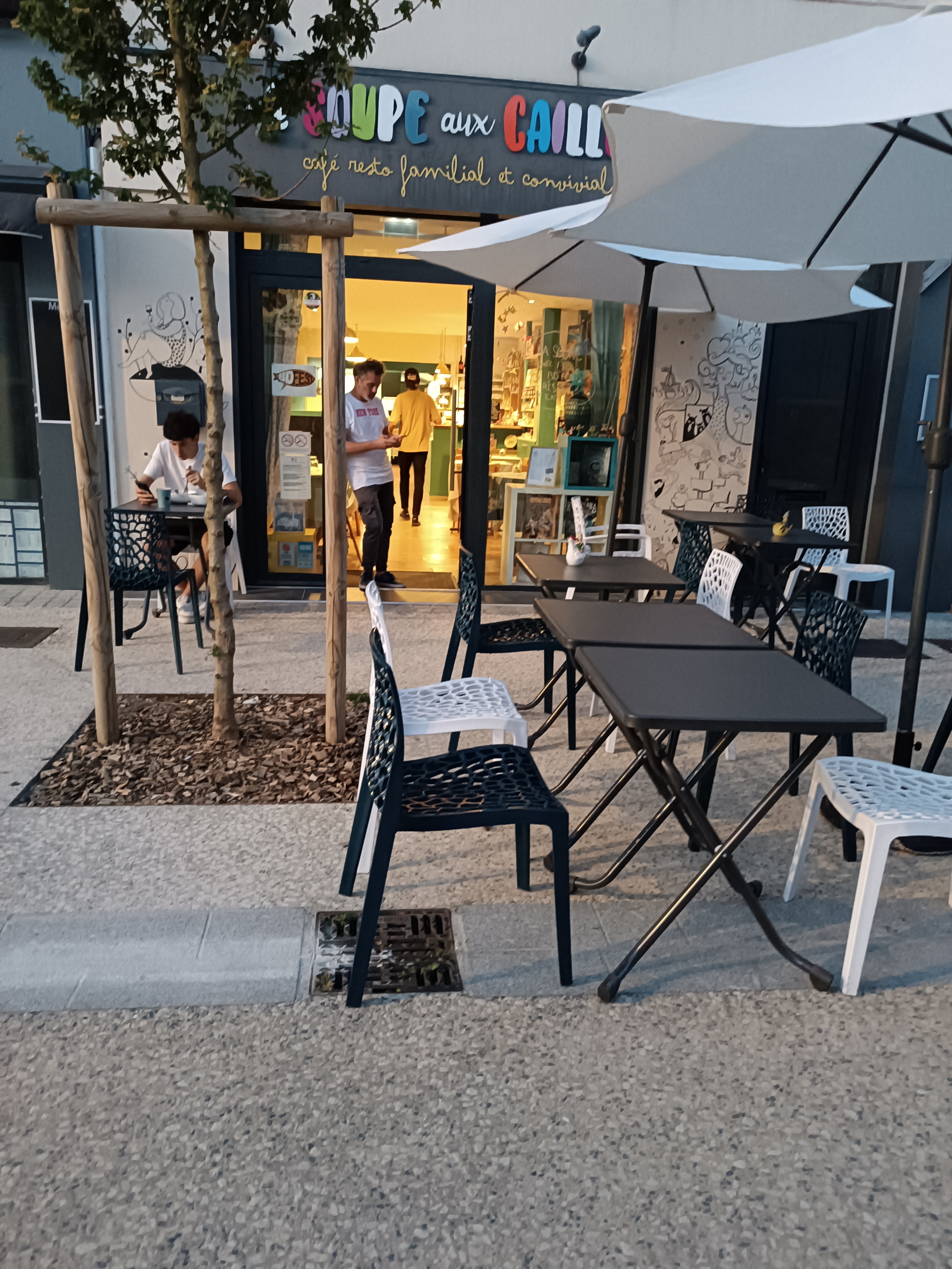 Cherchant un resto familial lors d'une balade à La Roche-sur-Yon, nous sommes tombés sur La Soupe aux Cailloux. Situé dans le quartier piétonnier, l'établissement est facile à trouver. La salle est lumineuse et décorée avec goût ; retour en enfance garanti. L'accueil est attentionné et courtois à défaut d'être jovial. Le service est rapide et sans faute. Côté assiette, c'est bien présenté, la cuisine est bonne (priorité aux ingrédients locaux), pour les grands comme pour les petits. Essayez donc la blonde Pale Ale de la brasserie Nautile : le patron me l'a bien vendue, ce fut une révélation. Ce qui fait l'intérêt de l'établissement avant tout est que les parents peuvent y emmener leur progéniture sans culpabiliser à cause des bruits et cris. Car les petits ont leur coin jeu ; en revanche, les en décoller pour les faire manger à table est une autre histoire. La Soupe aux Cailloux, c'est un bon moment en toute simplicité qui permet aux parents de profiter d'une sortie resto dans une atmosphère décomplexée.