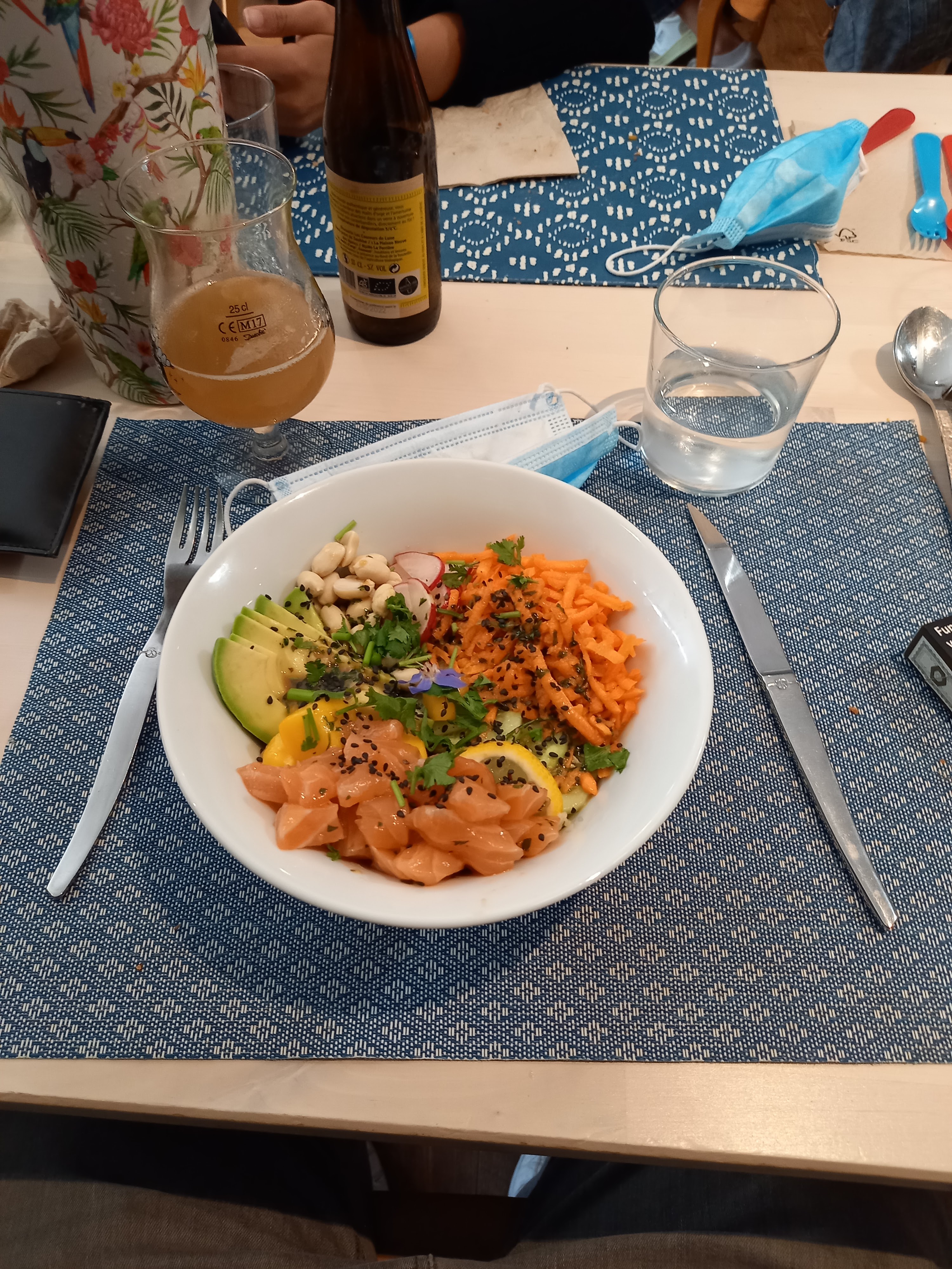 Décoration colorée et atypique, équipe adorable et cuisinier qui a parfaitement su adapter ma commande à mon régime alimentaire. Cerise sur le gâteau : C'était super sain et super bon ! Je recommande 👌🏻
