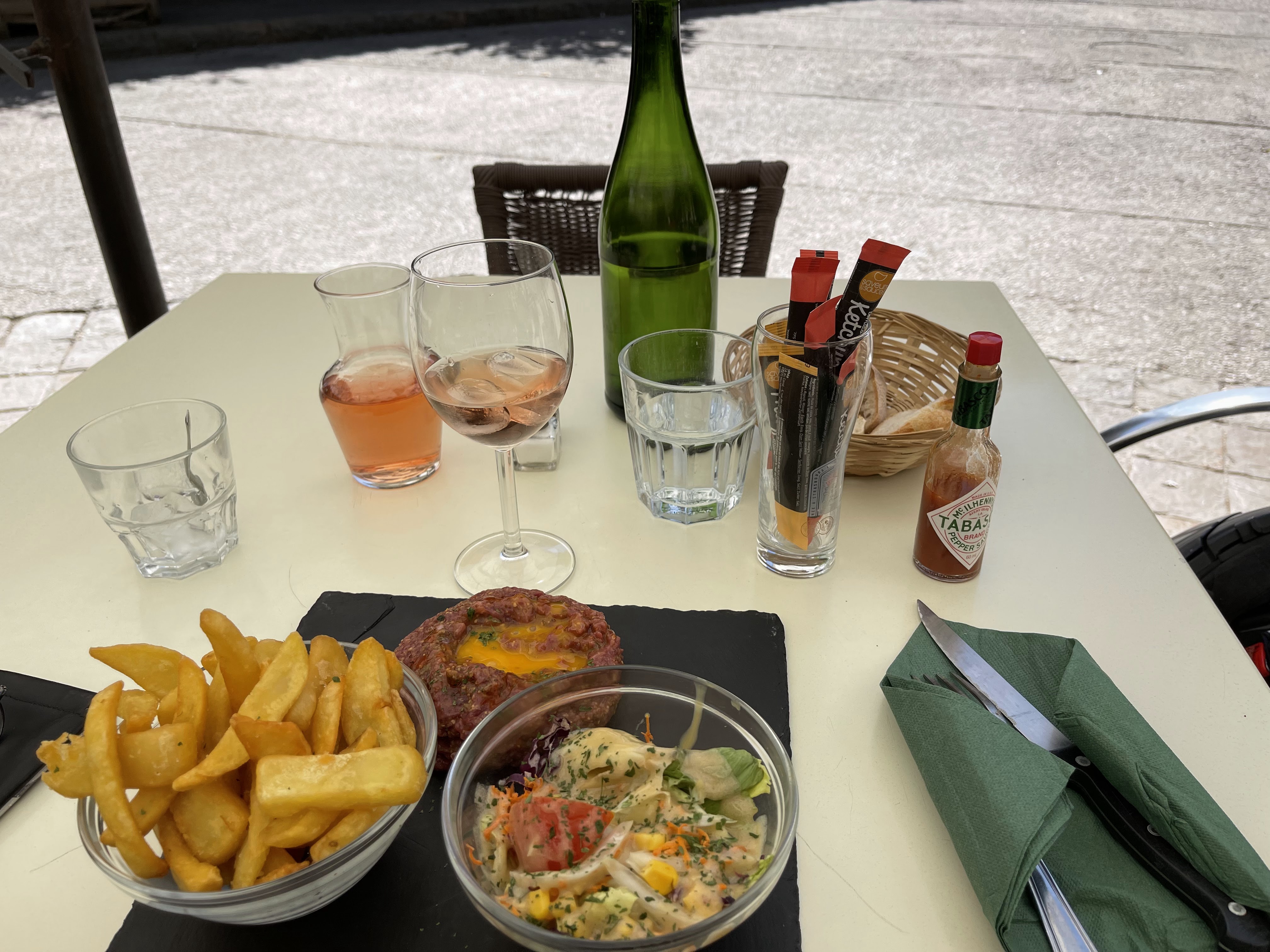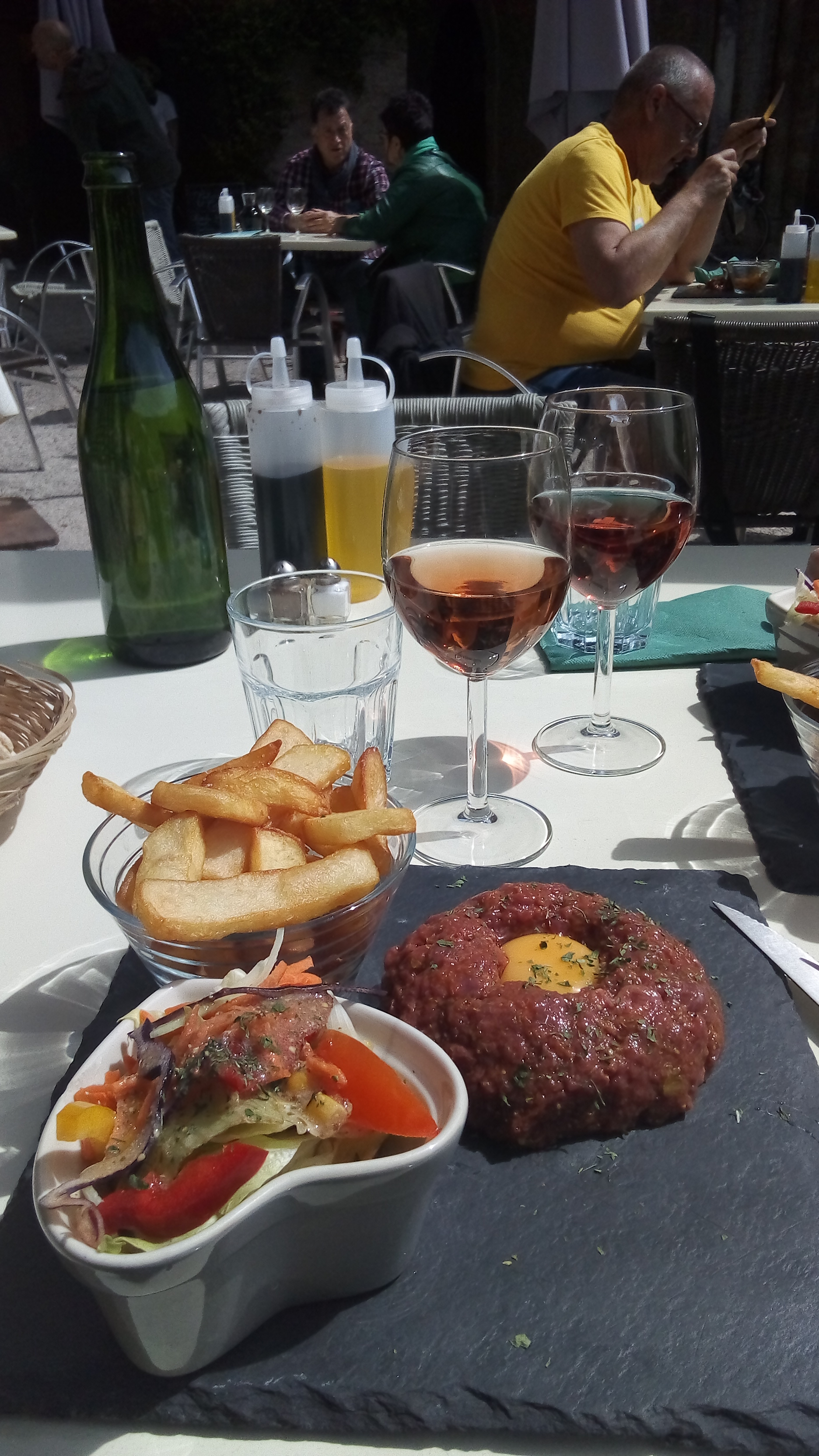 Nous avons mangé sur la place du village, un menu tartare de viande tout compris (salade, pommes de terre, boisson et dessert) pour 21 €. Très bien préparé et bon service. Nous le recommandons !!