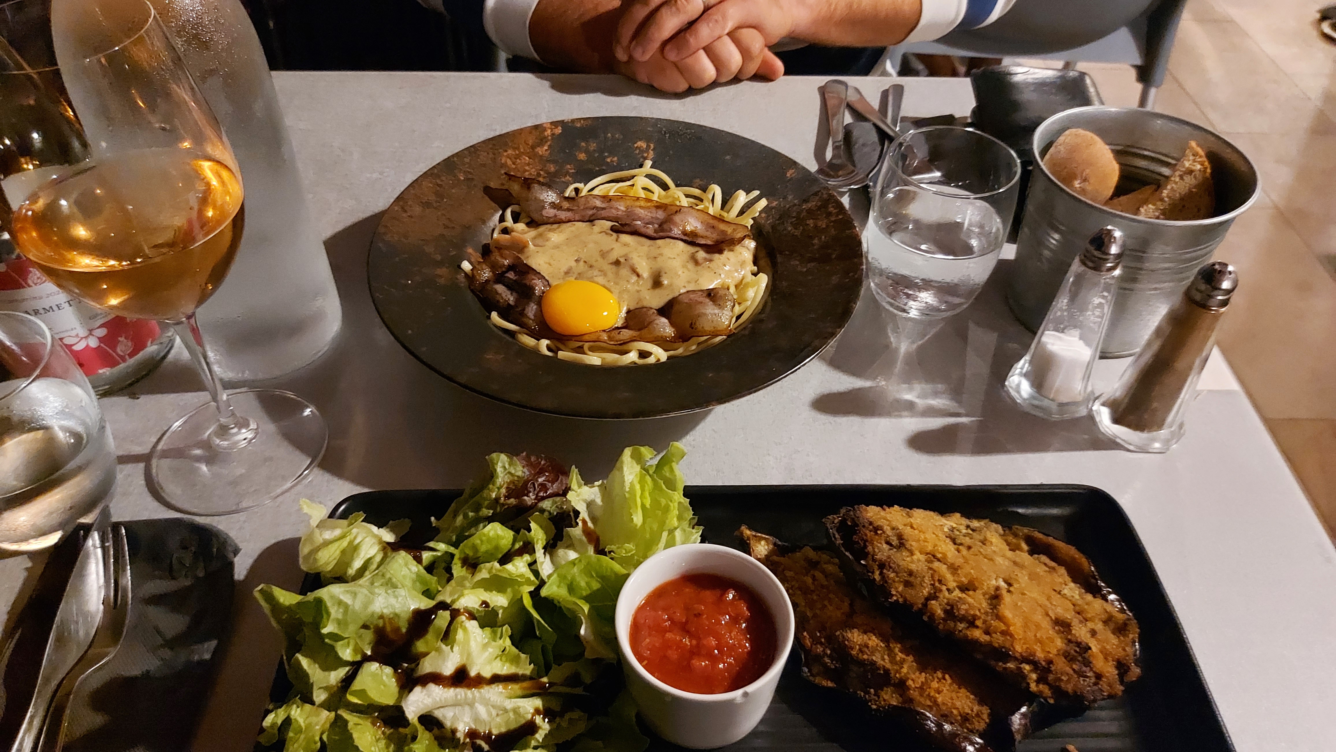 Très bon dîner dommage qu il faisait frais sur la terrasse côté N.O J ai pris des pâtes carbonara les meilleurs que j ai mangé de ma vie.et en dessert vous savez les trucs aux chocolats un régal.bref tout bon repas Avec un bon service et un excellent rosé je reviendrai en Corse nous qui sommes LANDAIS.