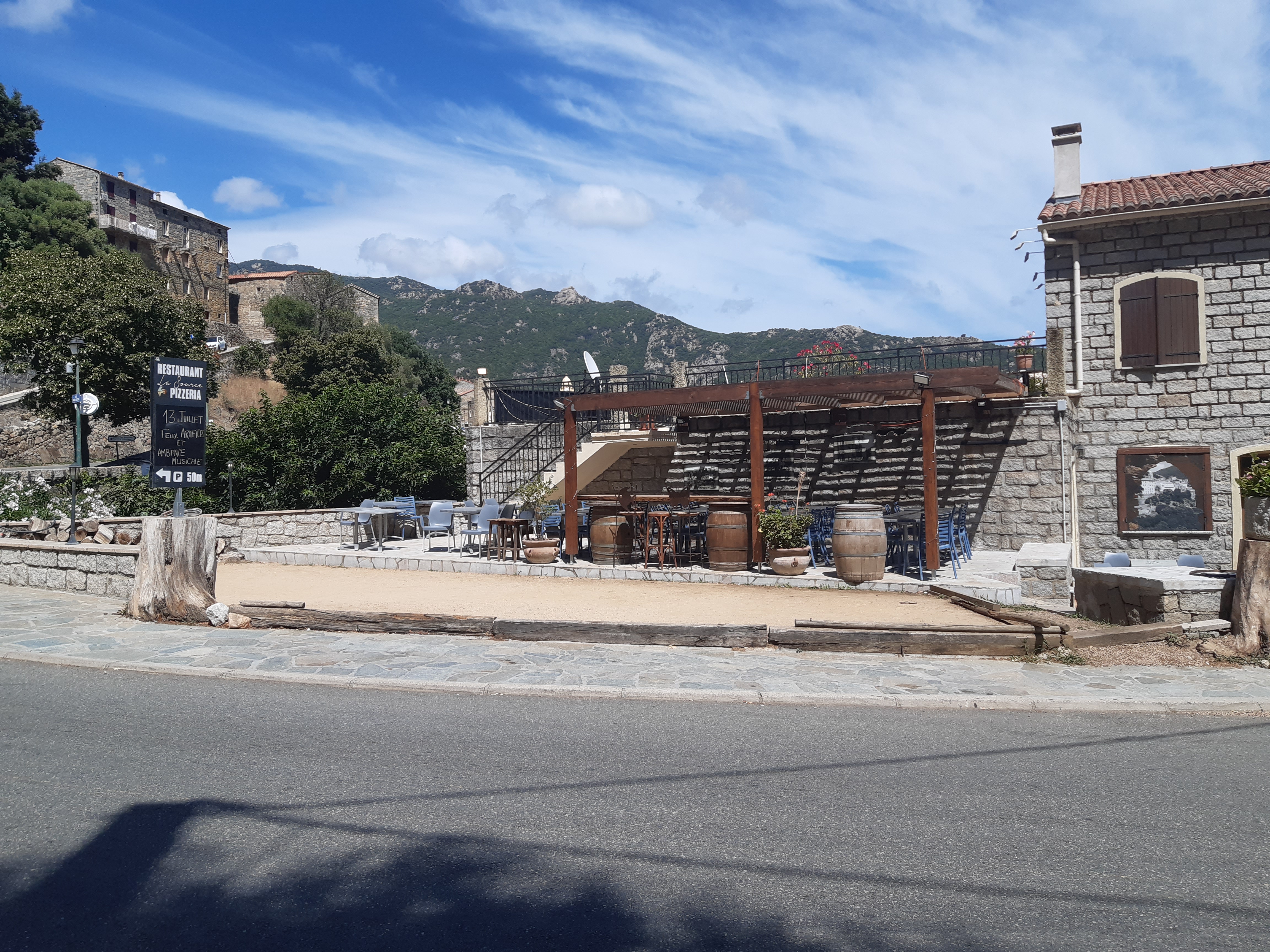 Au coeur du village, bar, restaurant. Nous avons fait une pause en terrasse pour déguster une bière. Un lieux de rencontre des villageois, il suffit de tendre l oreille et apprécier l accent Corse, les discussions. Théâtrale...J adore 😁