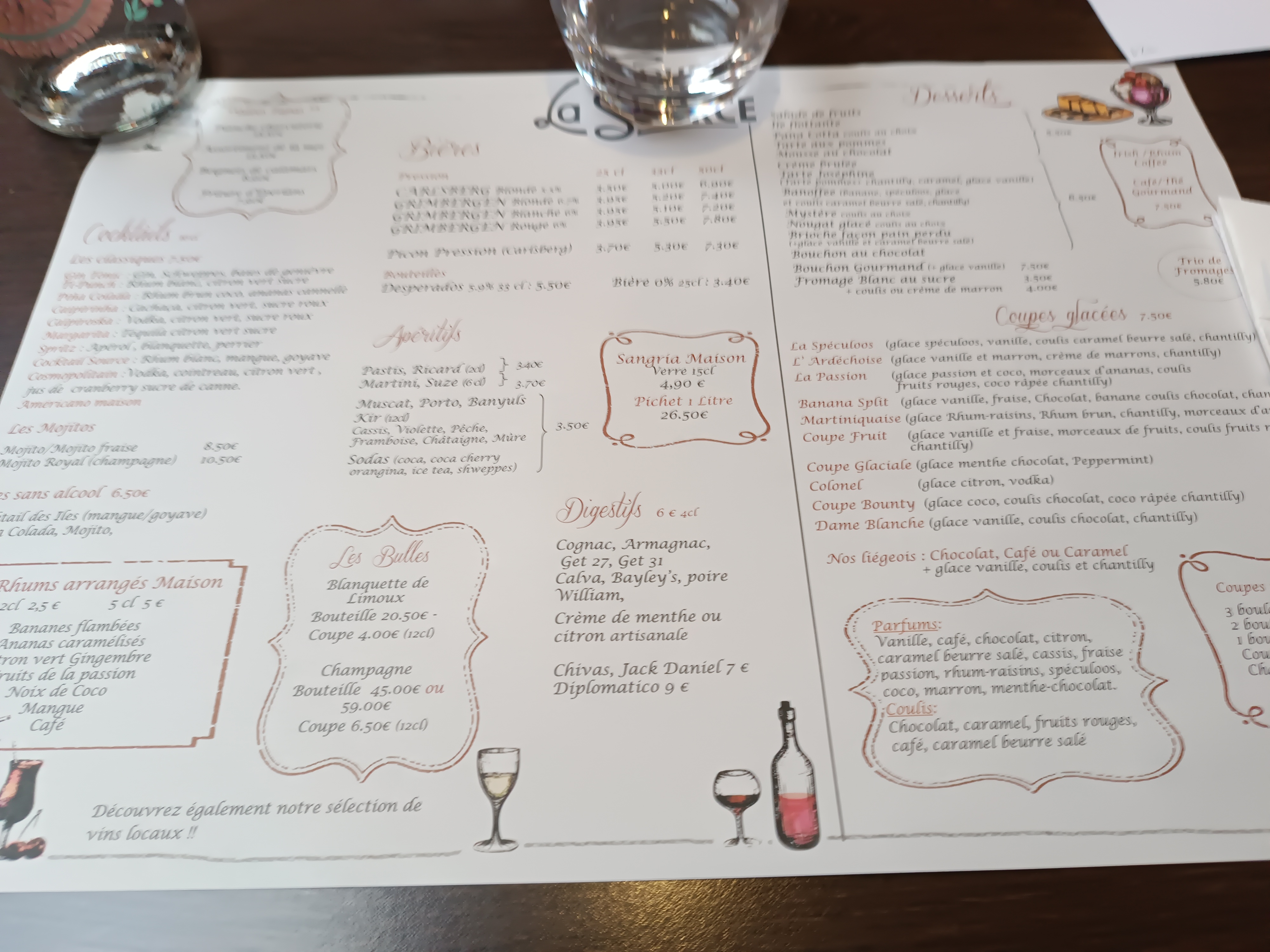 Bon accueil, service de qualité, cuisine très correcte, bon rapport qualité prix, de plus, le cadre est très agréable. Une bonne expérience ! Toujours aussi bien servi avec le sourire ! Encore bien accueilli, qualité de cuisine moindre, prix plus élevé ?? Passé une bonne soirée, bien mangé dans une bonne ambiance, à refaire ! Tjrs aussi bien accueilli et servi, cuisine de qualité moins copieuse Par contre sangria a éviter une fois les glaçons enlevé, verre à moitié et goût discutable (voir photo)