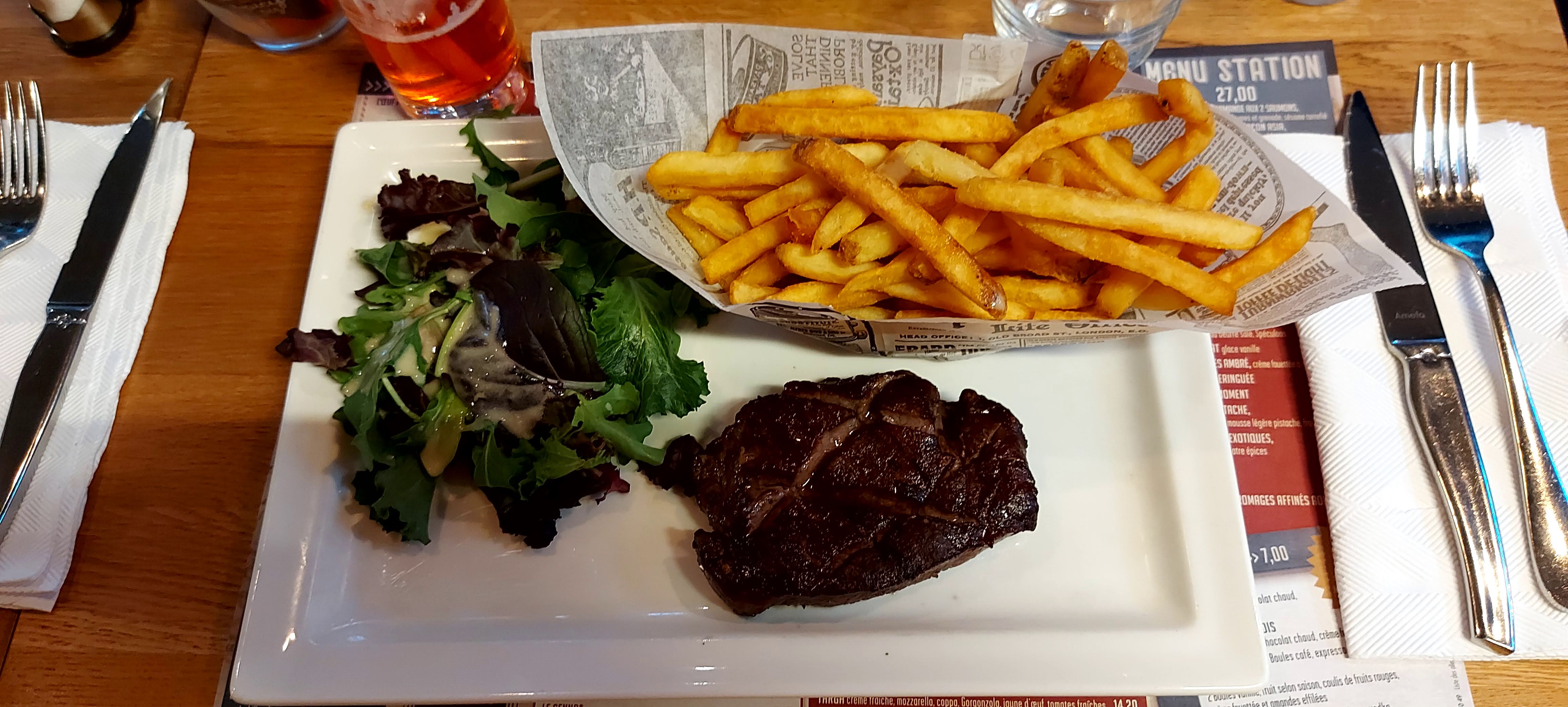 Bon accueil, plateau d'apero plus que léger pour 10e, une côte de boeuf de 350-400grs qui doit plus faire 300 grs avec l'os ^^ demandée à point, livré saignant.... Et 24e.... Frites de qualité médiocre... Je ne reviendrait pas