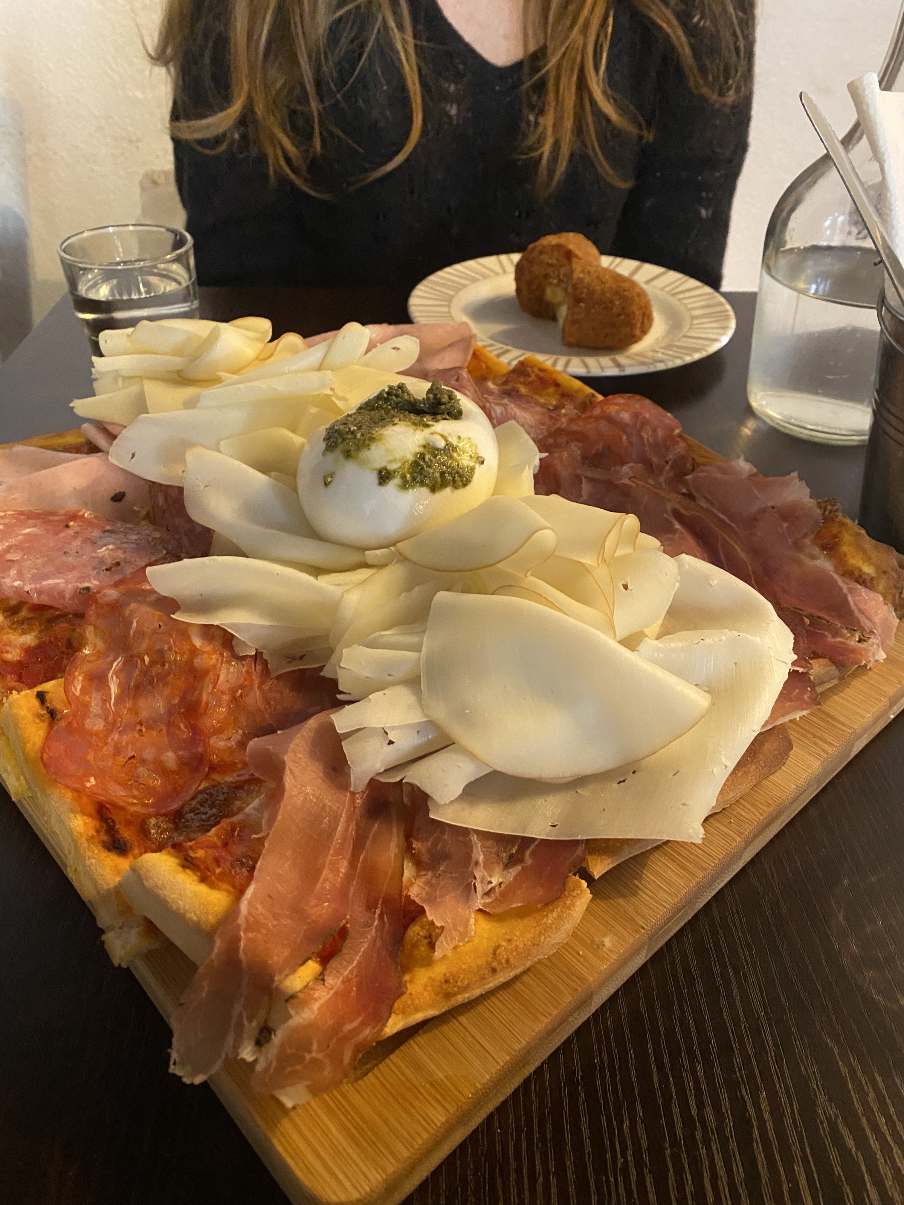 Wow, les portions sont tellement grandes ! Nous avons commandé les 11,5 e de pâtes aux tomates et à la basilique et avons été étonnés de la taille, suffisante pour deux personnes ! Bonne nourriture et bonne ambiance! Nous avons également mangé une part de pizza margarita, un peu ringarde à mon goût mais mon copain a beaucoup apprécié ! (il y avait des arancini et des suppli pour notre voyage en bus plus tard)