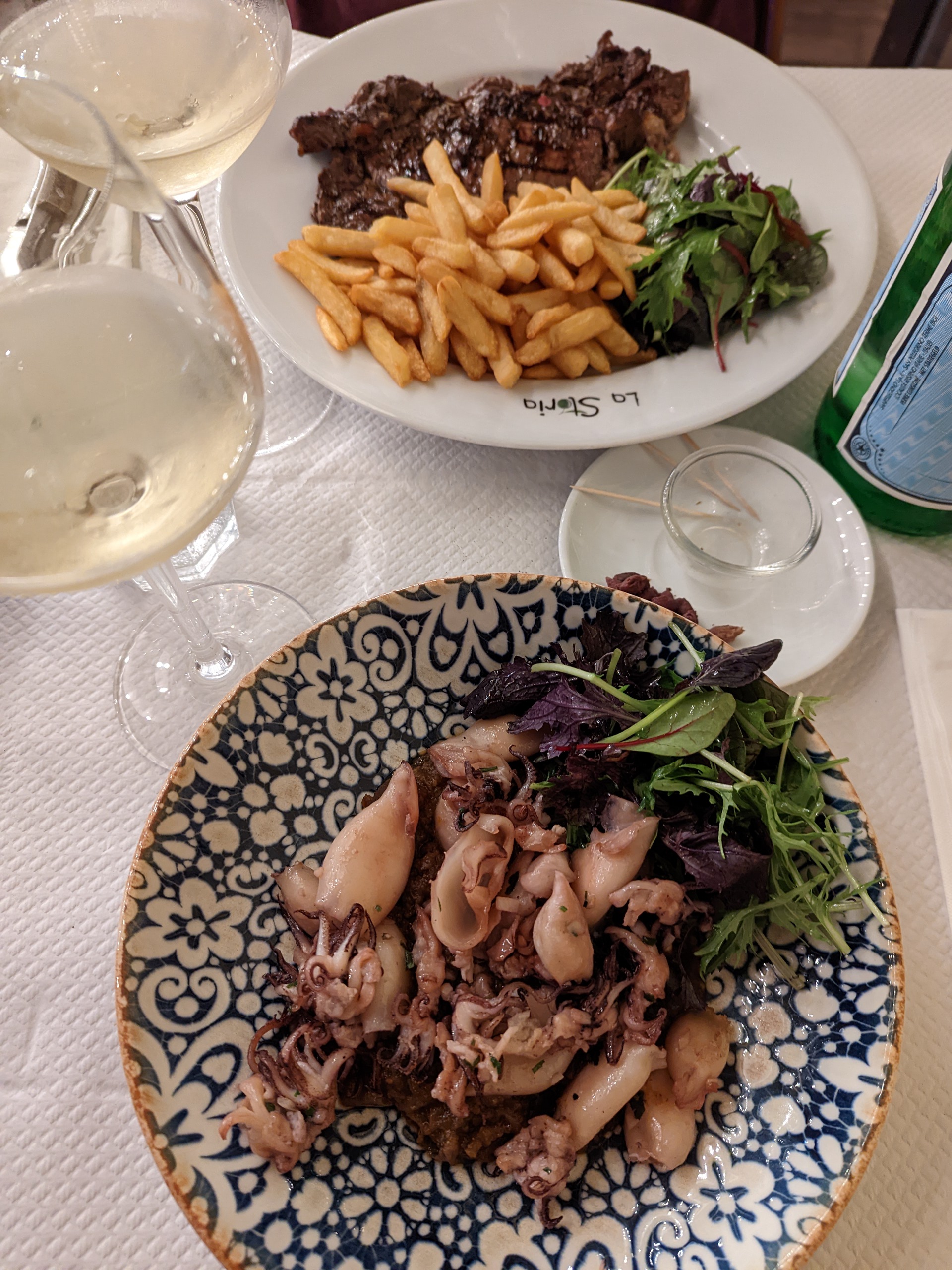 Nous sommes tombés sur ce restaurant par hasard et c’était une super découverte : 👍🏻 Cadre. Grande terrasse découverte avec beaucoup de lumière - sympa et pratique le soir par rapport aux autres endroits un peu sombres dans le coin 👍🏻 Personnel. Les 3 serveurs à qui on avait affaire lors du repas était très réactifs, prévenants et cool avec notre enfant 👍🏻 Cuisine. Les plats au top! La soupe de poisson classique avec une sauce originale, la daube au gnocchi que mon compagnon a apprécié et surtout les calamars avec des artichauts et des petites patates à l’ail que j’ai trouvé vraiment DÉLICIEUX! Je n’espérais pas trouver quelque chose d’exceptionnel dans un endroit aussi touristique et finalement c’était une excellente surprise et une très bonne soirée passée en famille. Merci!