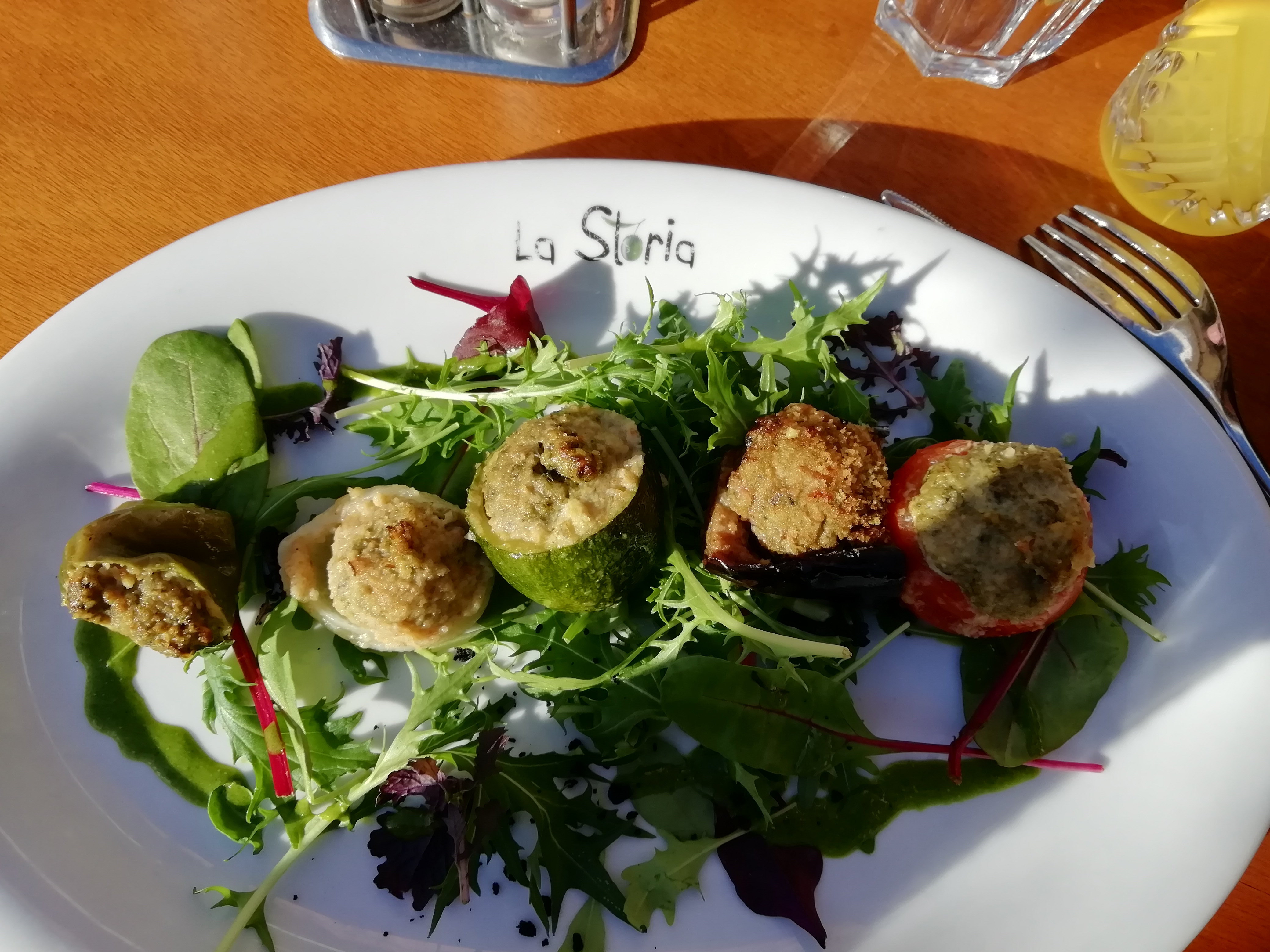 Déjeuner en terrasse au soleil, service sympathique et souriant, plats traditionnels niçois, calamars et petits farcis, de bonne facture